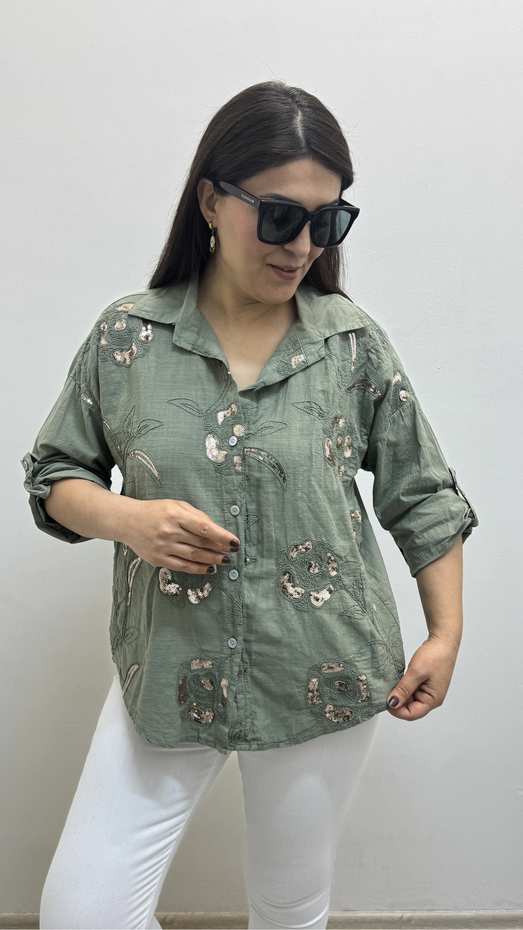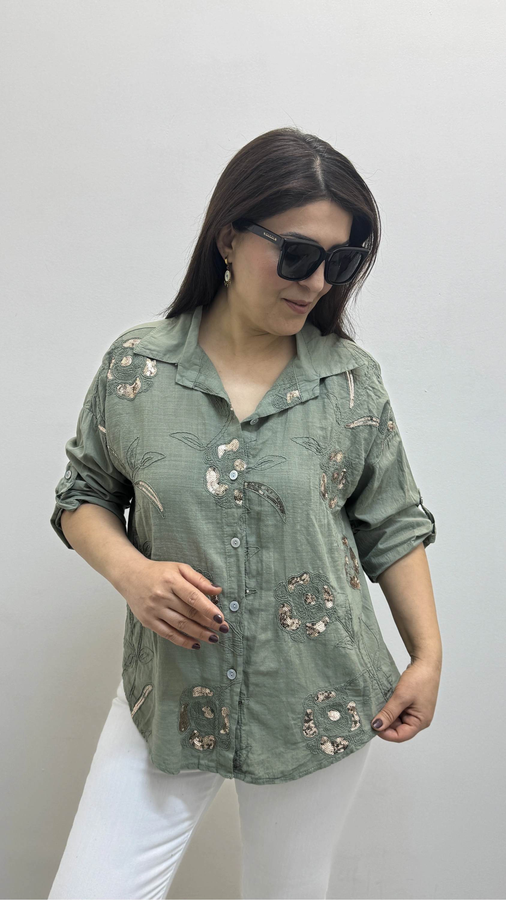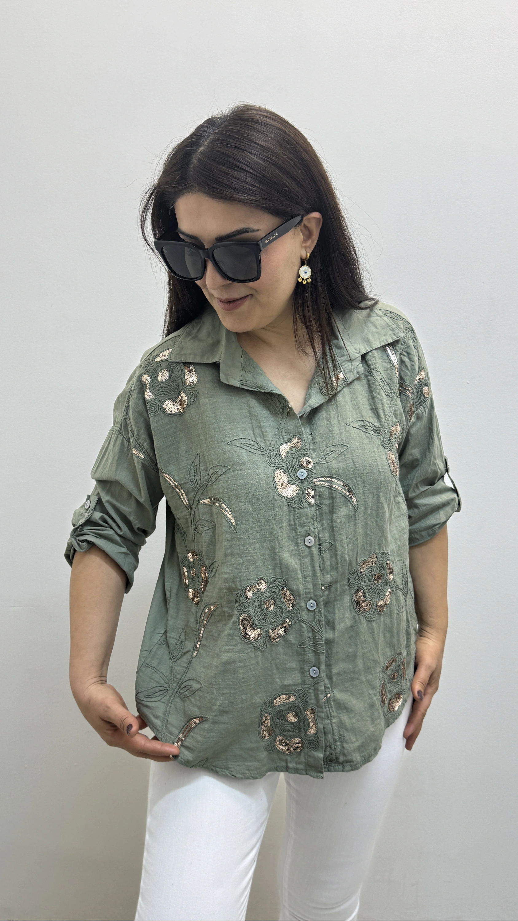 Çiçek Desenli Pul Payet İşlemeli Haki Yeşil İthal Gömlek Hakkında
