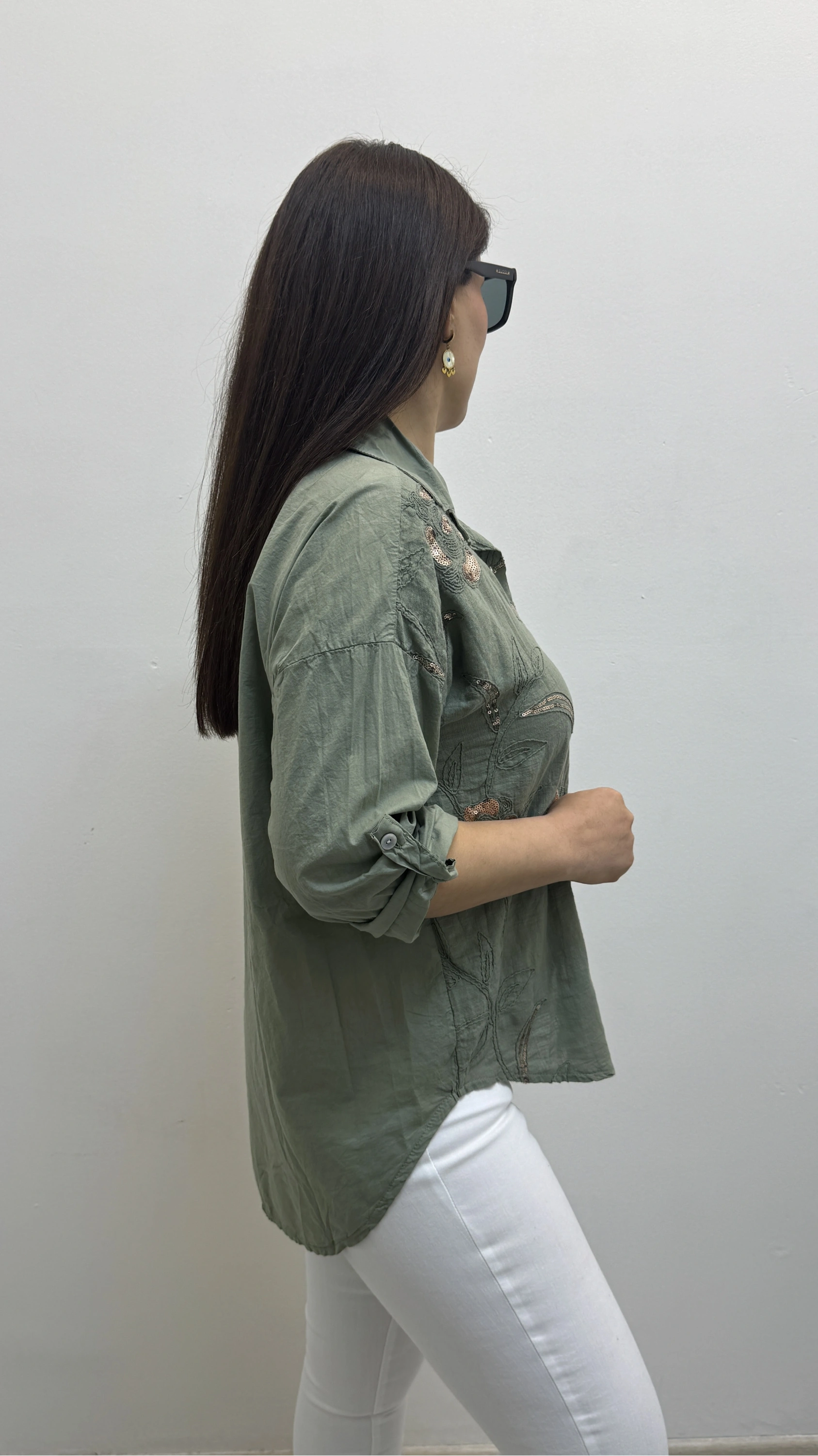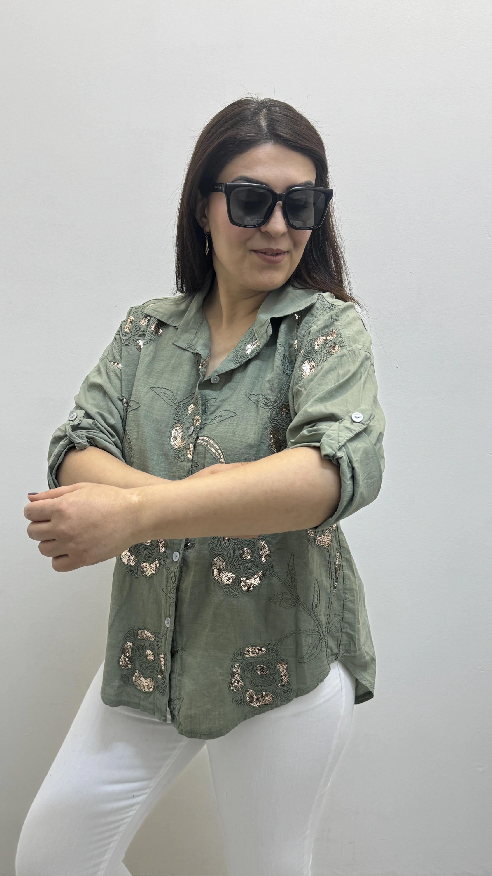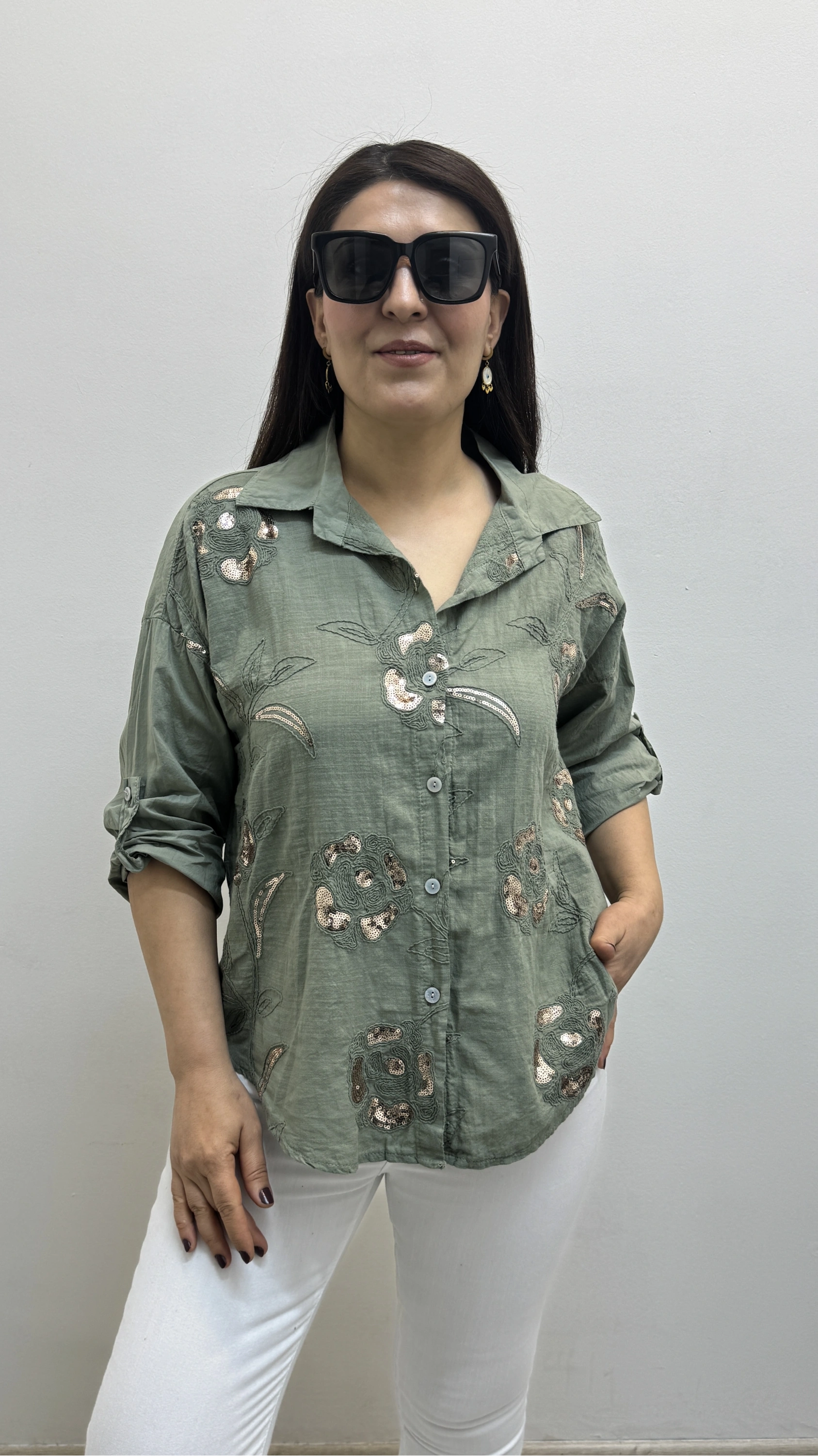 Çiçek Desenli Pul Payet İşlemeli Haki Yeşil İthal Gömlek