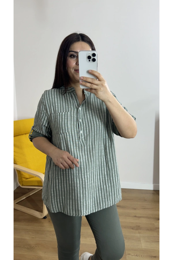 Çizgili Haki Yeşil İthal Bluz