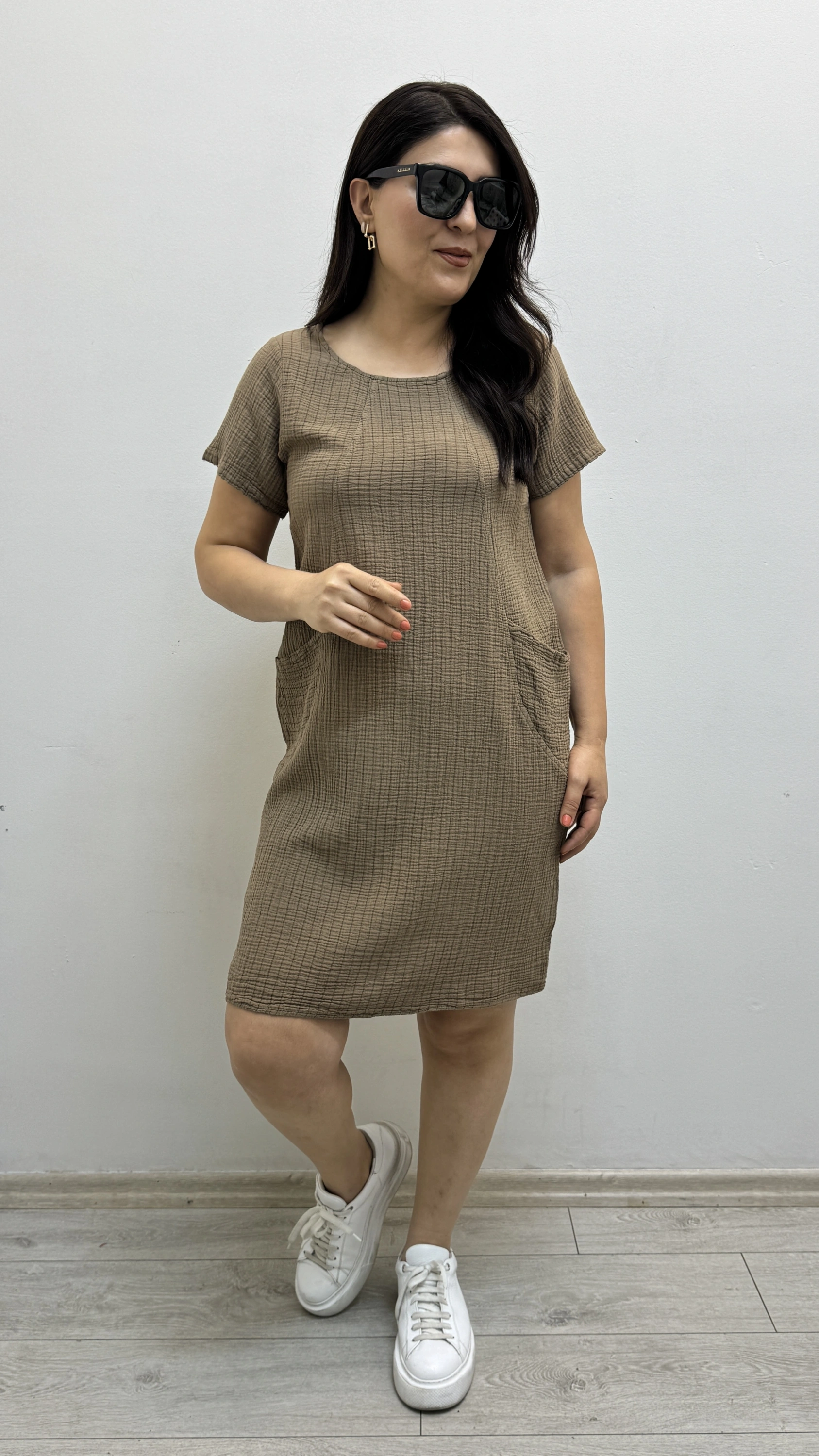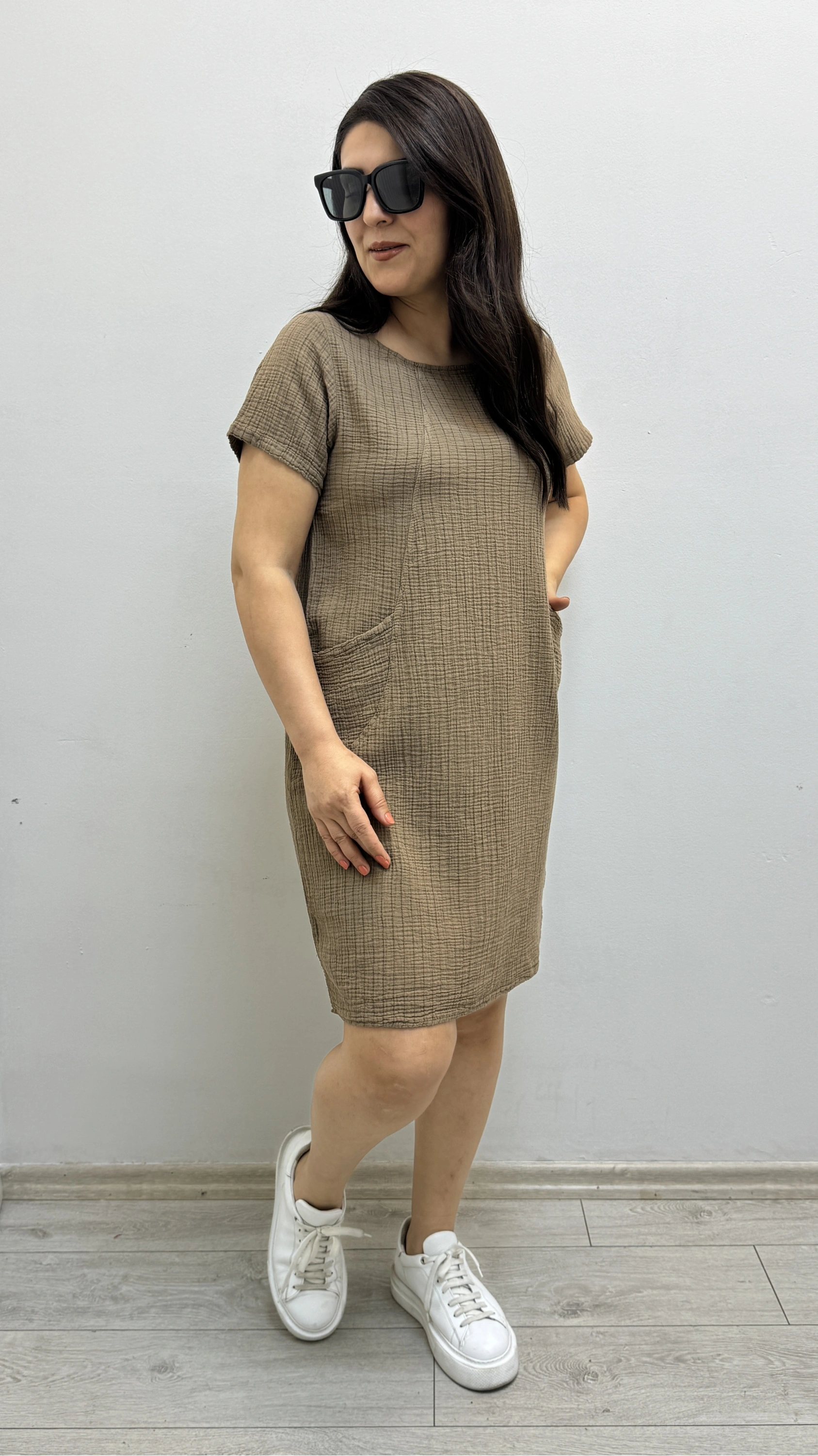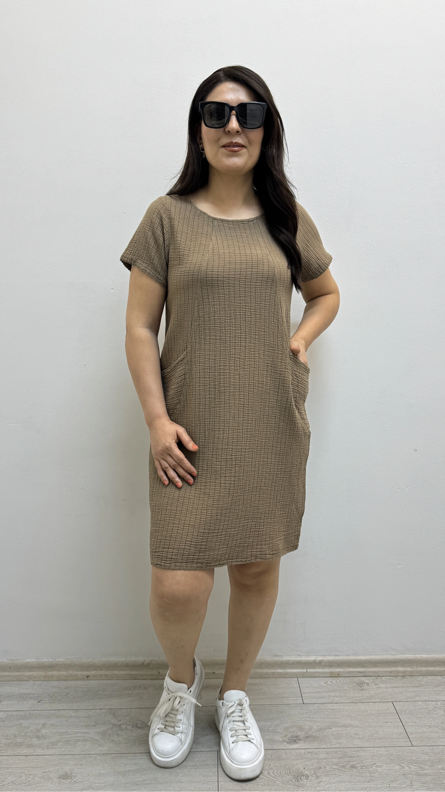 Çizgili İki Yandan Cepli Kısa Kol Kahverengi Pamuklu Elbise Hakkında