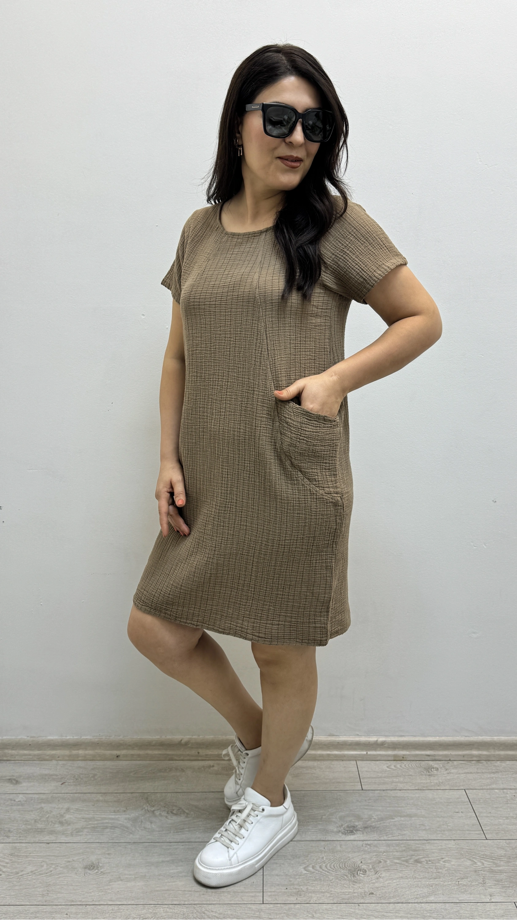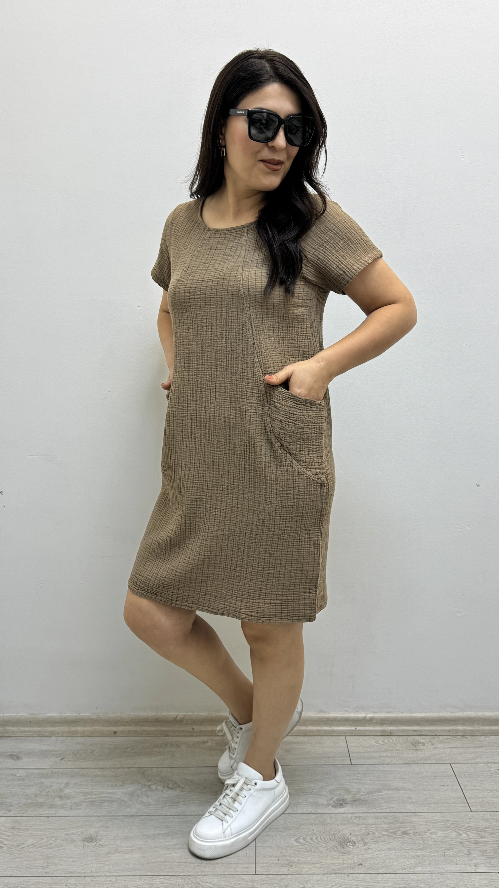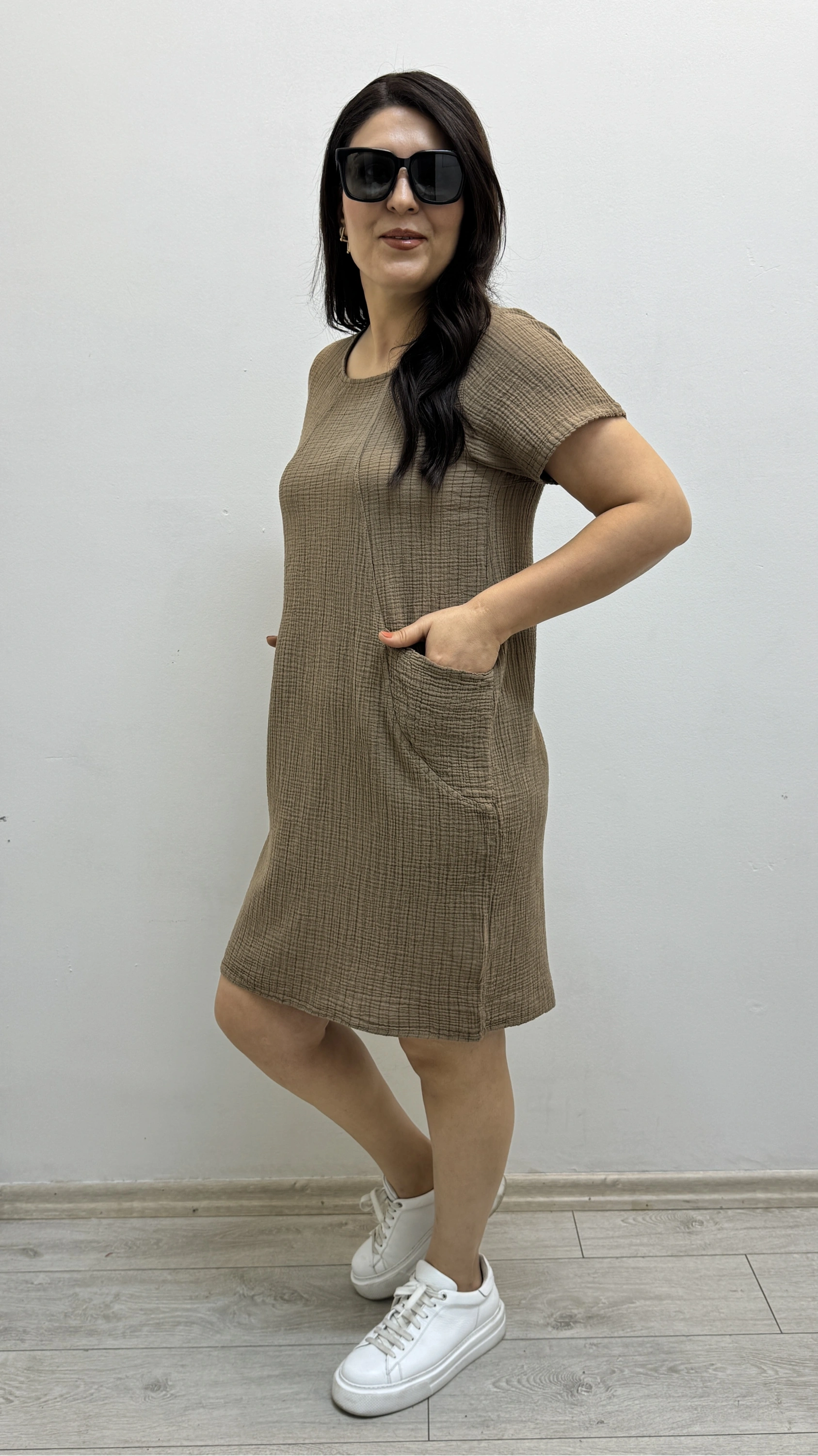 Çizgili İki Yandan Cepli Kısa Kol Kahverengi Pamuklu Elbise Hakkında