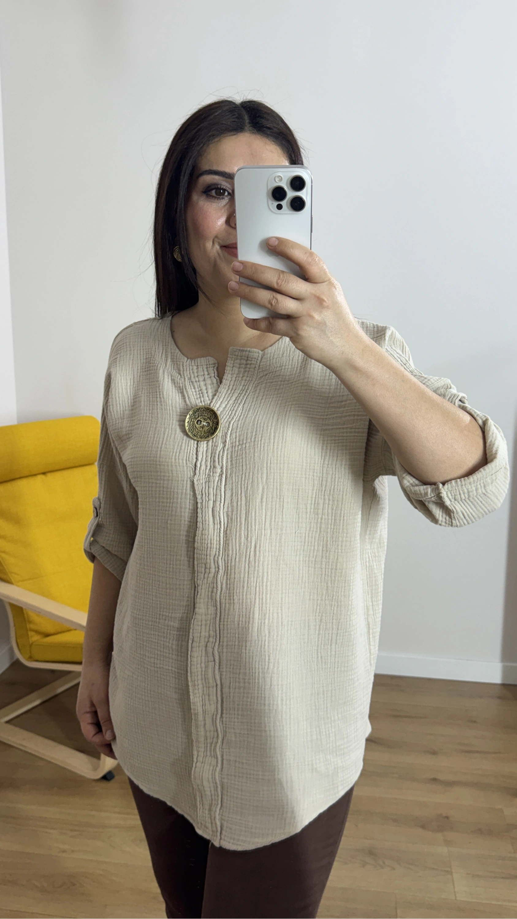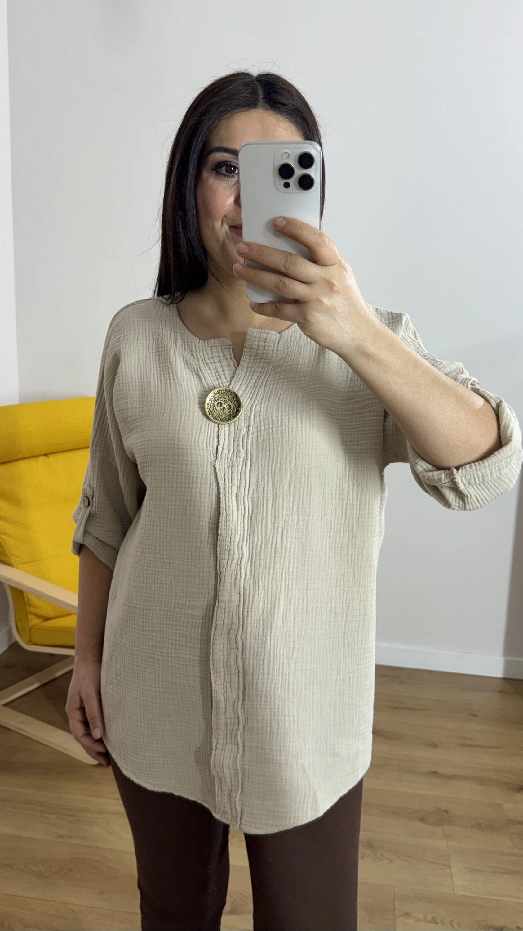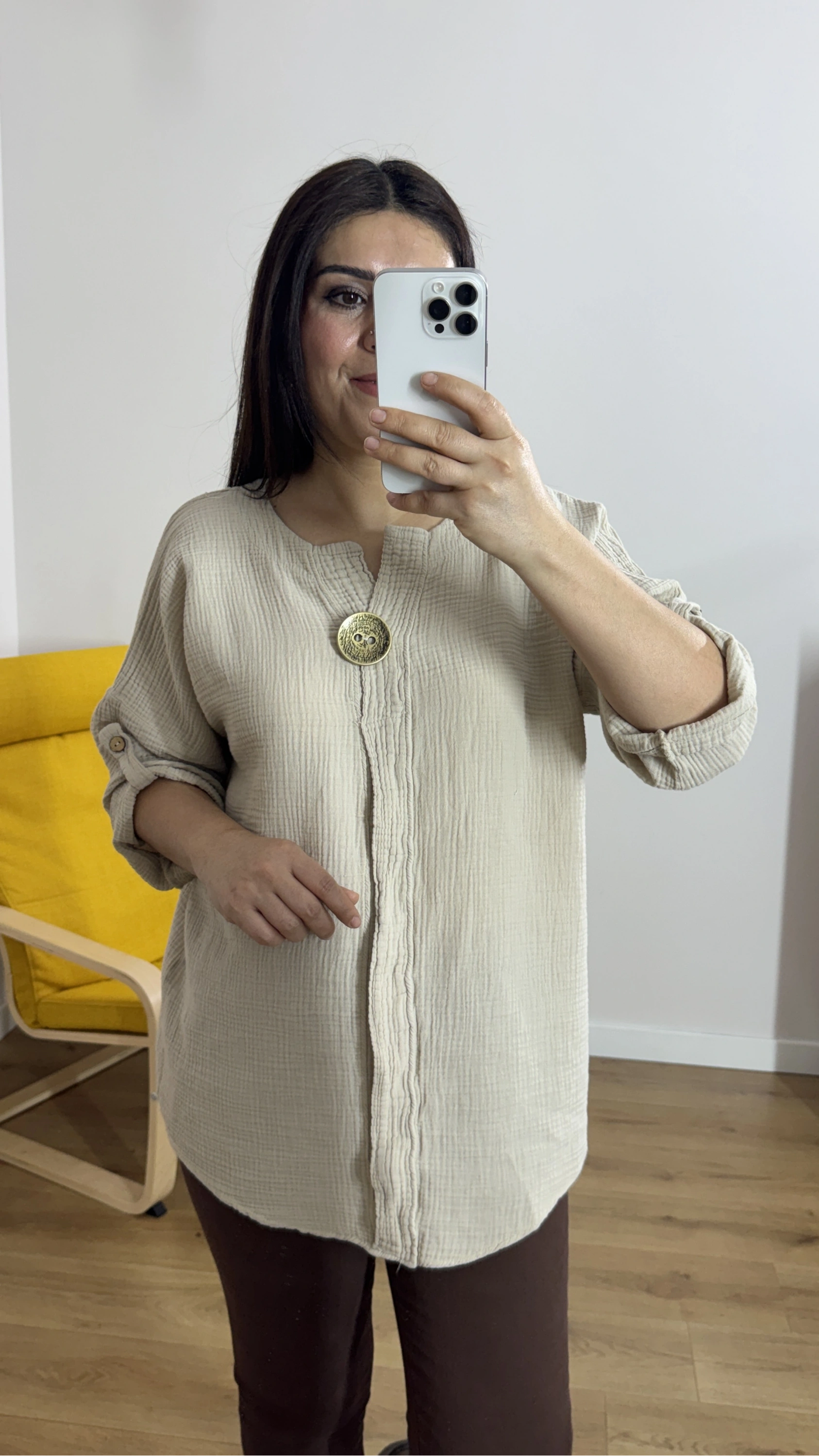 Dirsek Kol Bej Rengi Müslin Bluz Hakkında