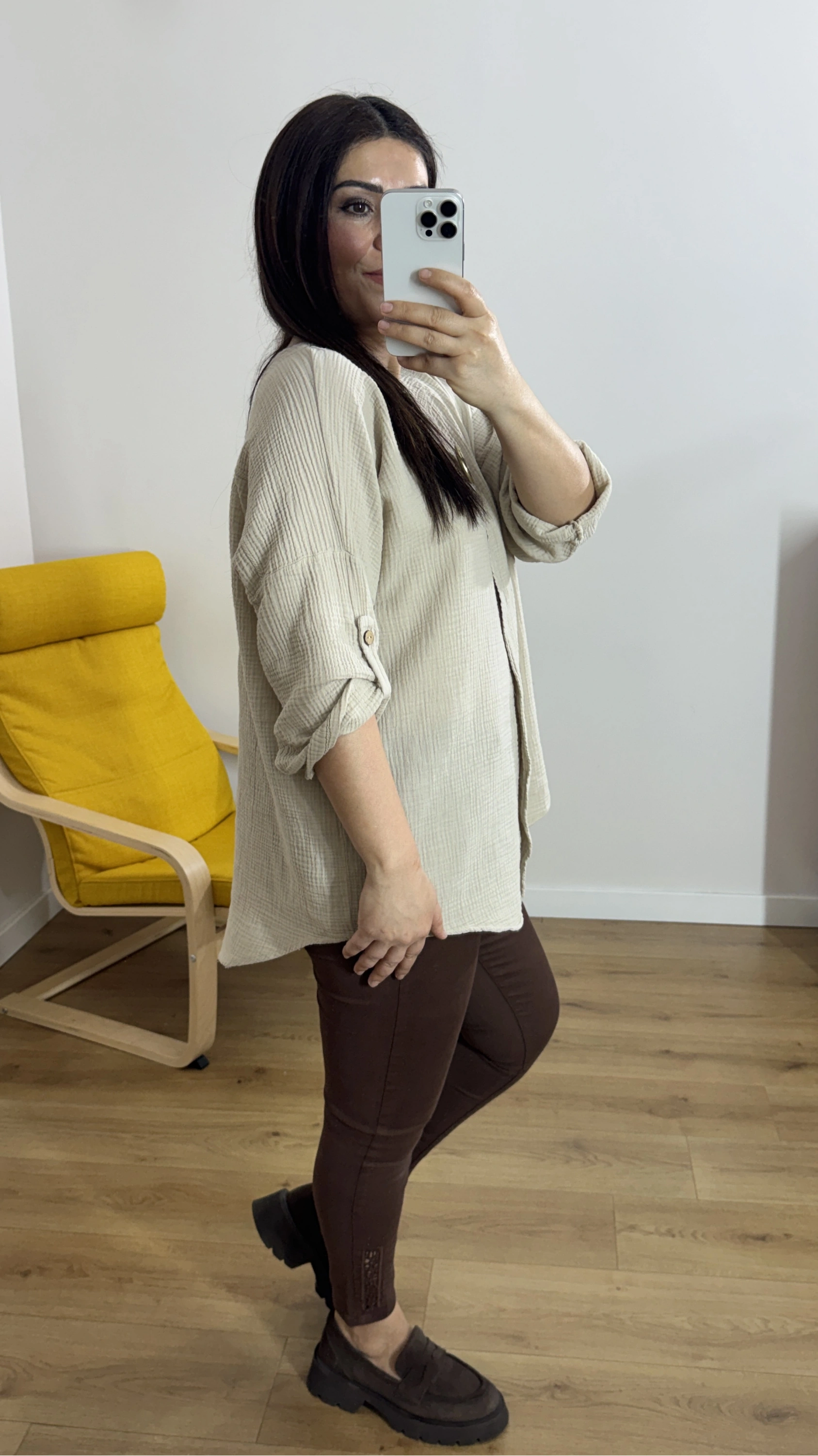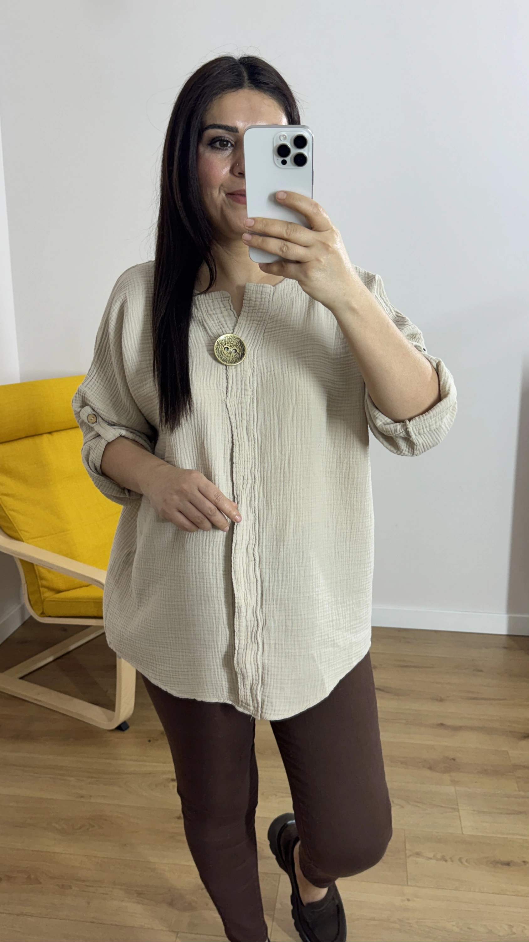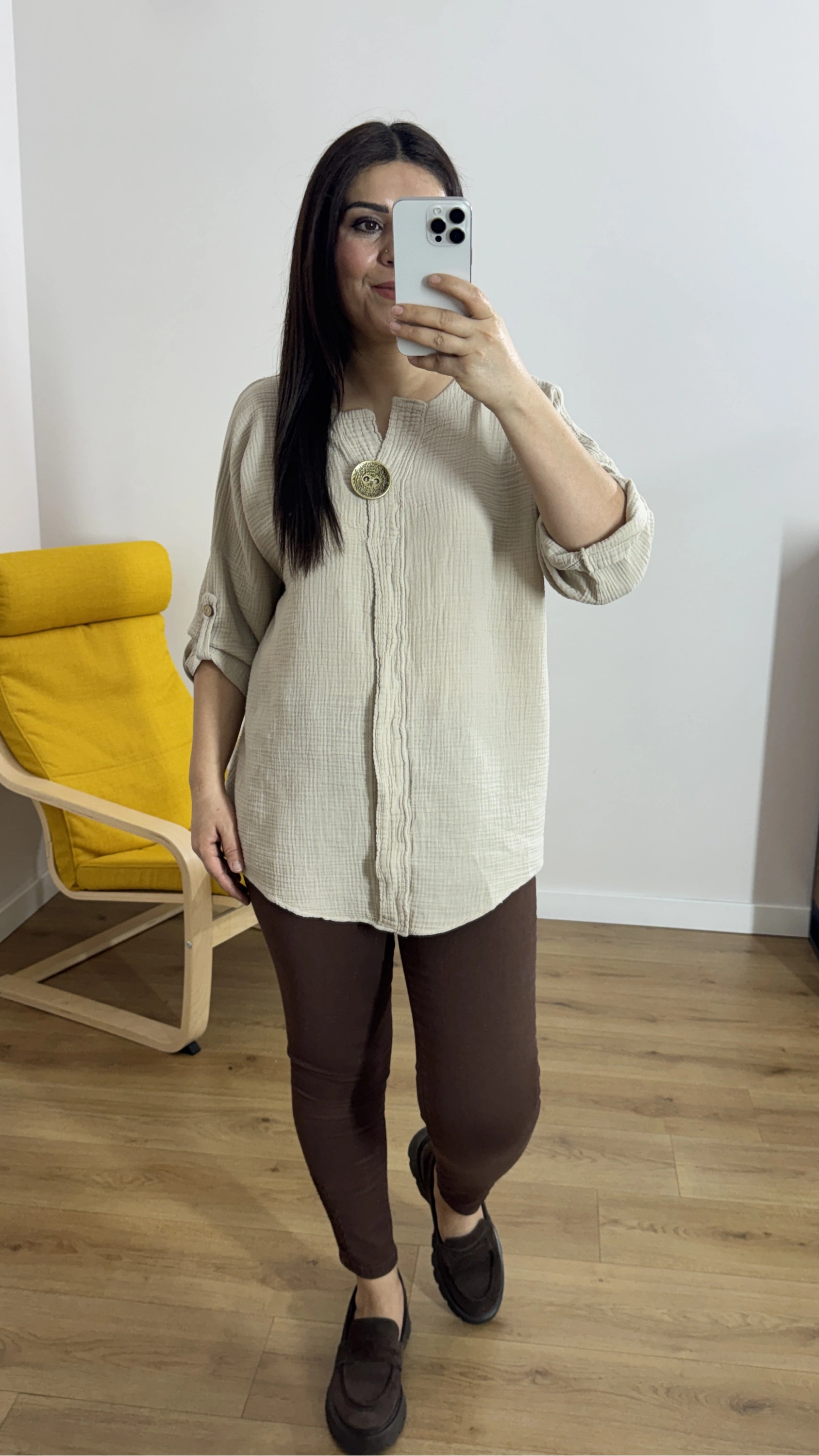 Dirsek Kol Bej Rengi Müslin Bluz Hakkında