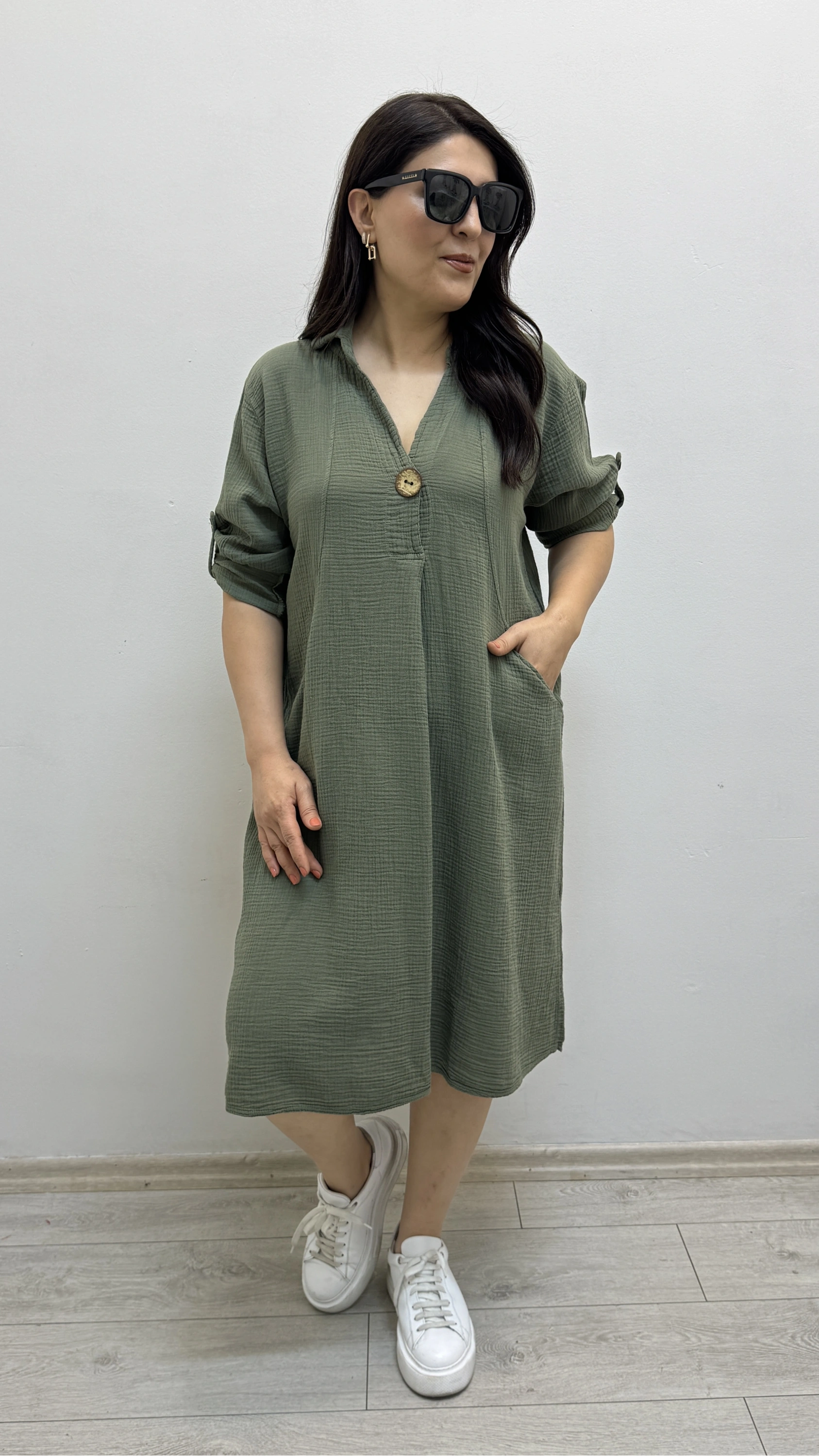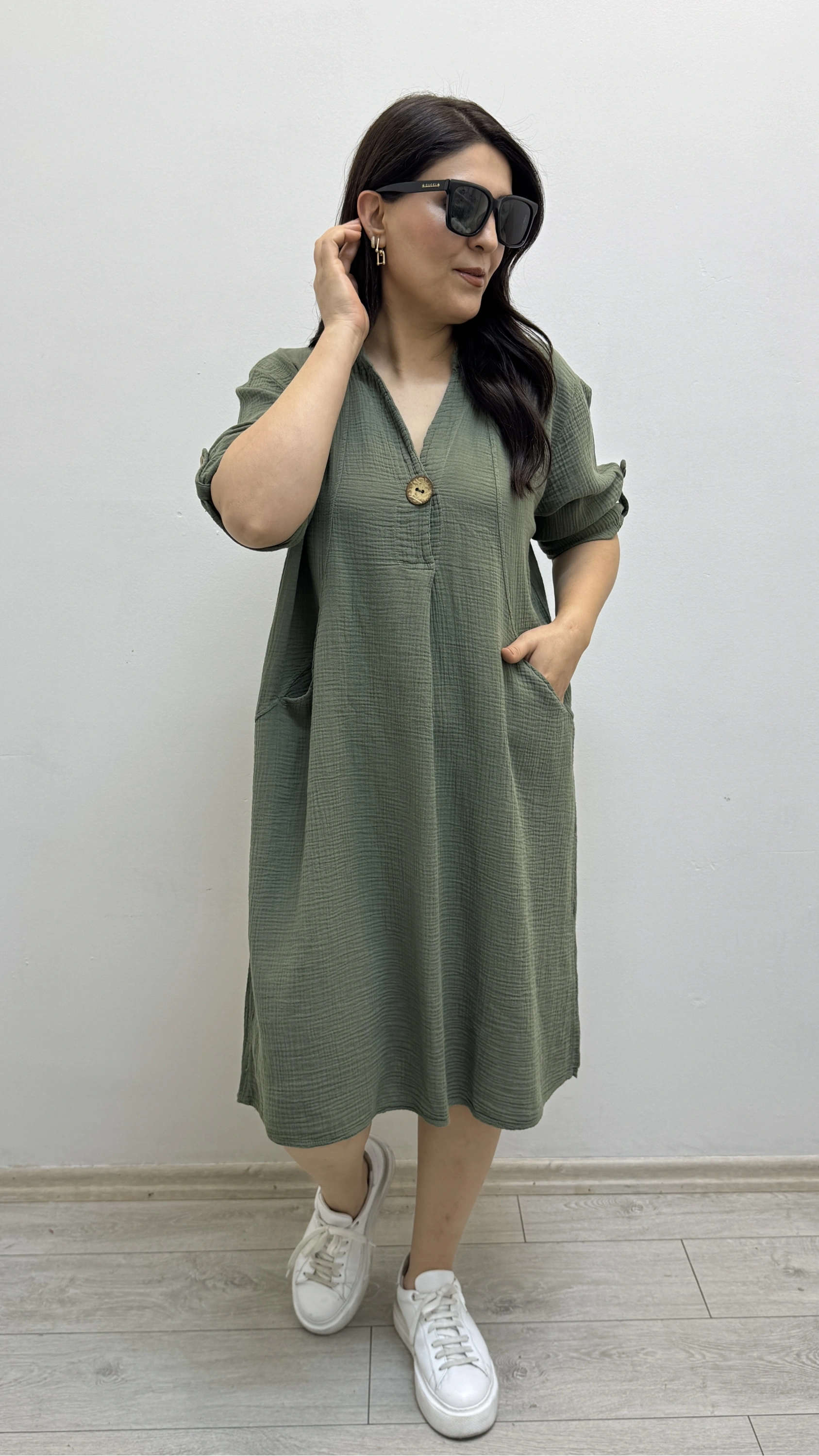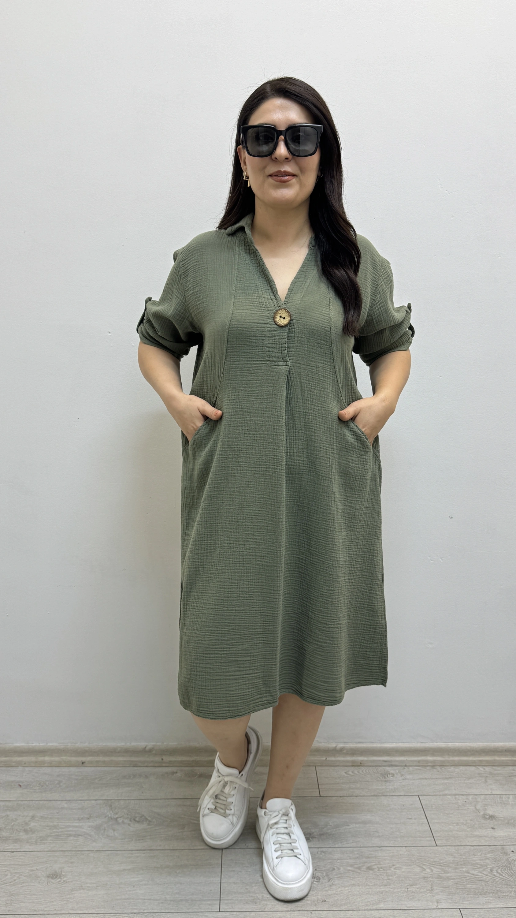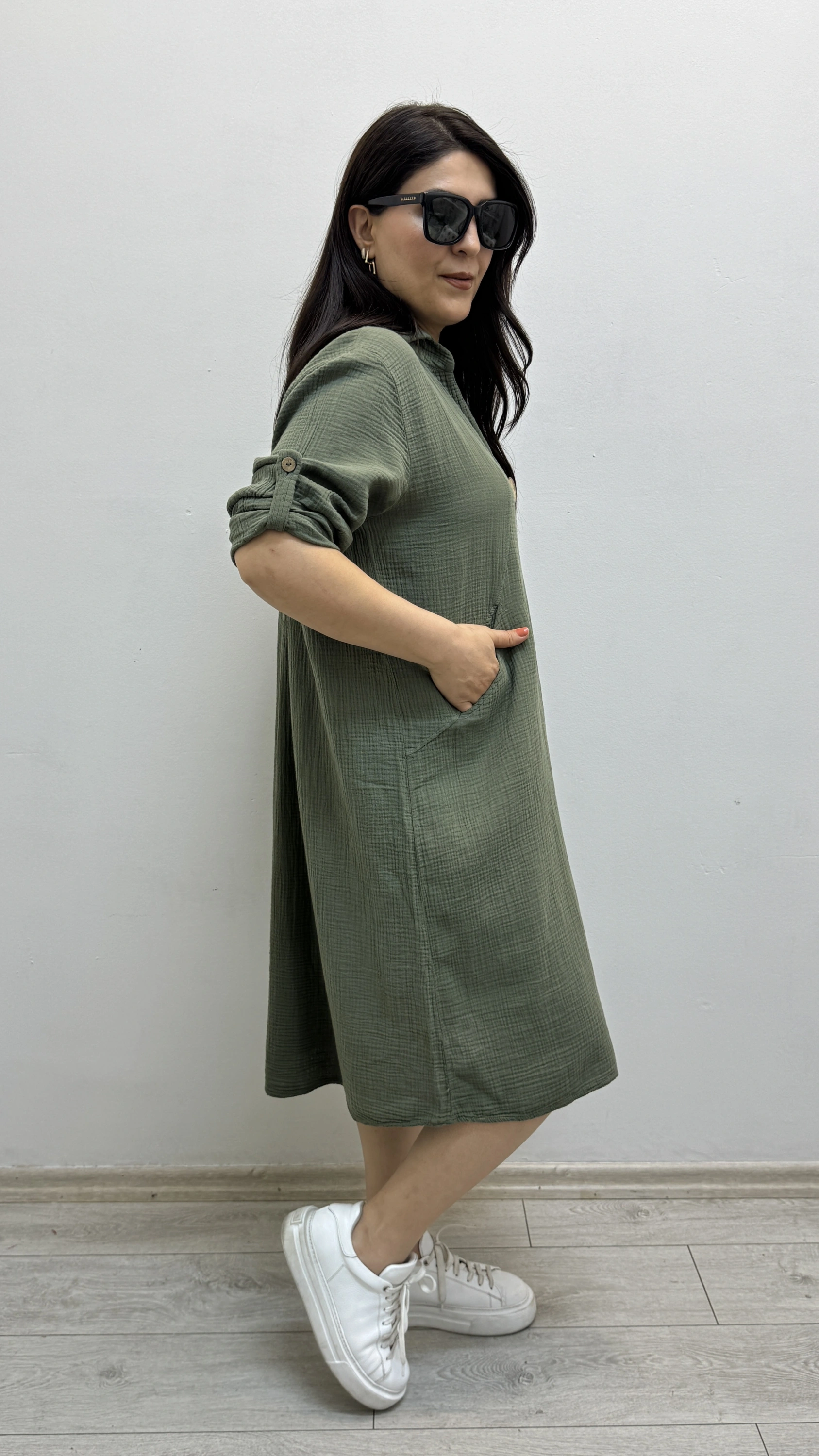 Dirsek Kol İki Yandan Cepli Haki Yeşil Müslin Elbise Hakkında