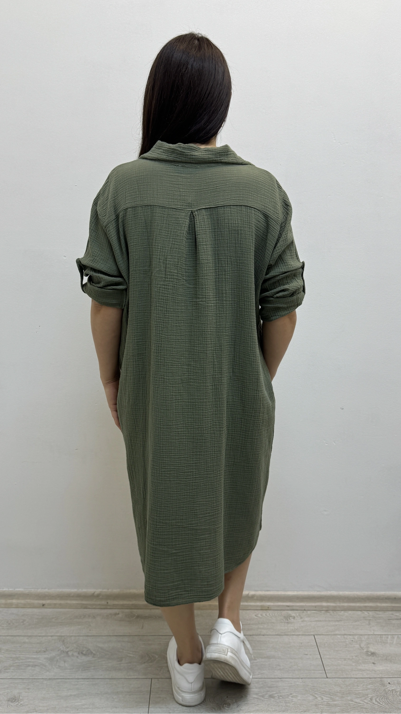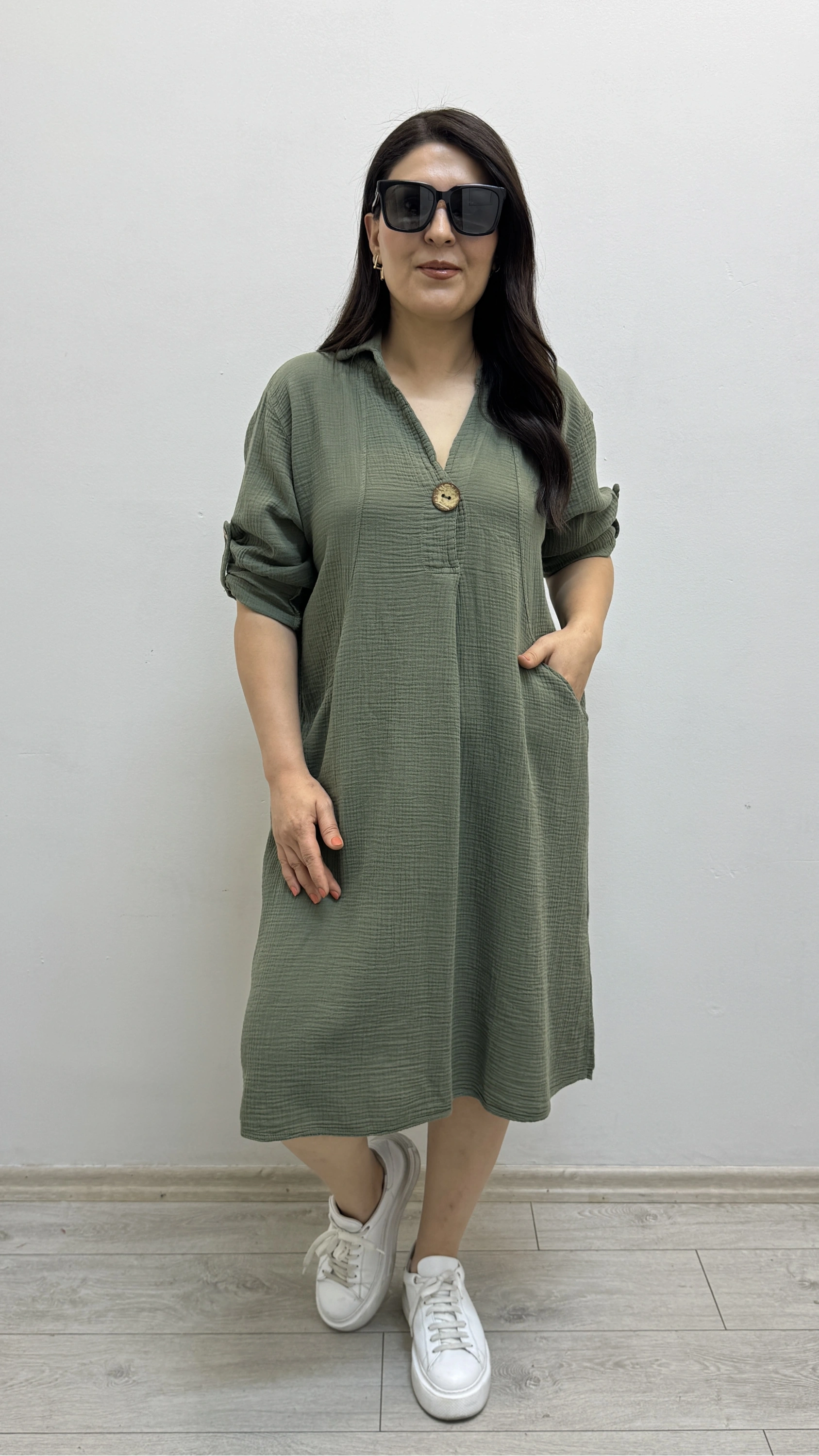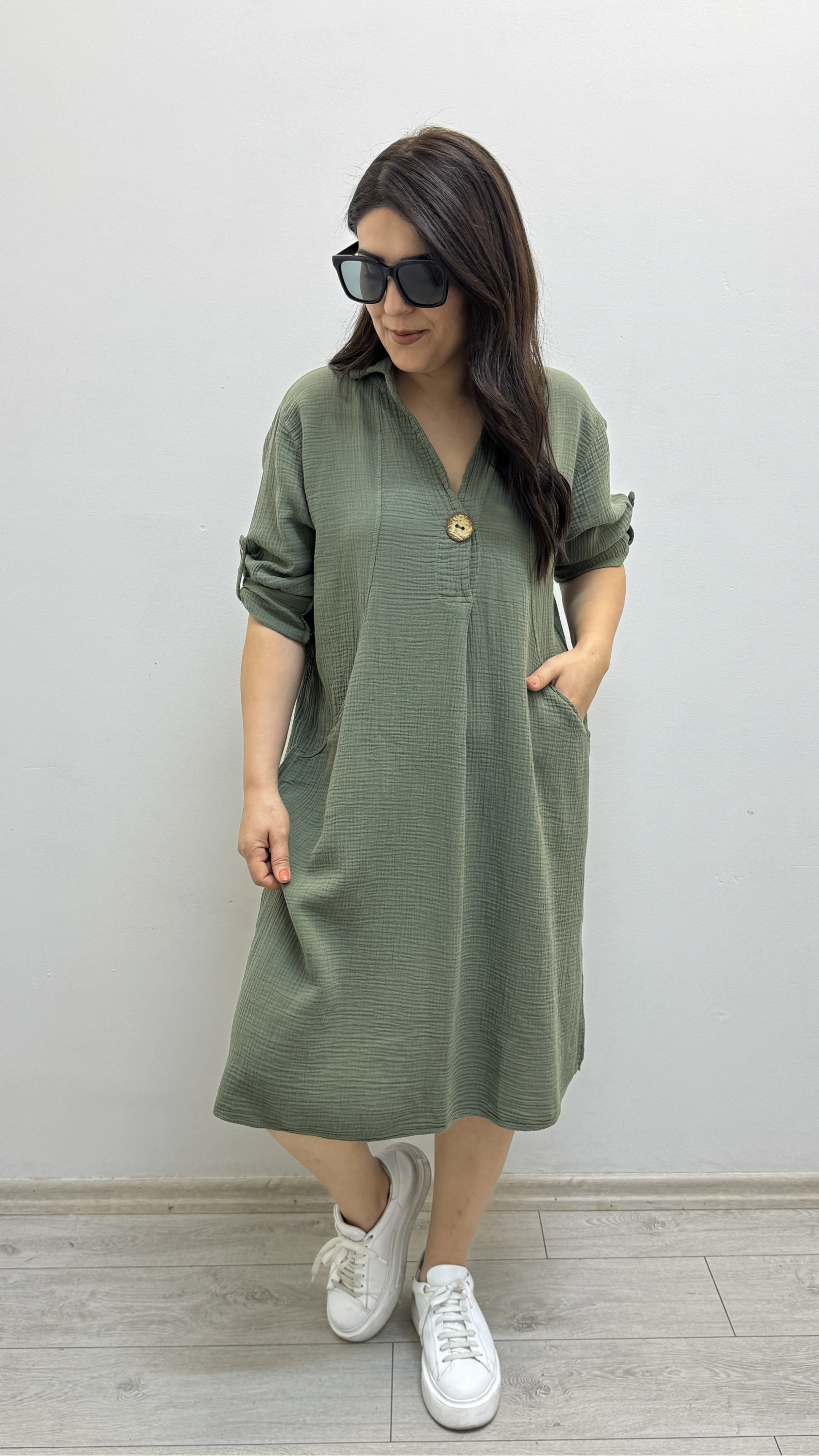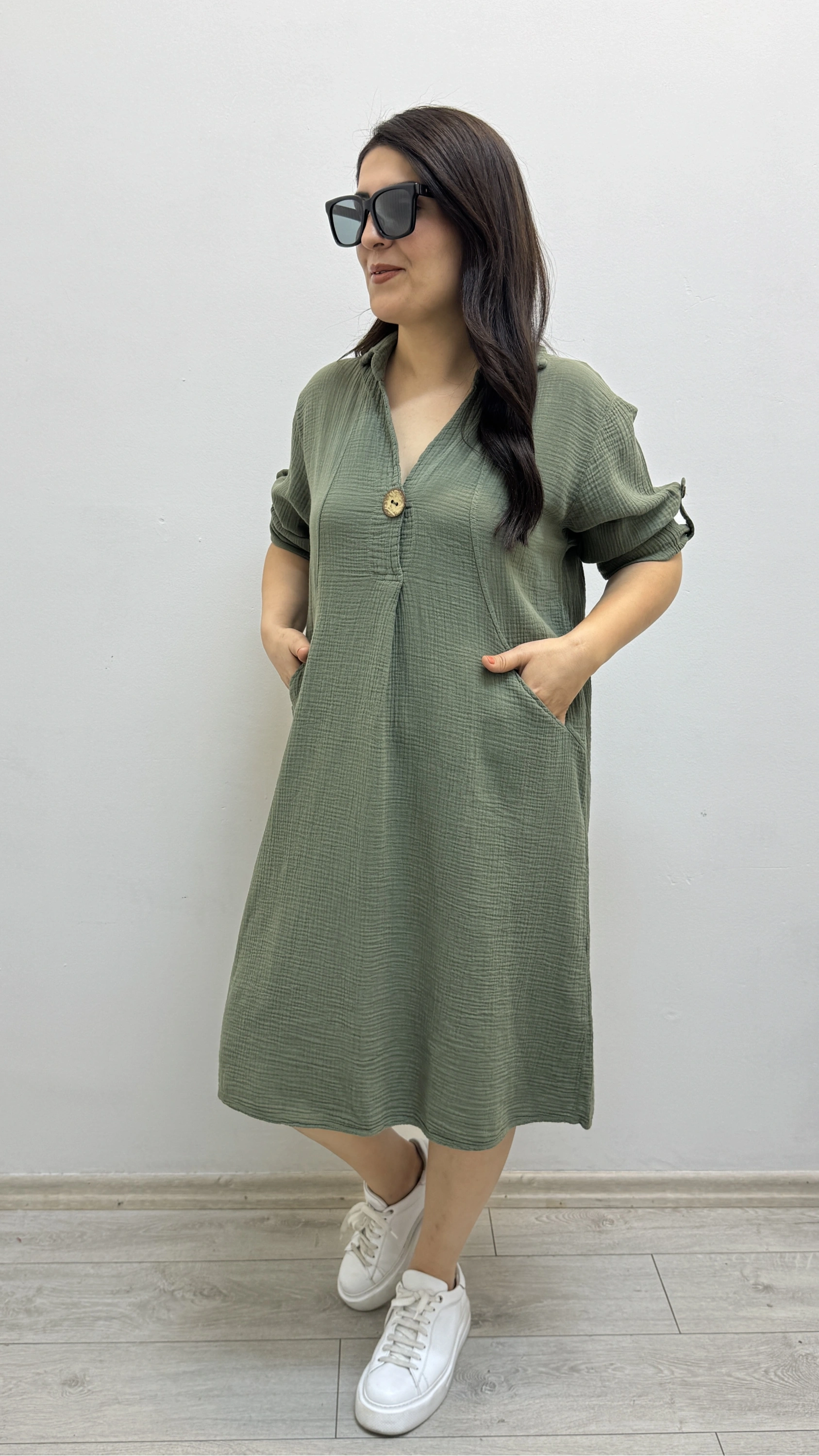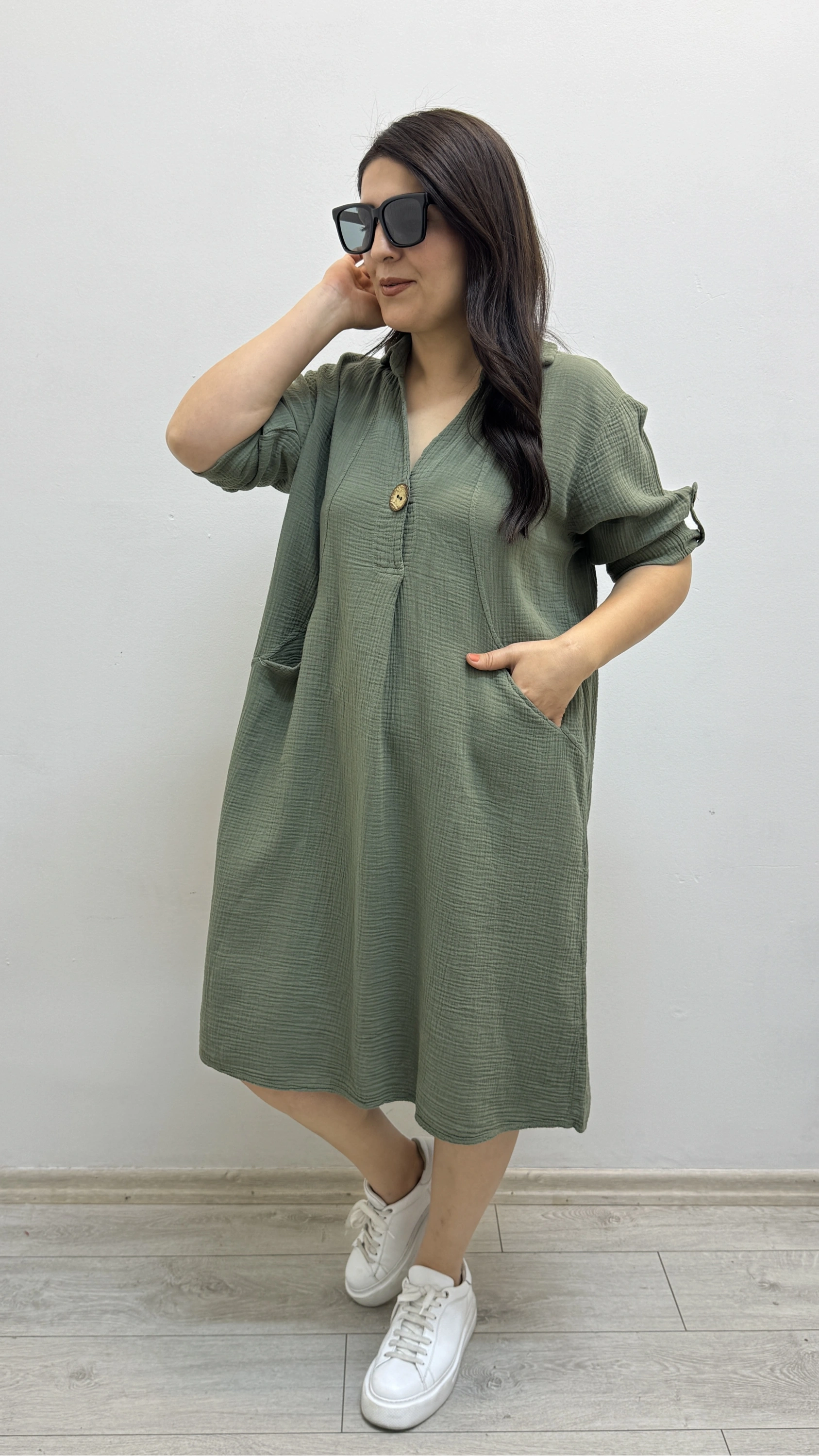 Dirsek Kol İki Yandan Cepli Haki Yeşil Müslin Elbise Hakkında