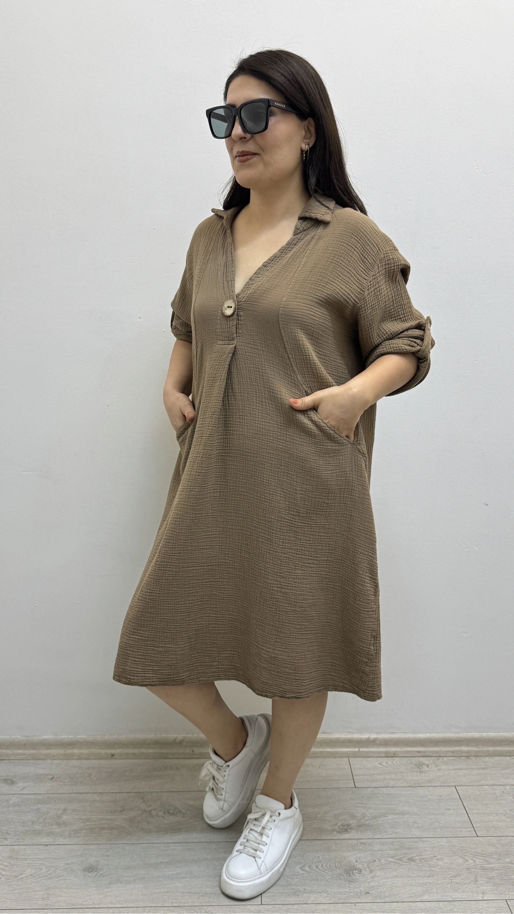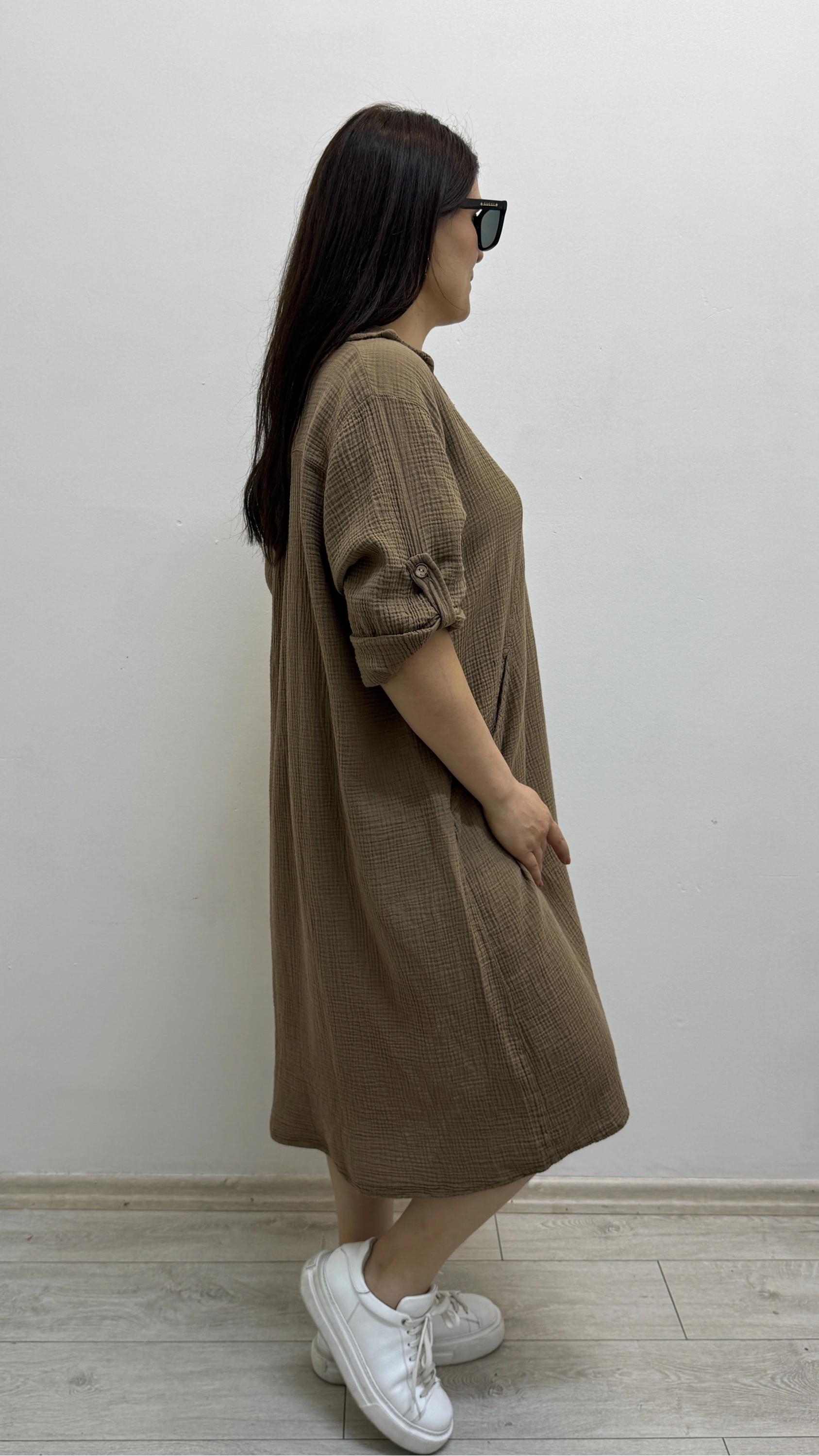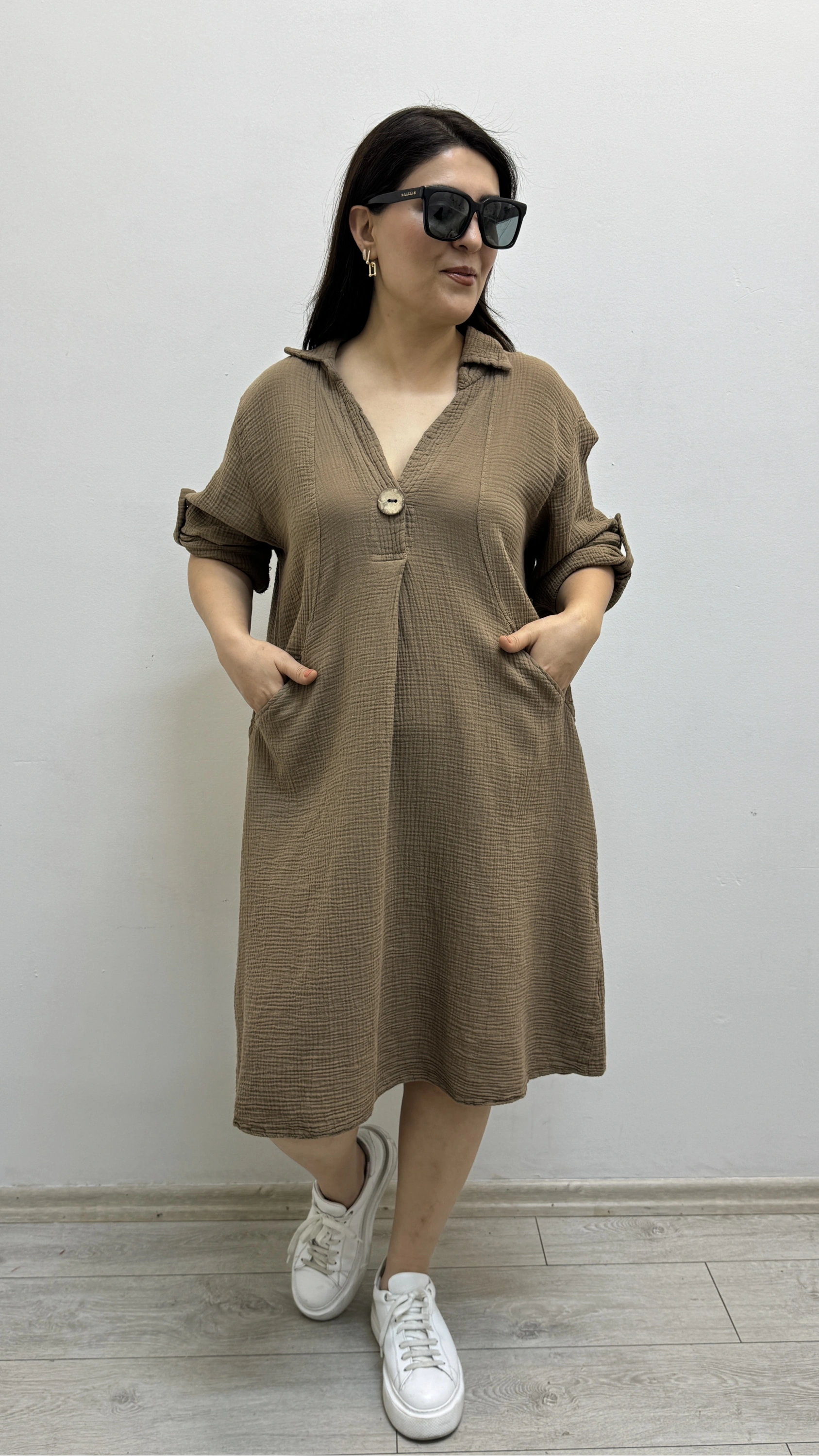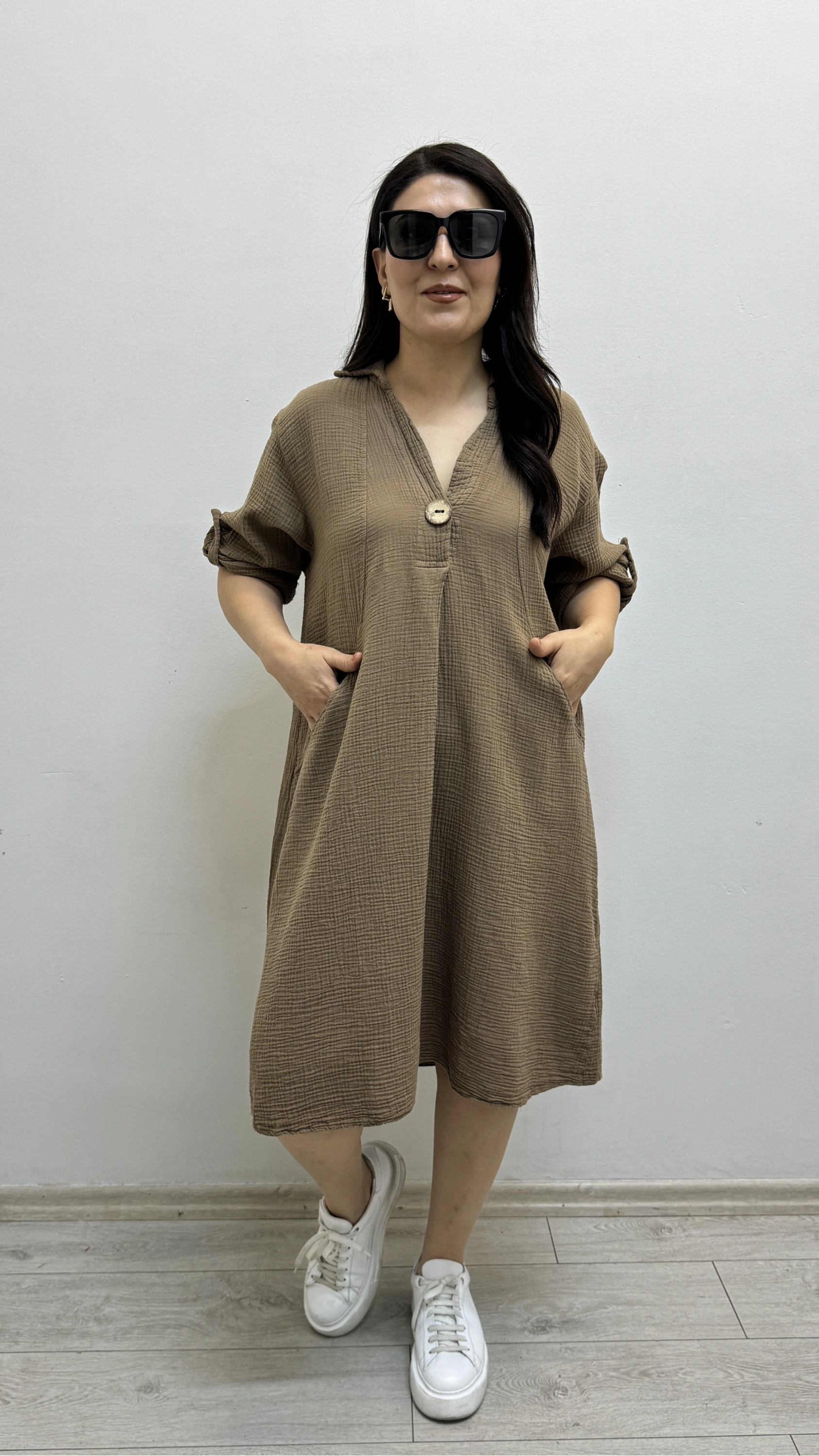 Dirsek Kol İki Yandan Cepli Kahverengi Müslin Elbise Hakkında