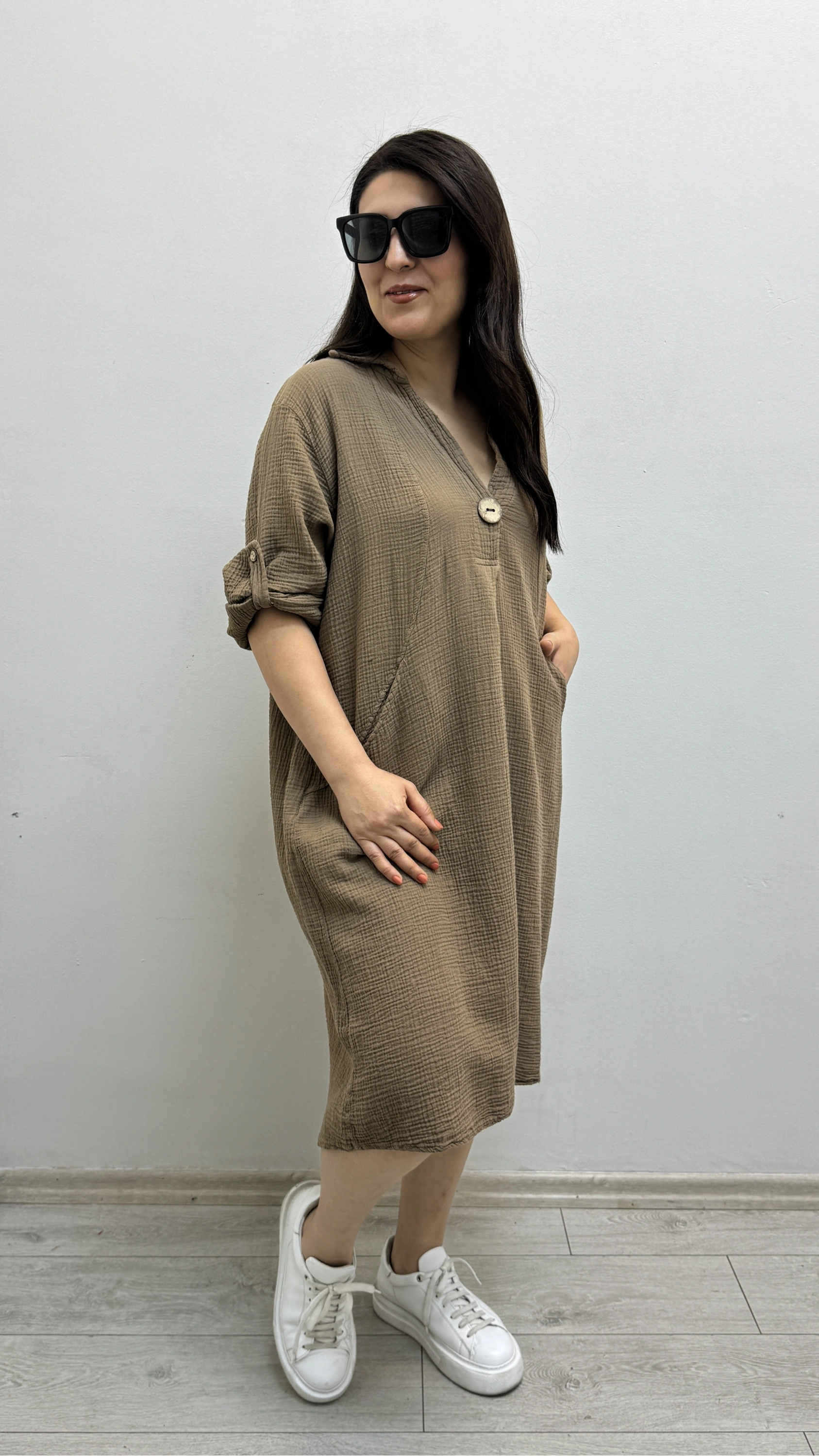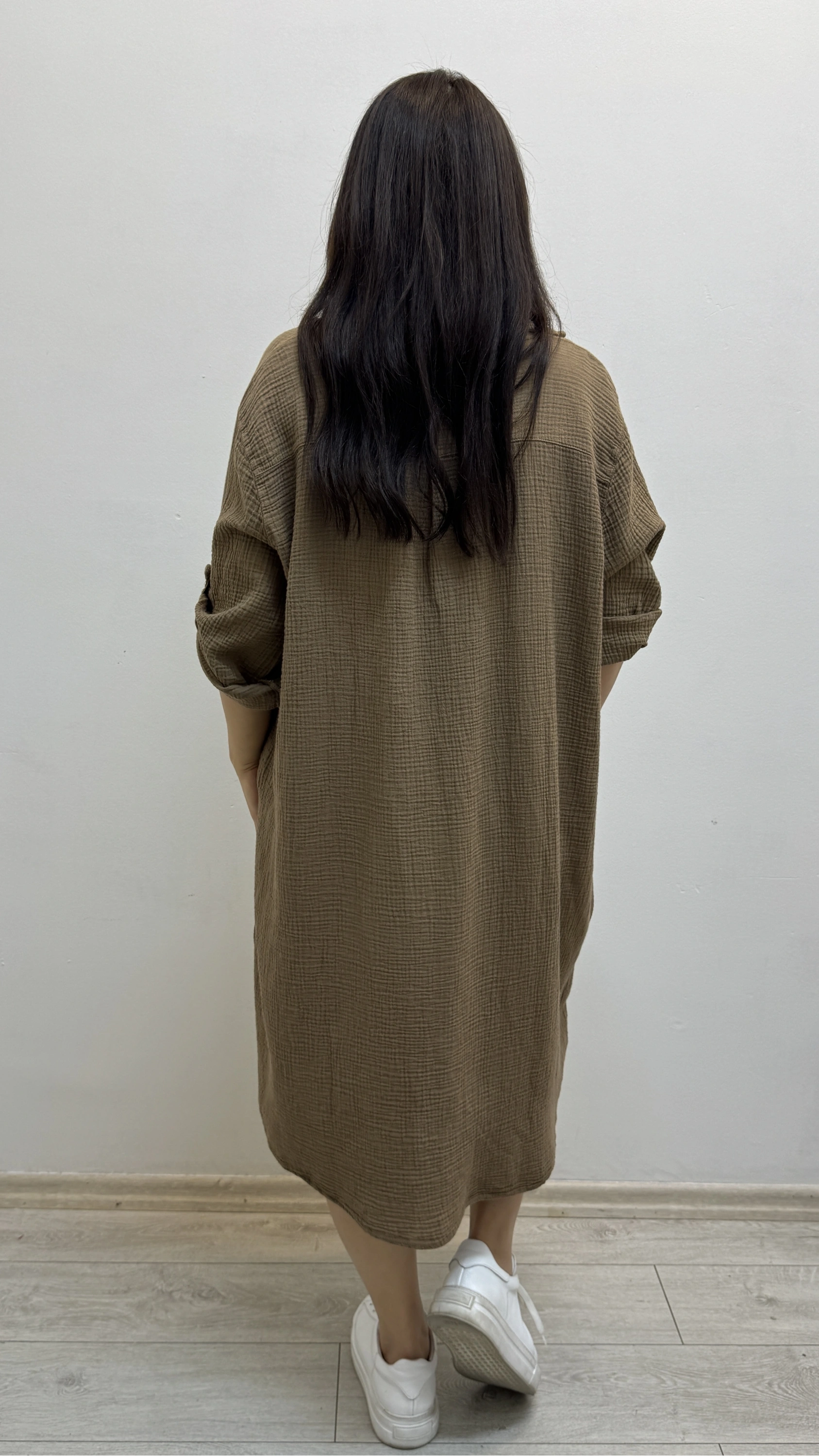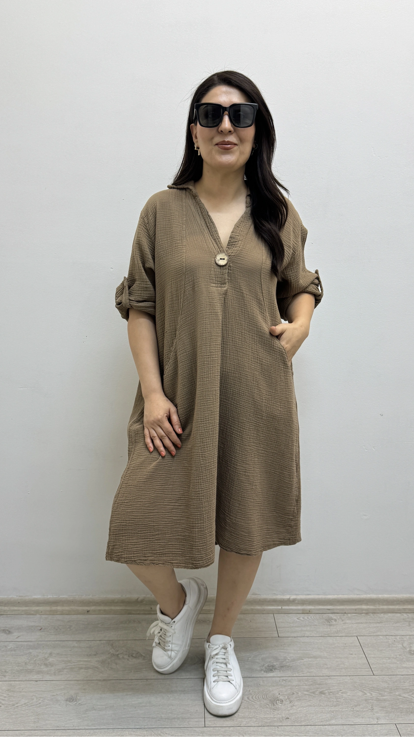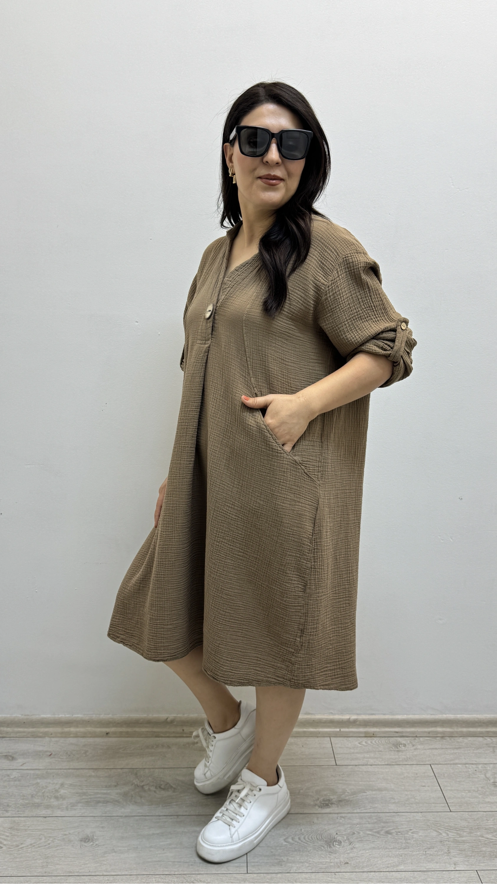 Dirsek Kol İki Yandan Cepli Kahverengi Müslin Elbise Hakkında