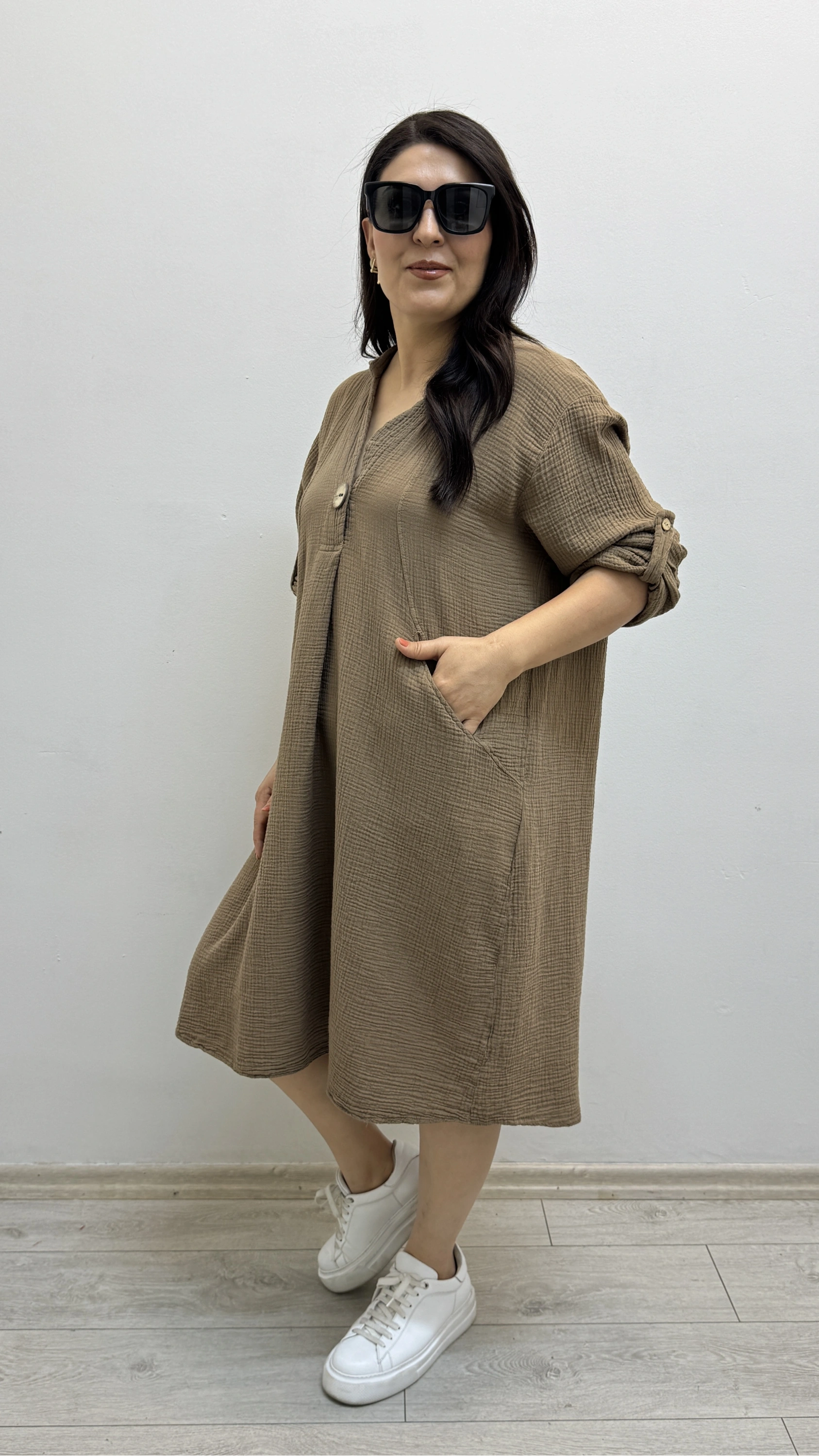 Dirsek Kol İki Yandan Cepli Kahverengi Müslin Elbise