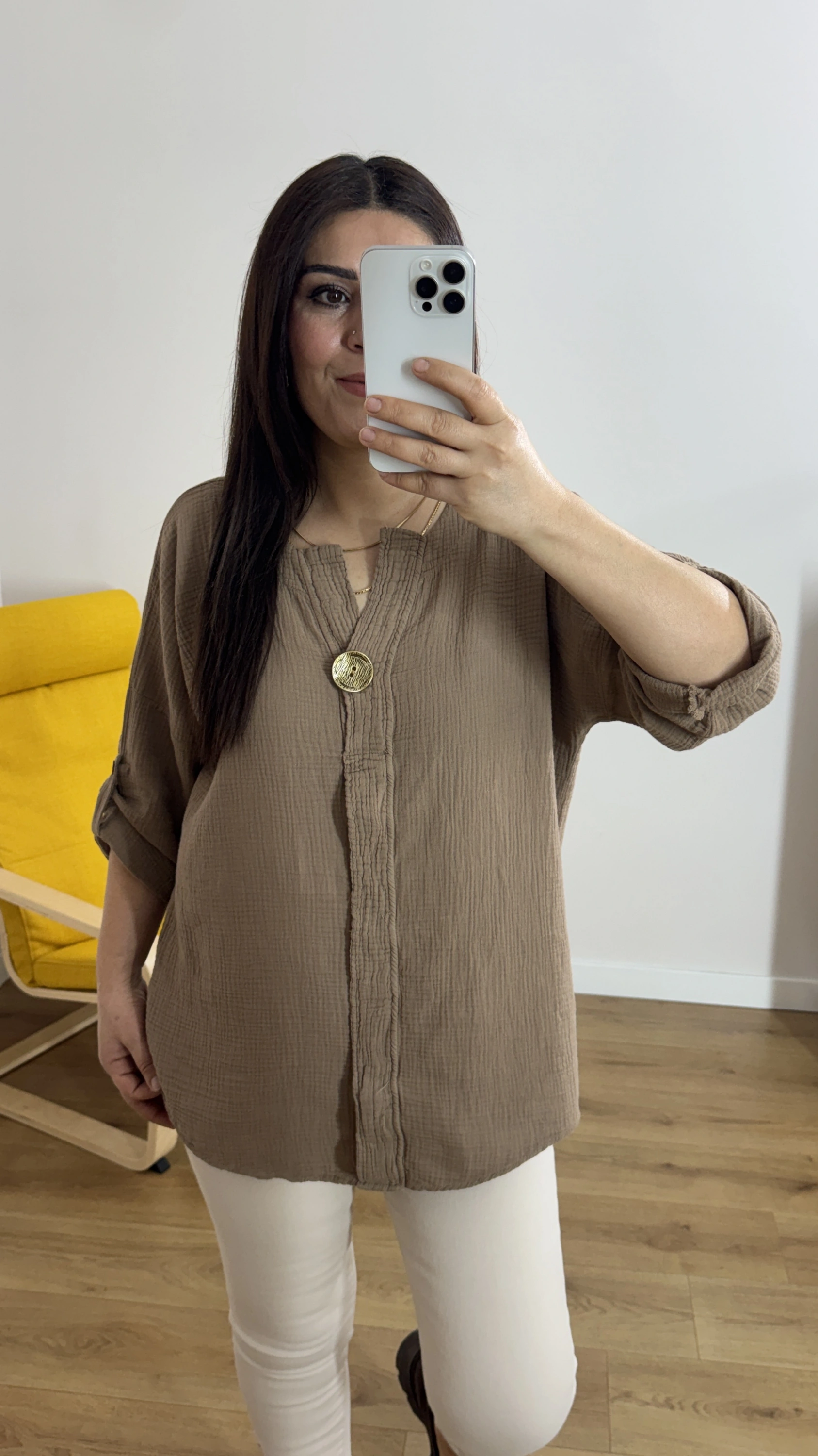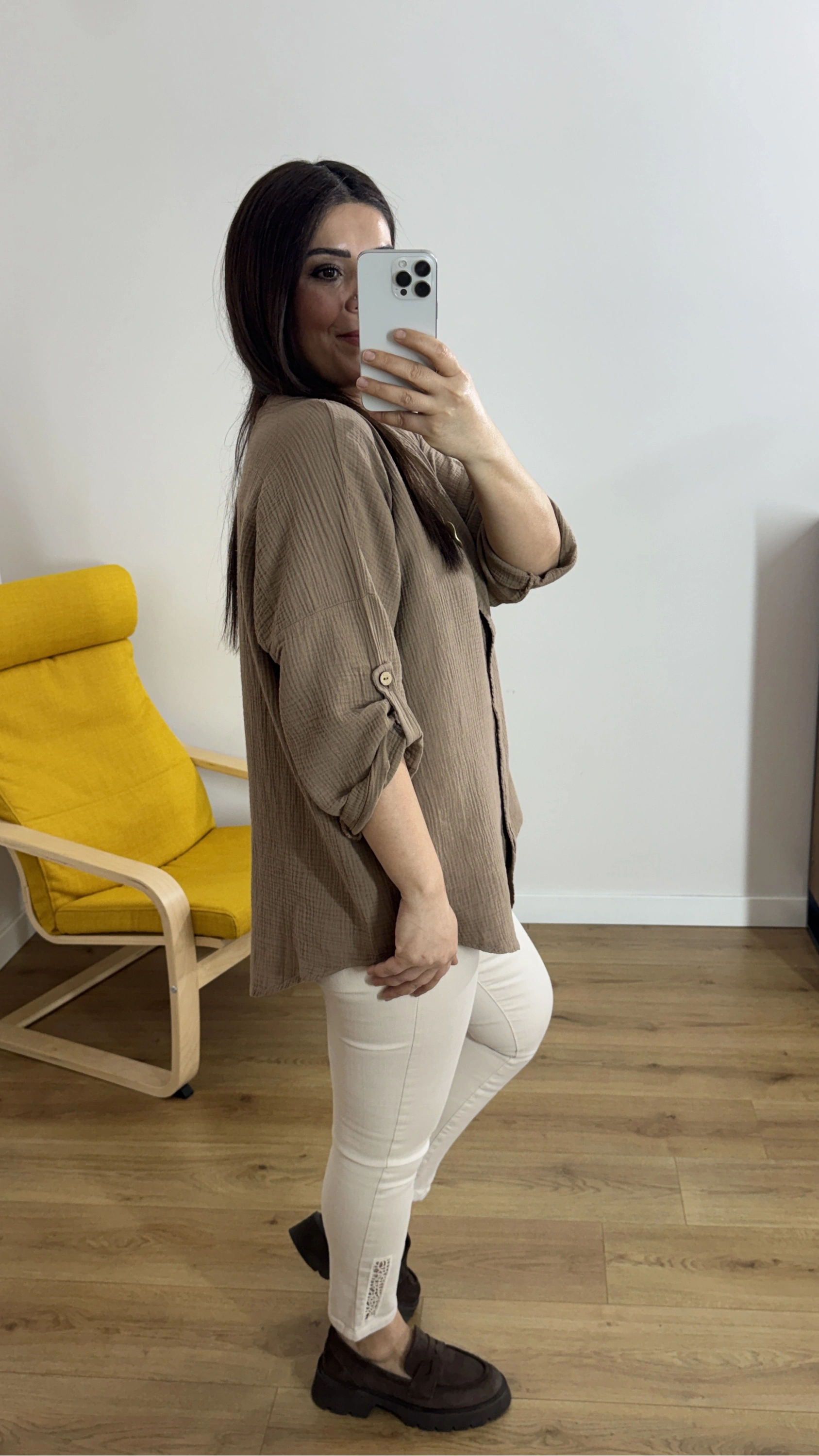 Dirsek Kol Kahverengi Müslin Bluz Hakkında