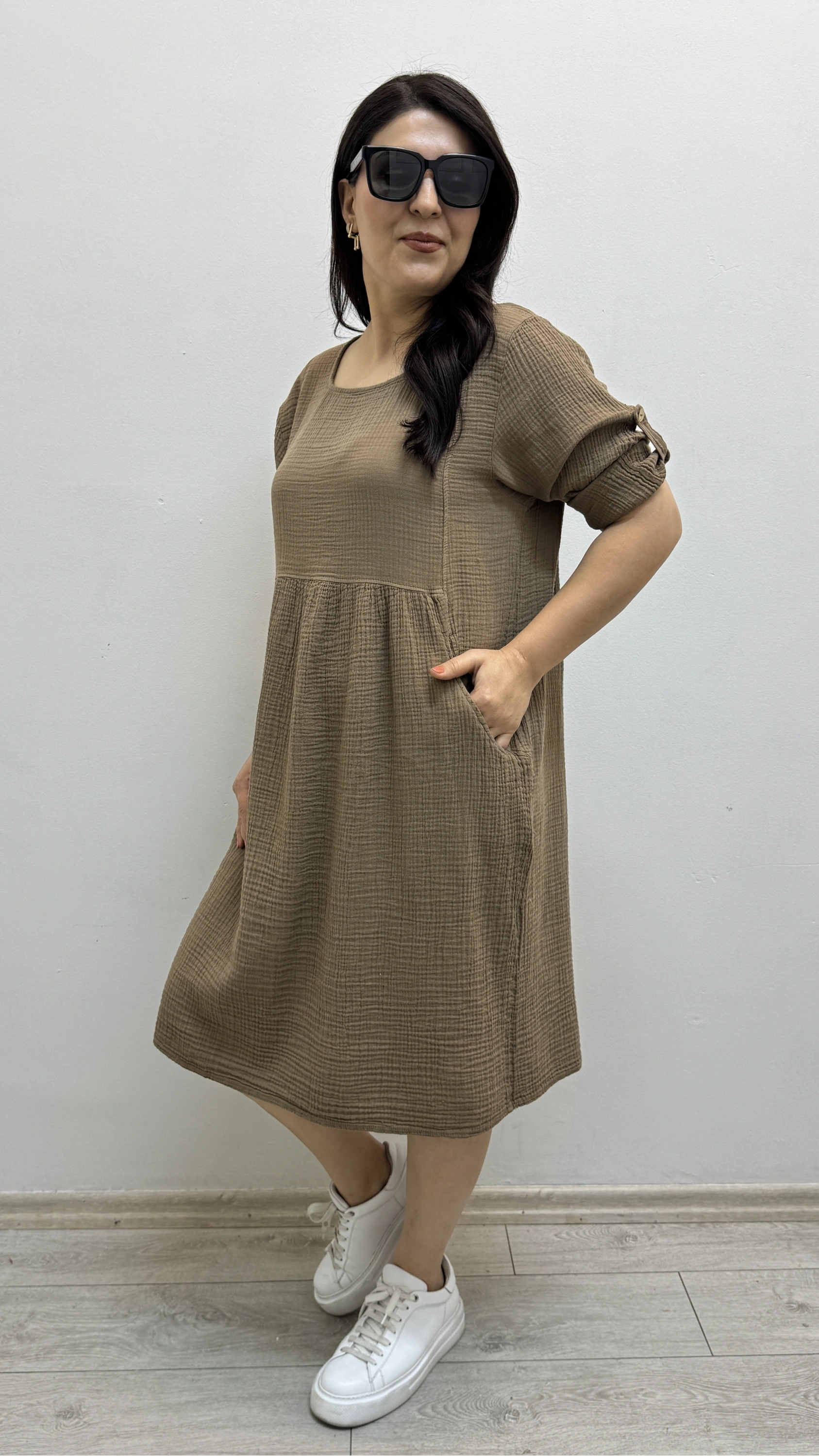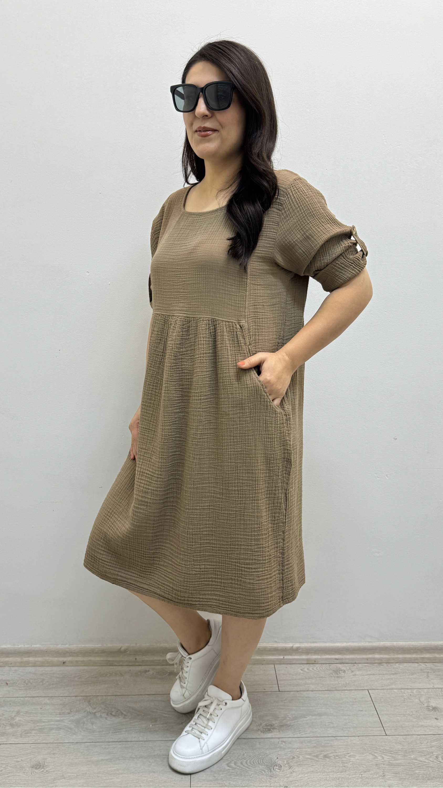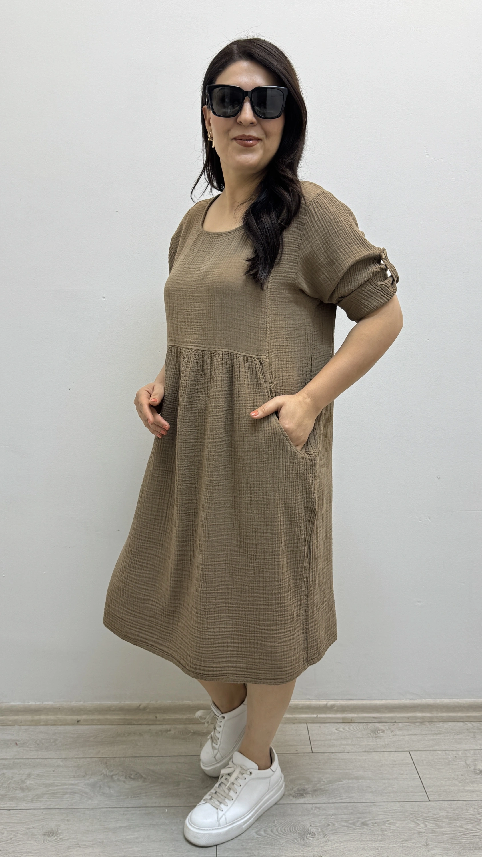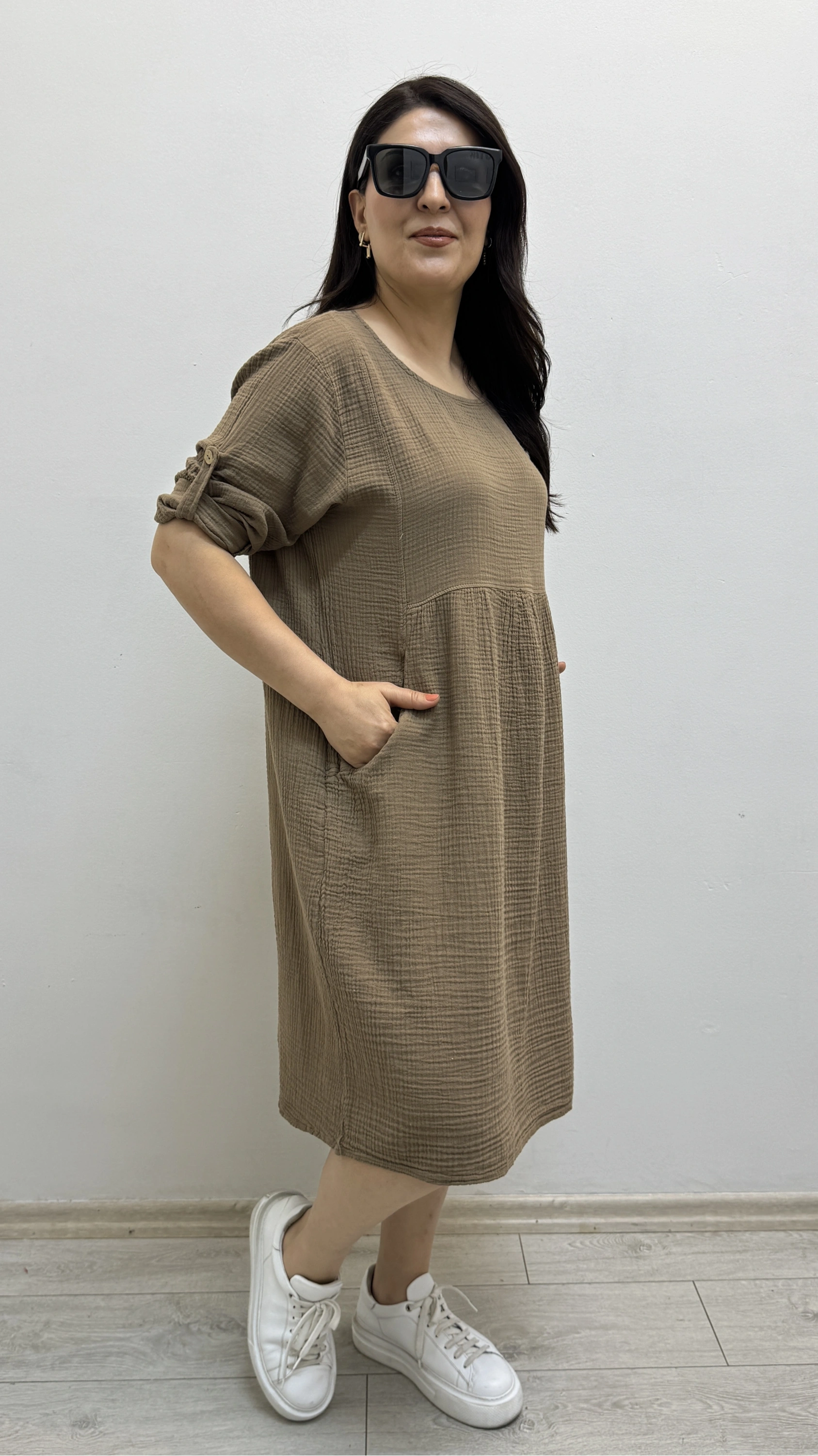 Dirsek Kol Yuvarlak Yaka Cepli Kahverengi Müslin Elbise Hakkında