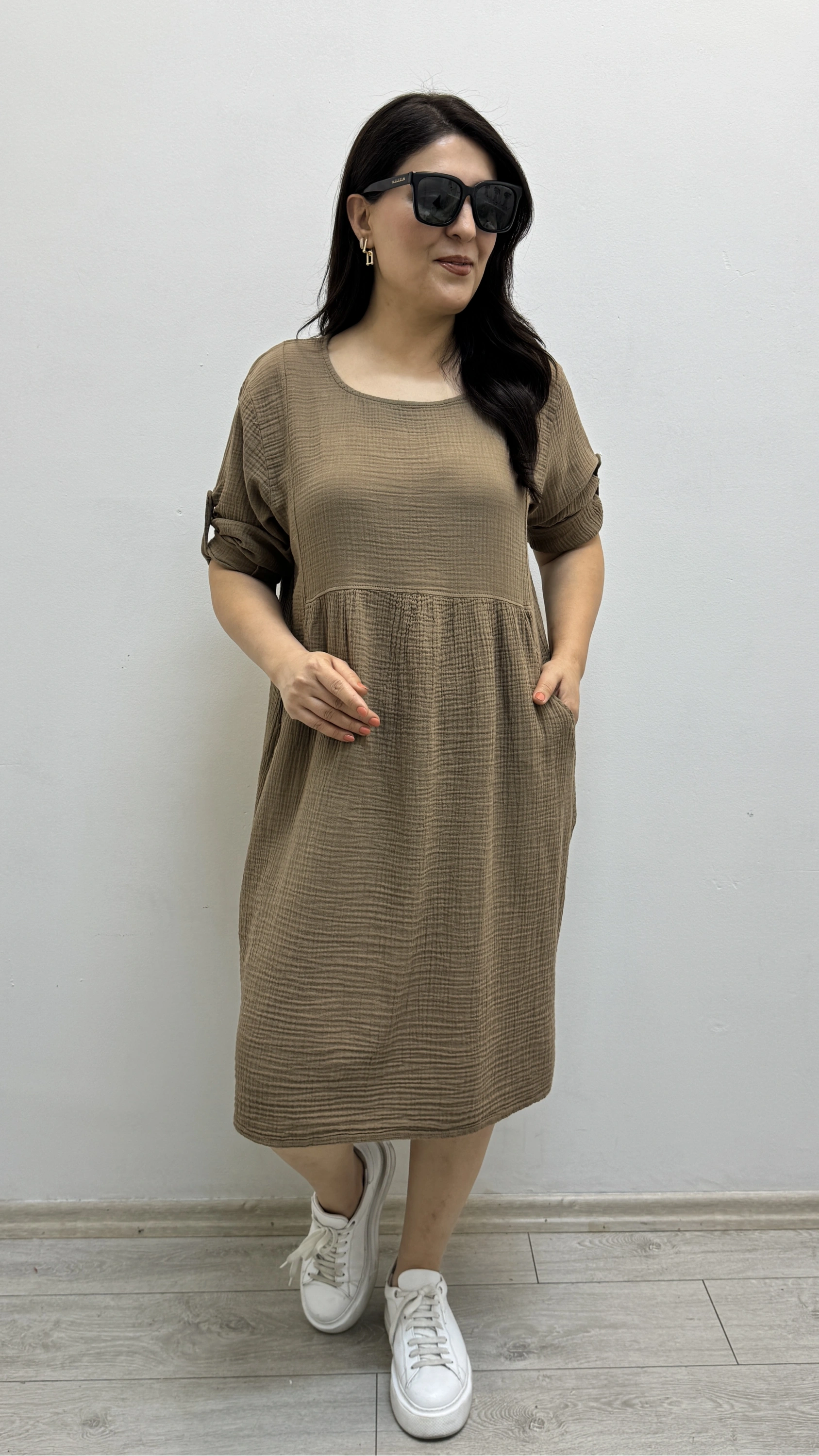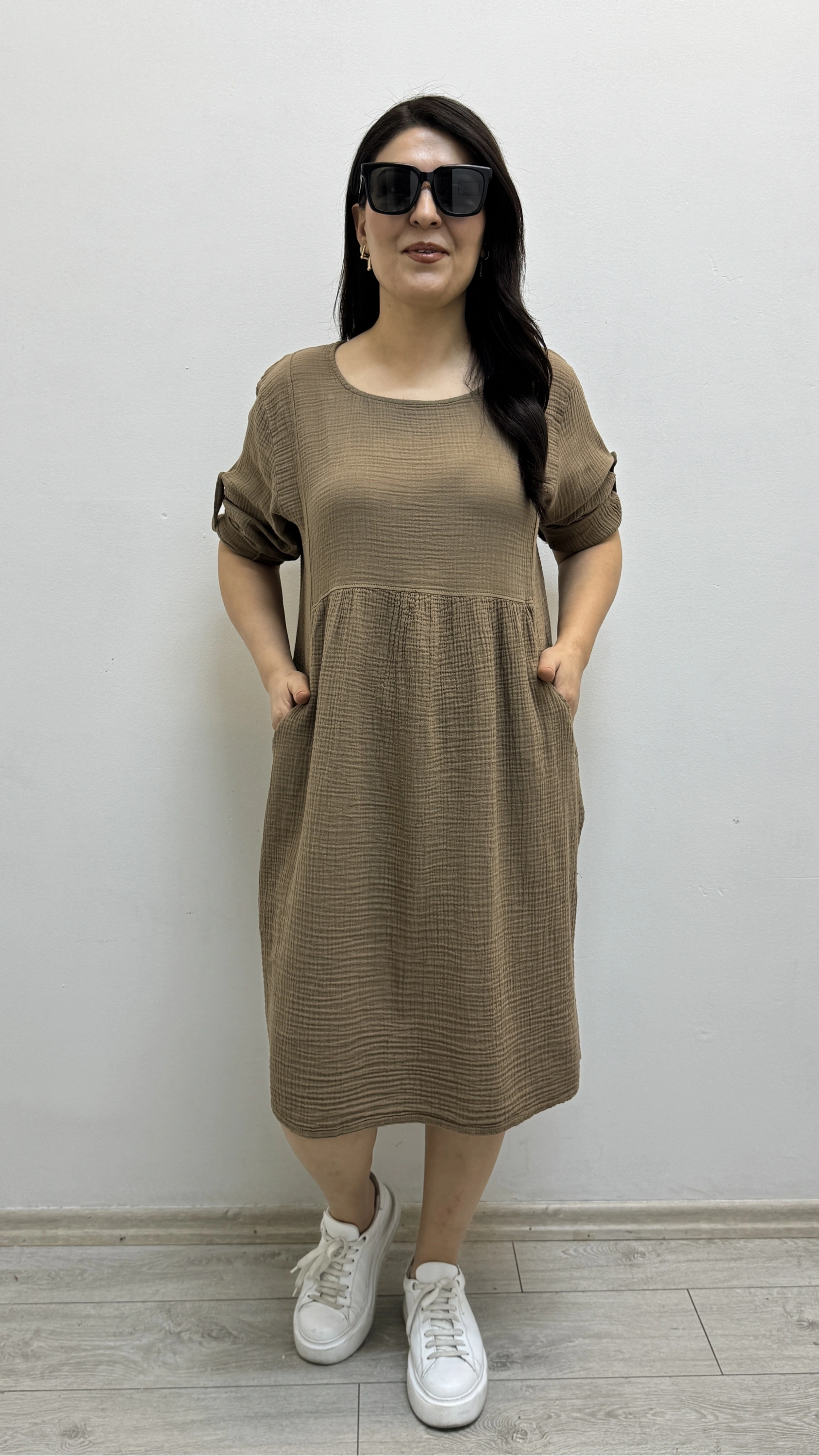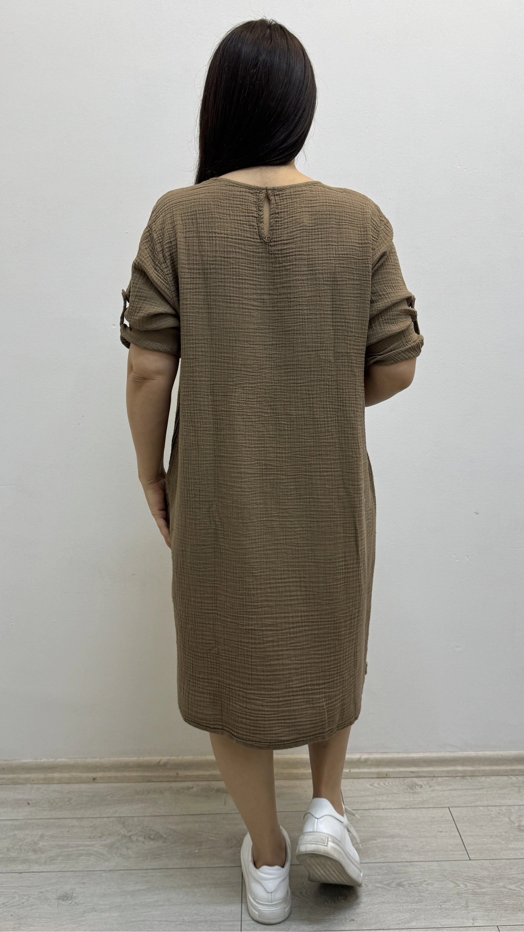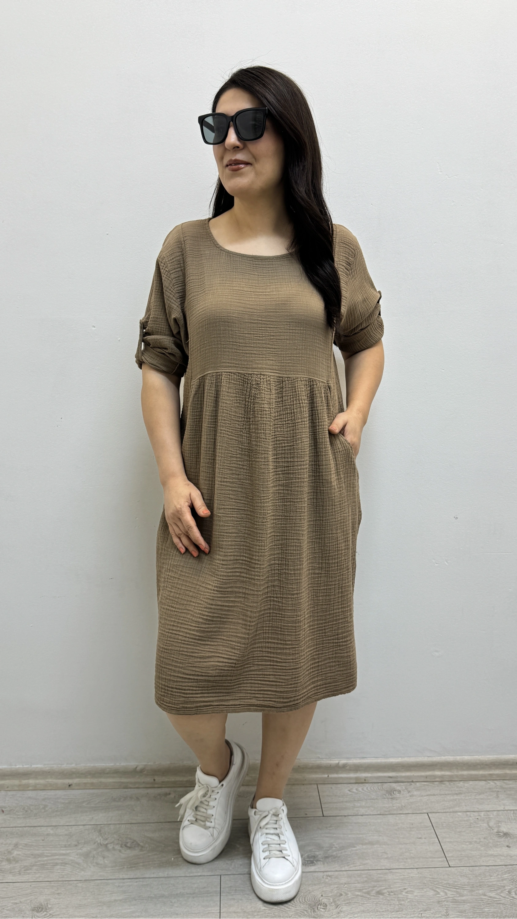 Dirsek Kol Yuvarlak Yaka Cepli Kahverengi Müslin Elbise Hakkında