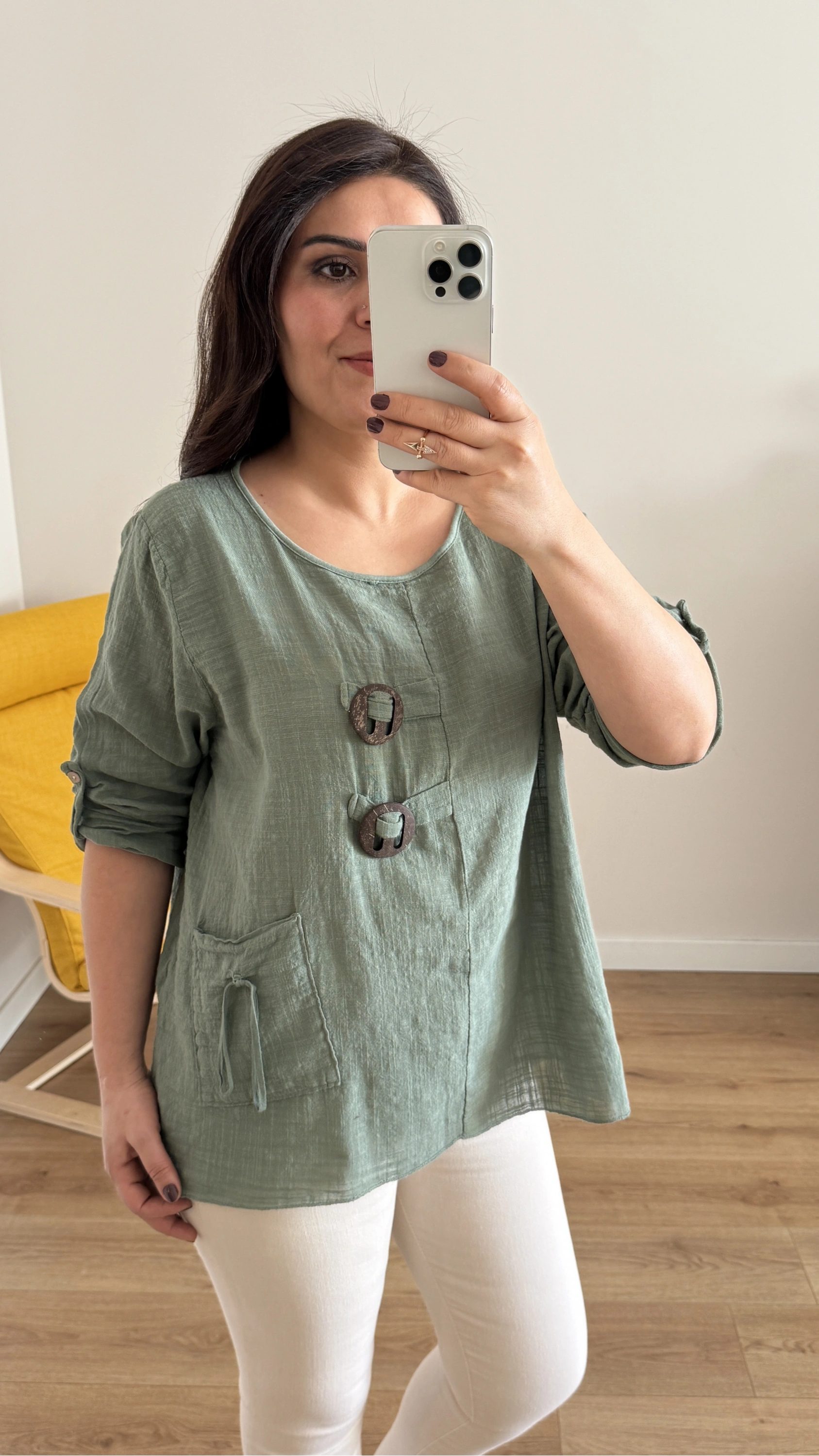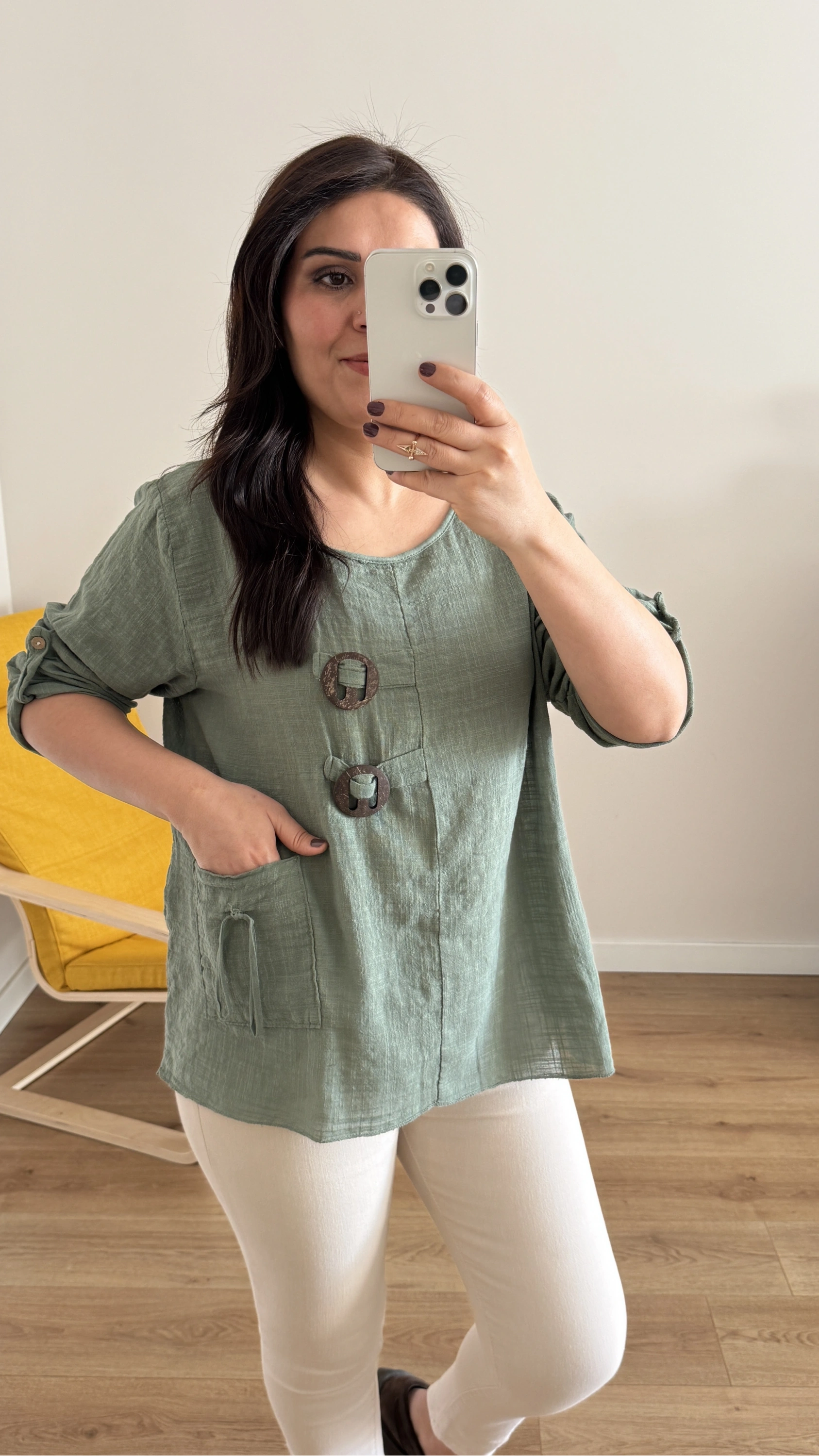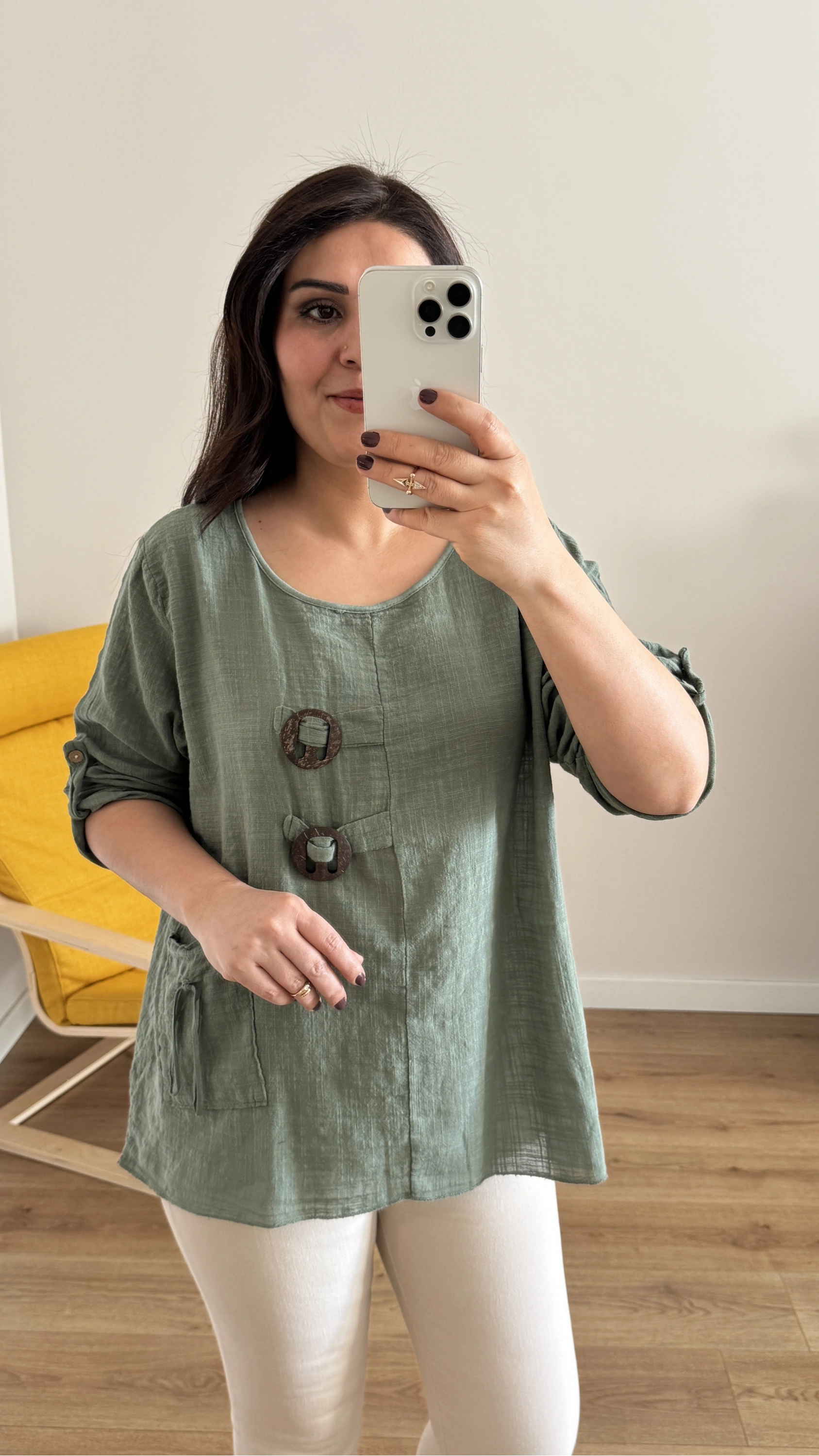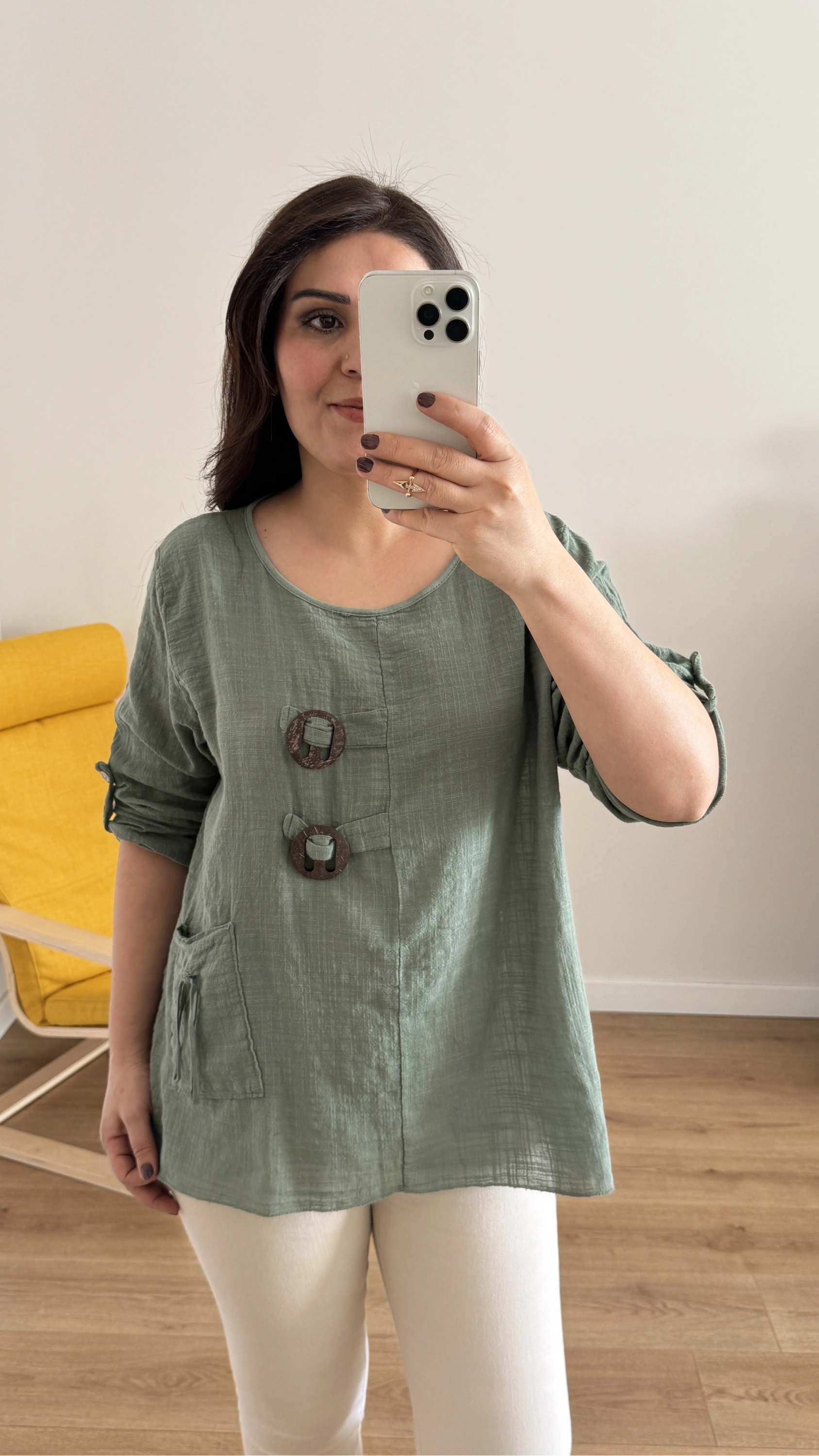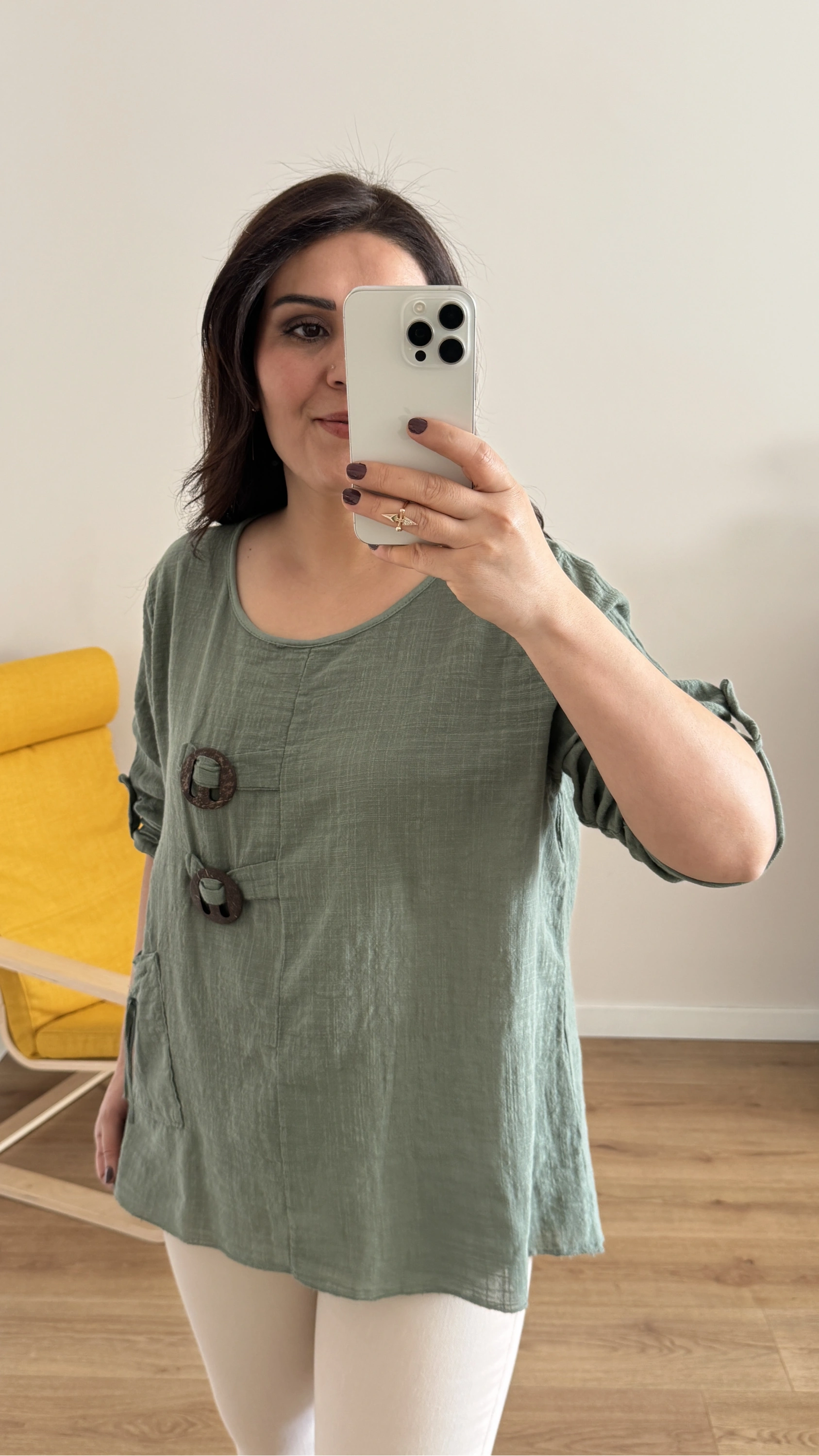 Düğme Detaylı Haki Yeşil İthal Bluz