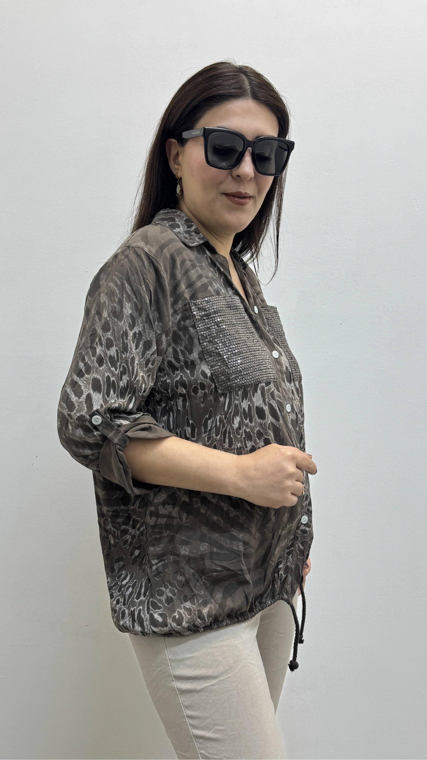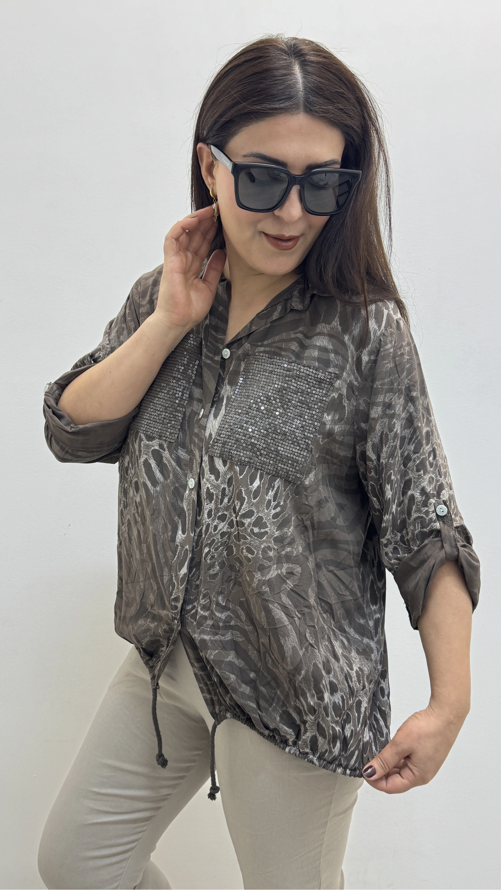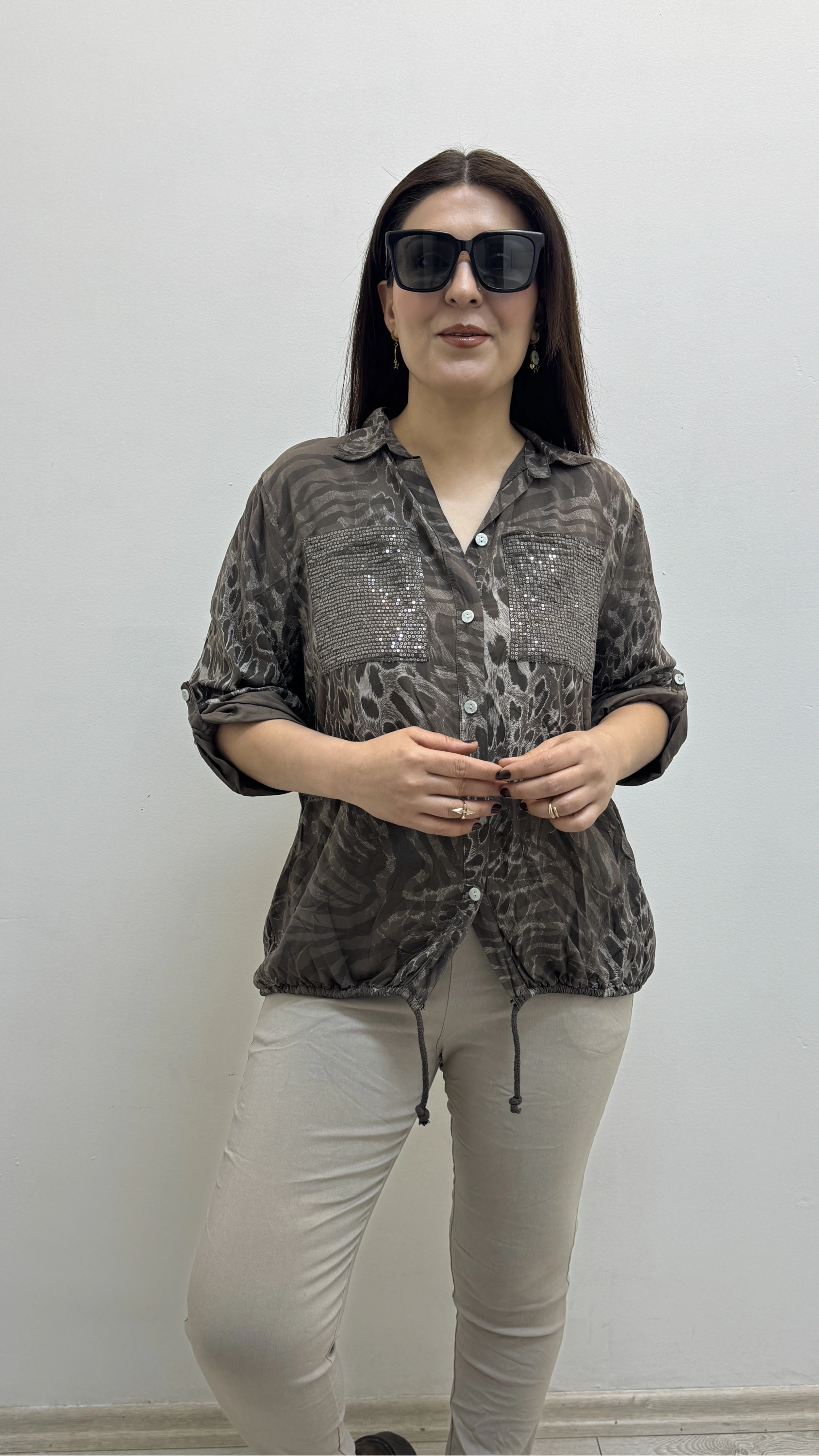 Etek Ucu Bağlamalı Payetli Leopar Desenli Kahverengi İthal Gömlek