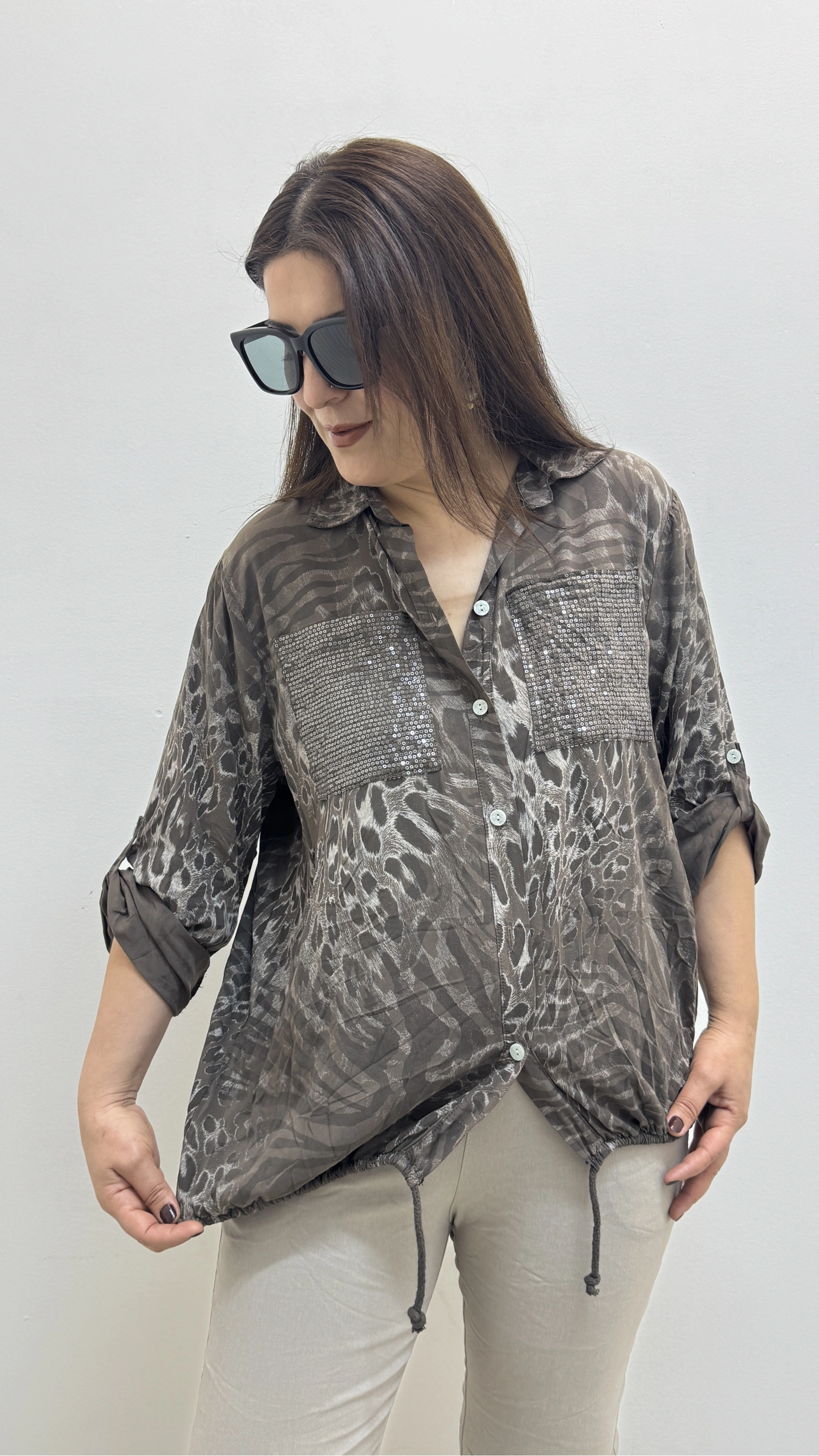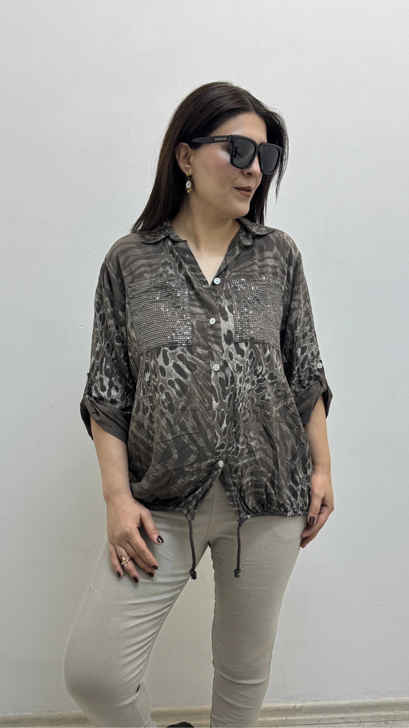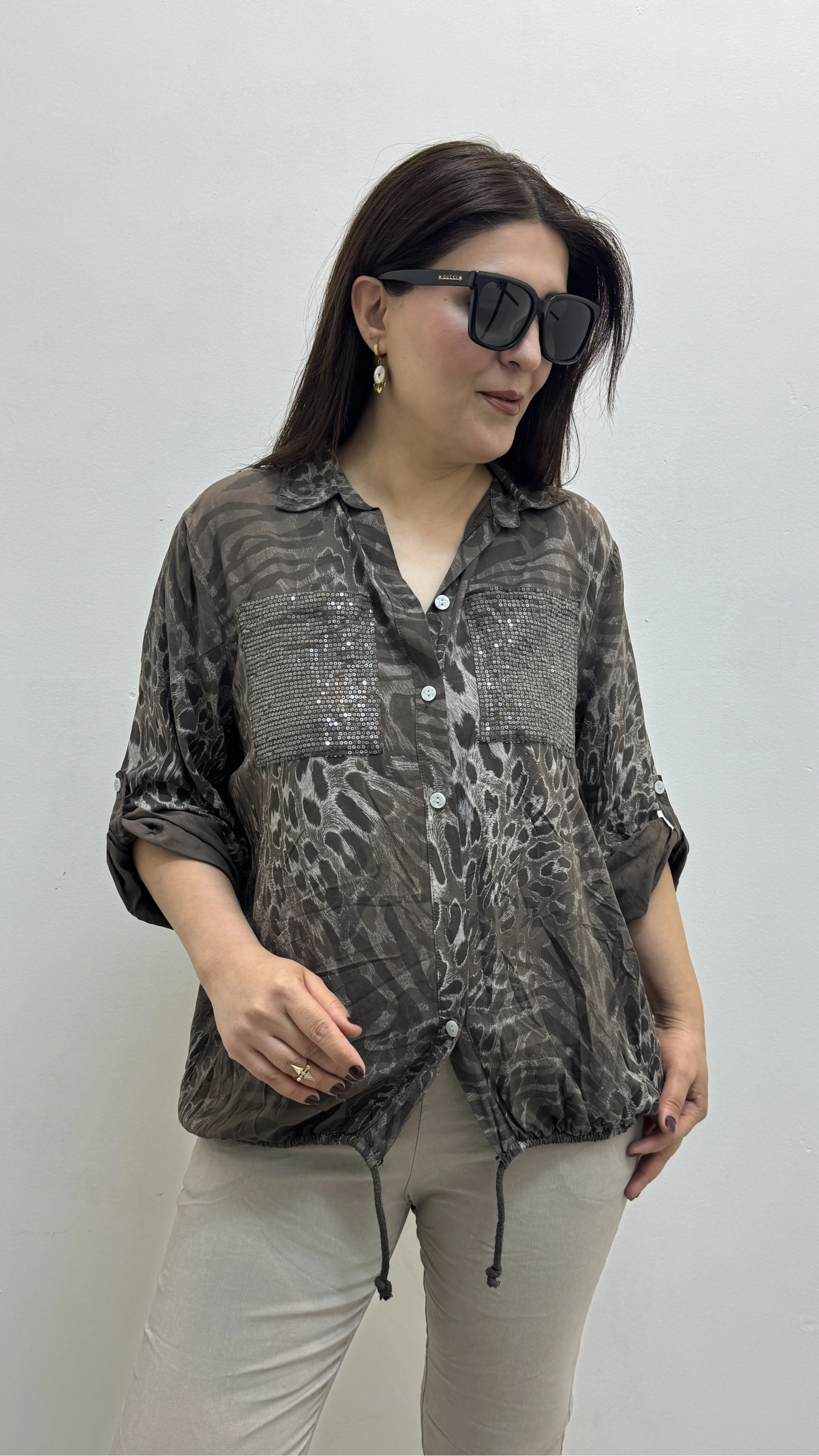 Etek Ucu Bağlamalı Payetli Leopar Desenli Kahverengi İthal Gömlek