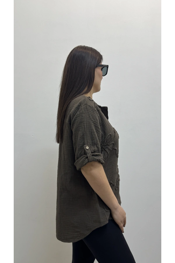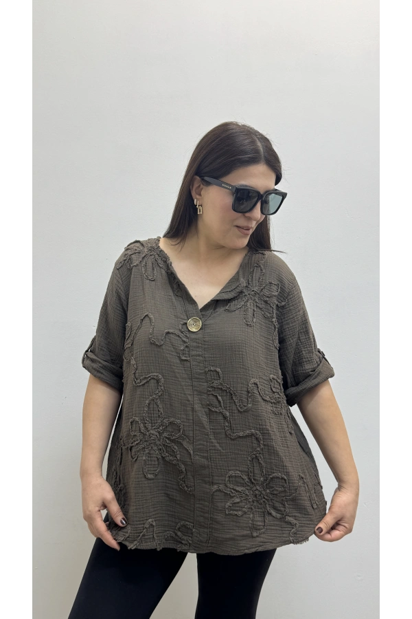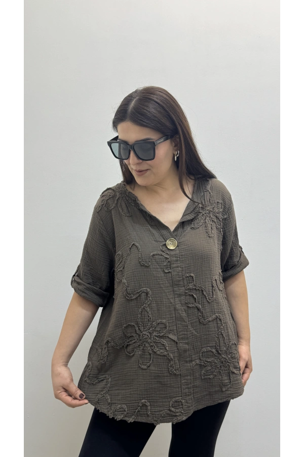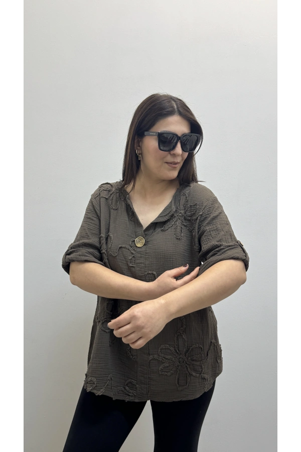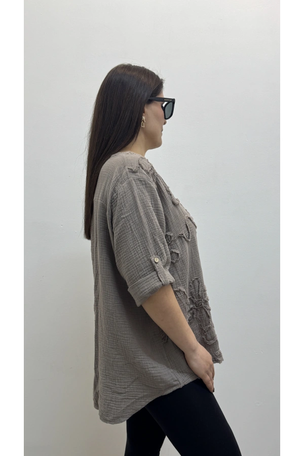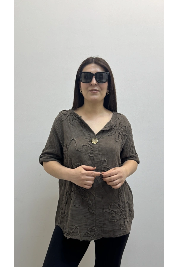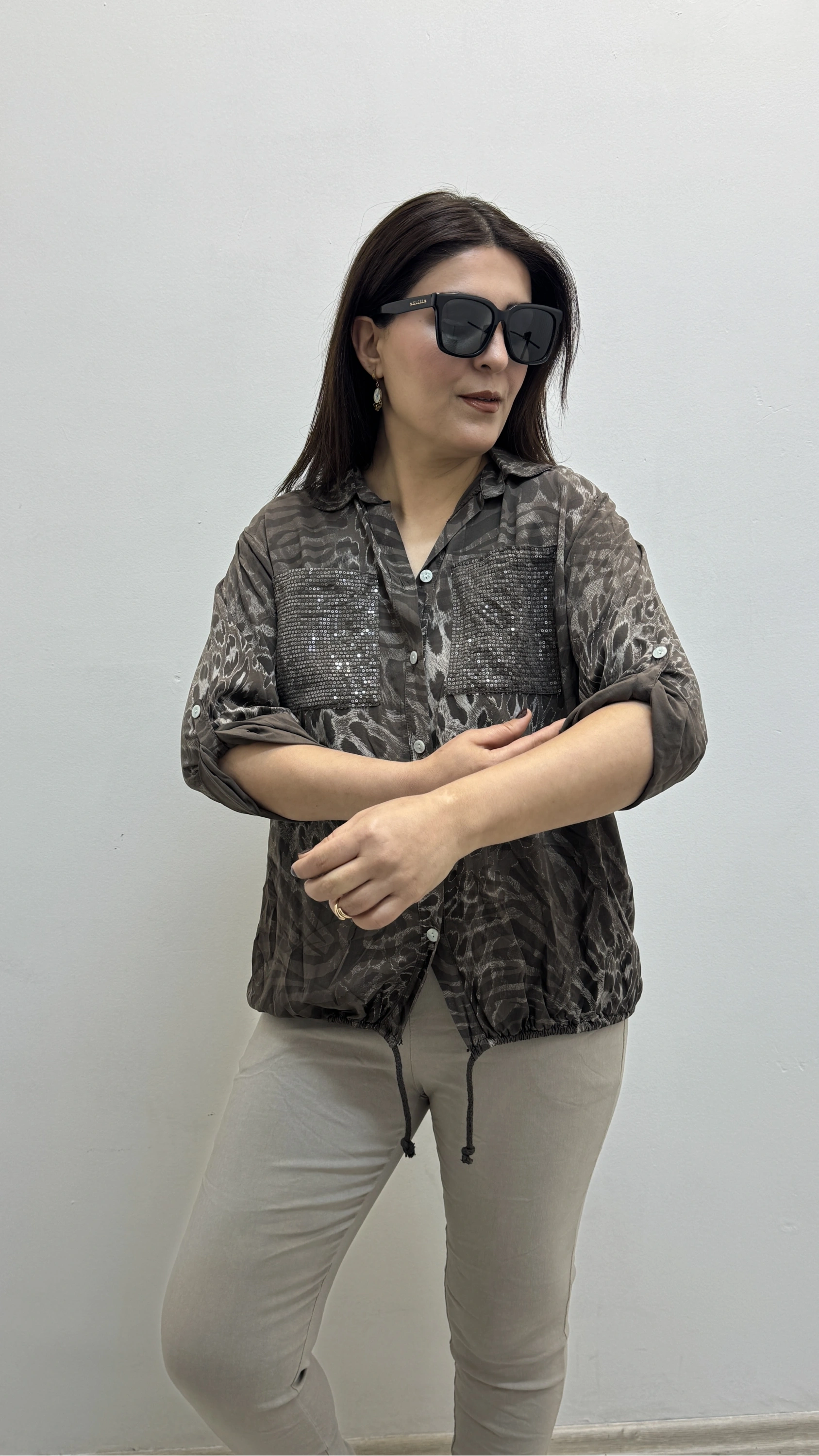 Etek Ucu Bağlamalı Payetli Leopar Desenli Kahverengi İthal Gömlek Hakkında