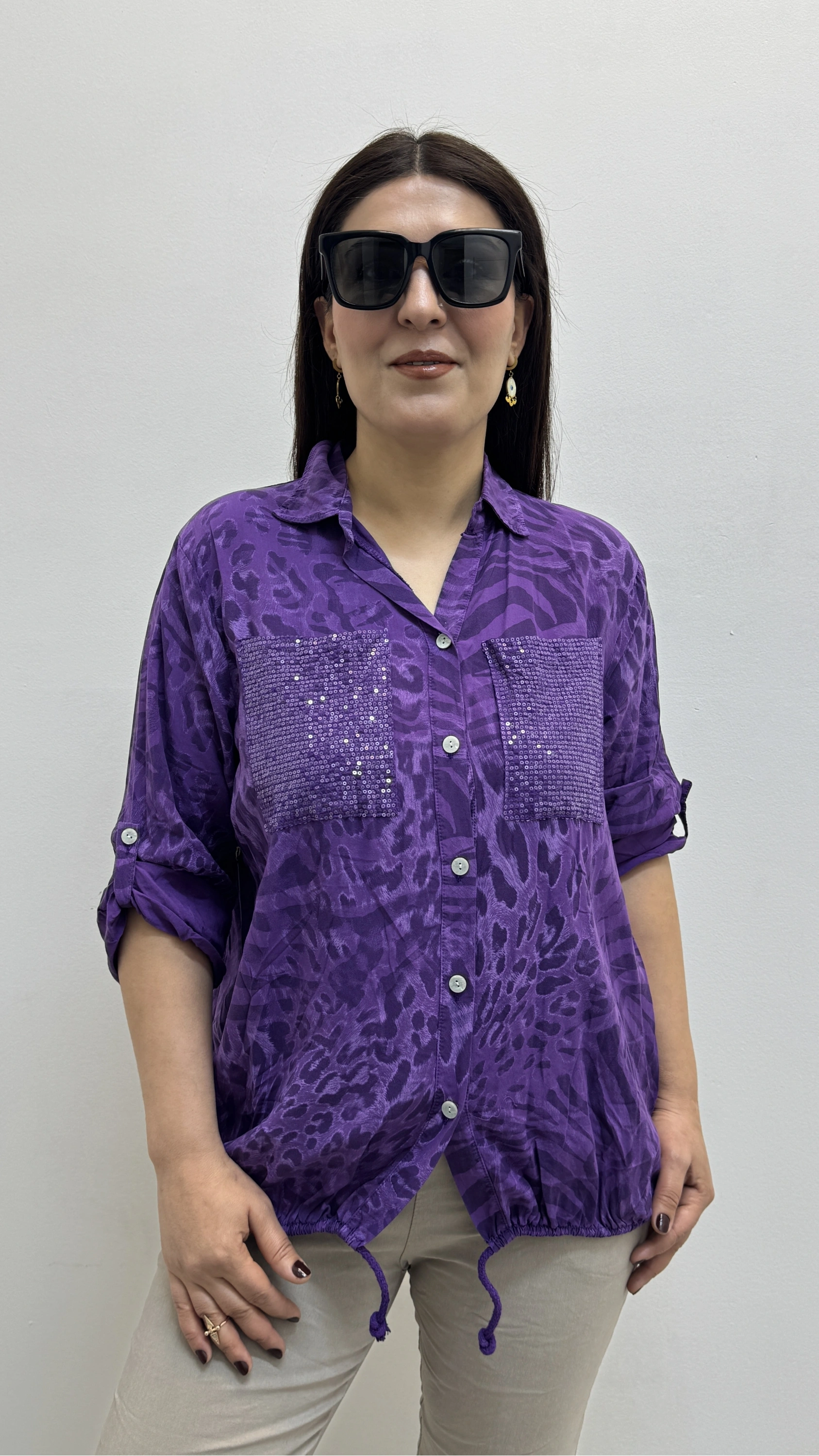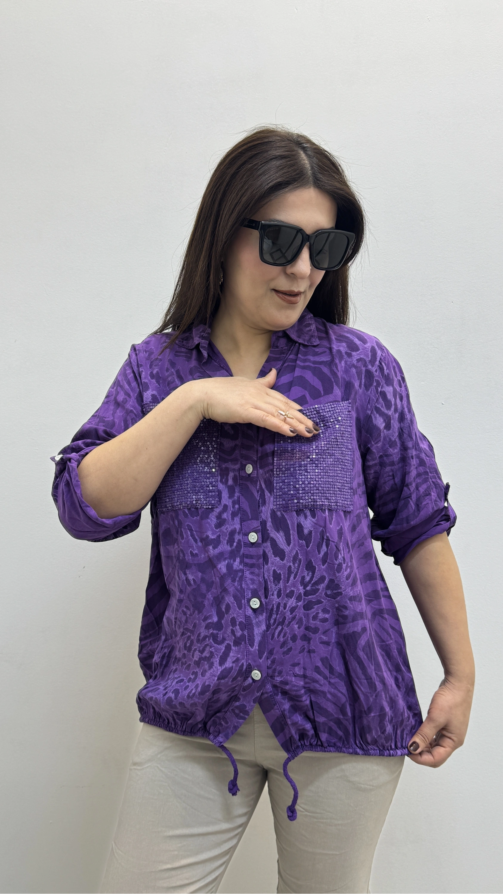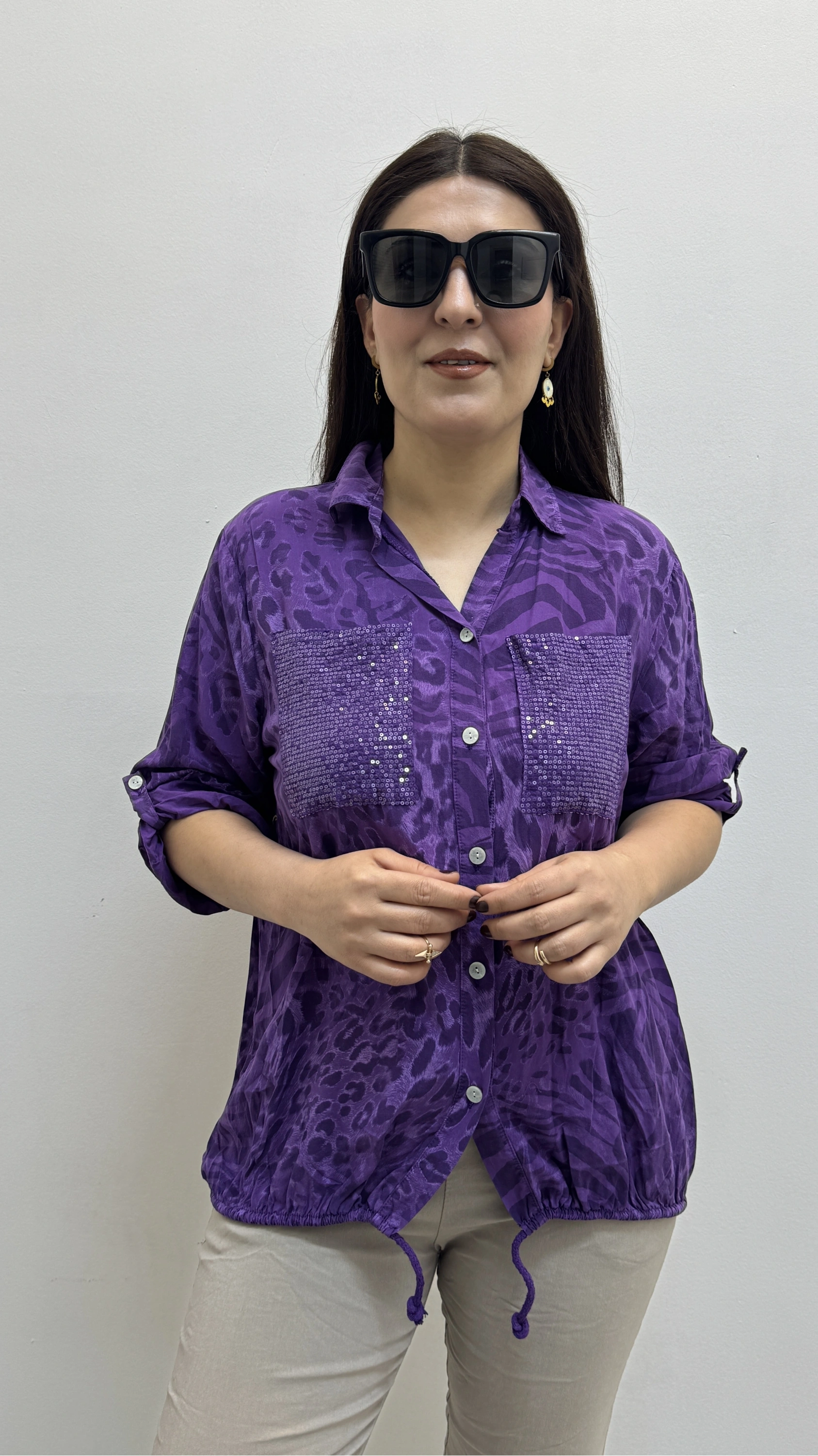 Etek Ucu Bağlamalı Payetli Leopar Desenli Mor İthal Gömlek