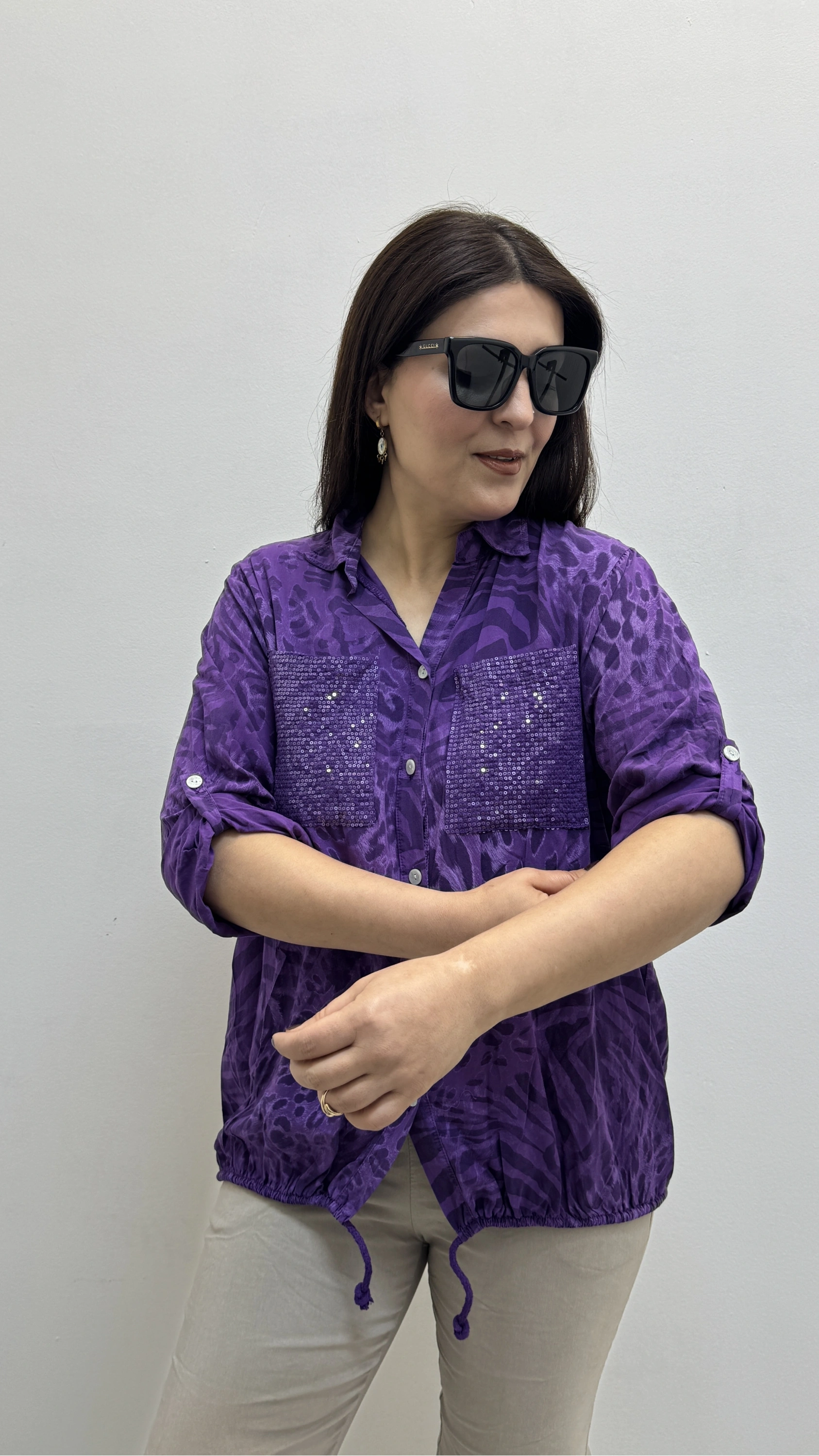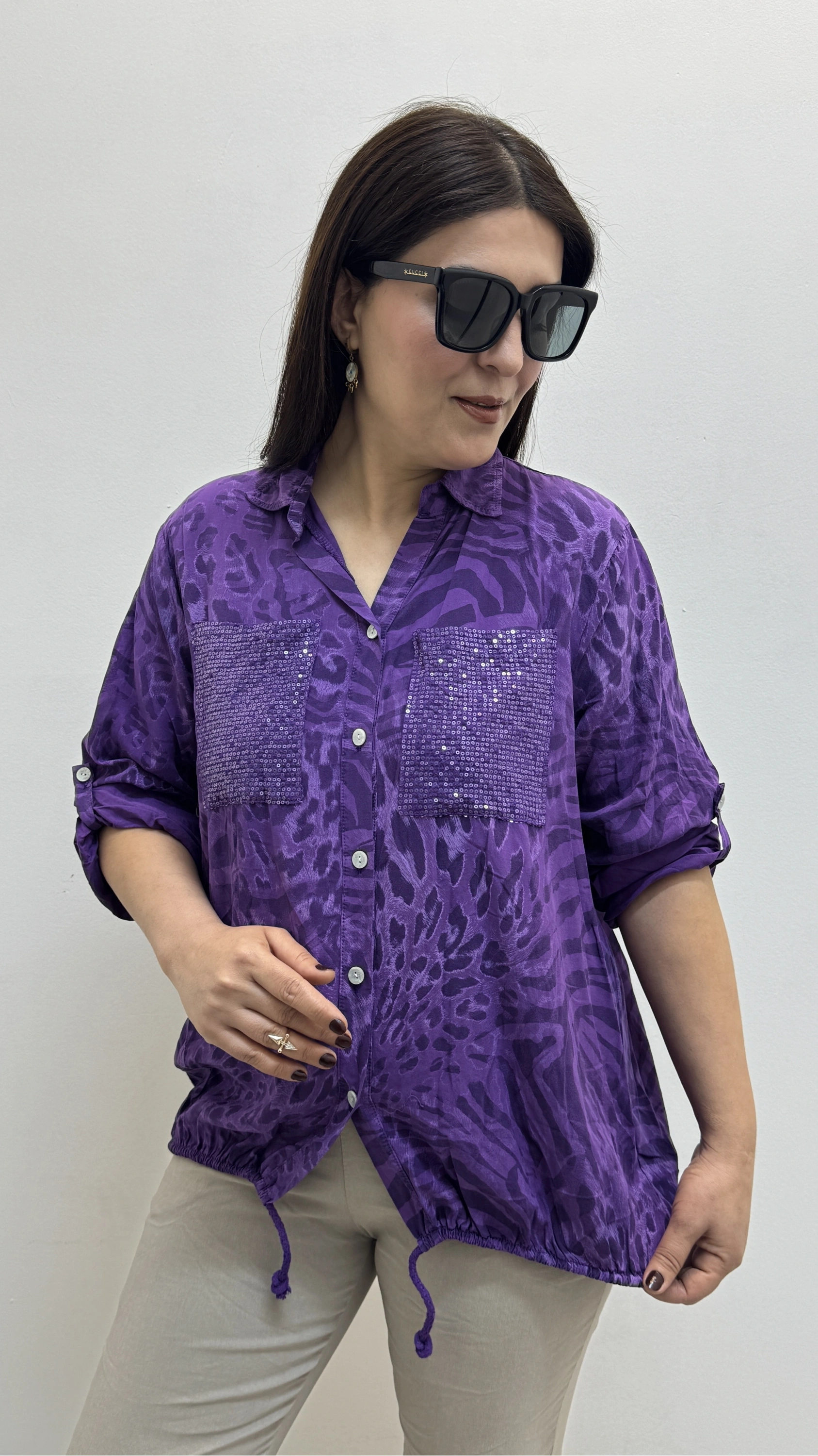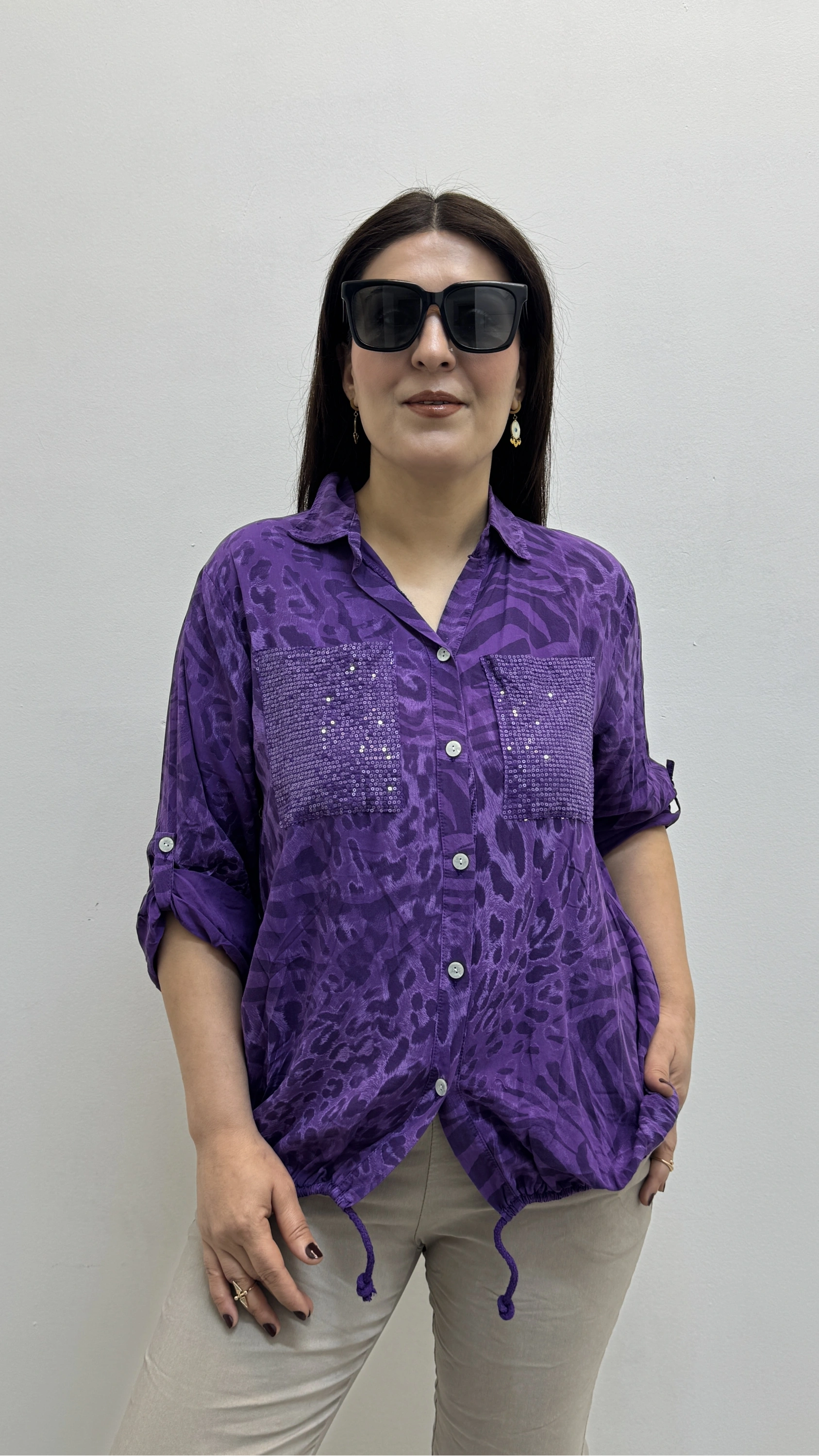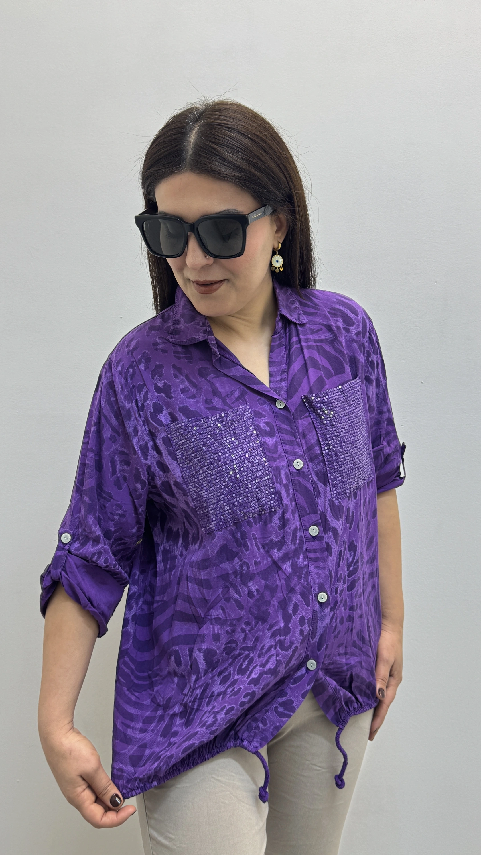 Etek Ucu Bağlamalı Payetli Leopar Desenli Mor İthal Gömlek