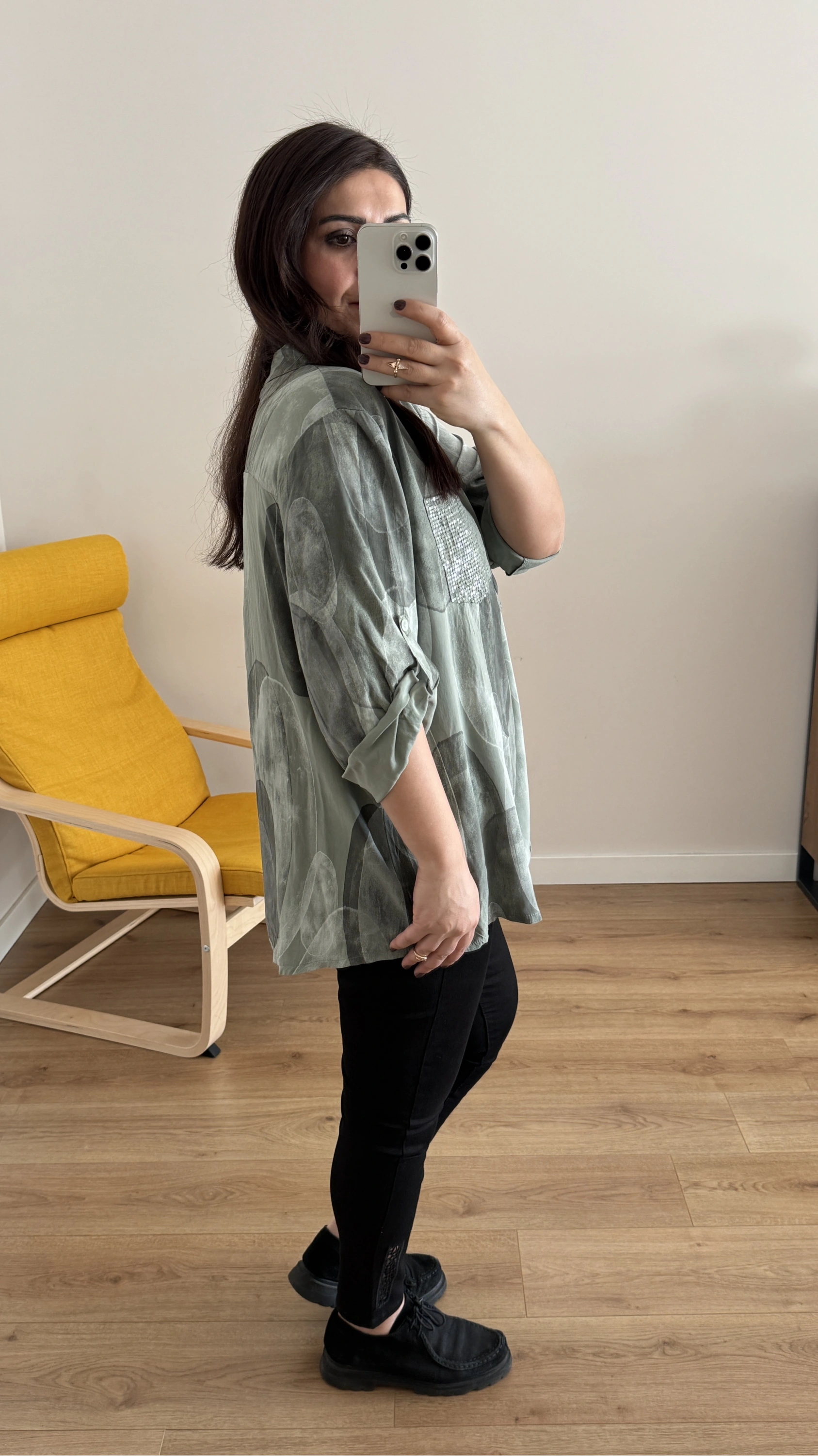 Hakim Yaka Pul Payet Desenli Haki Yeşil İthal Gömlek