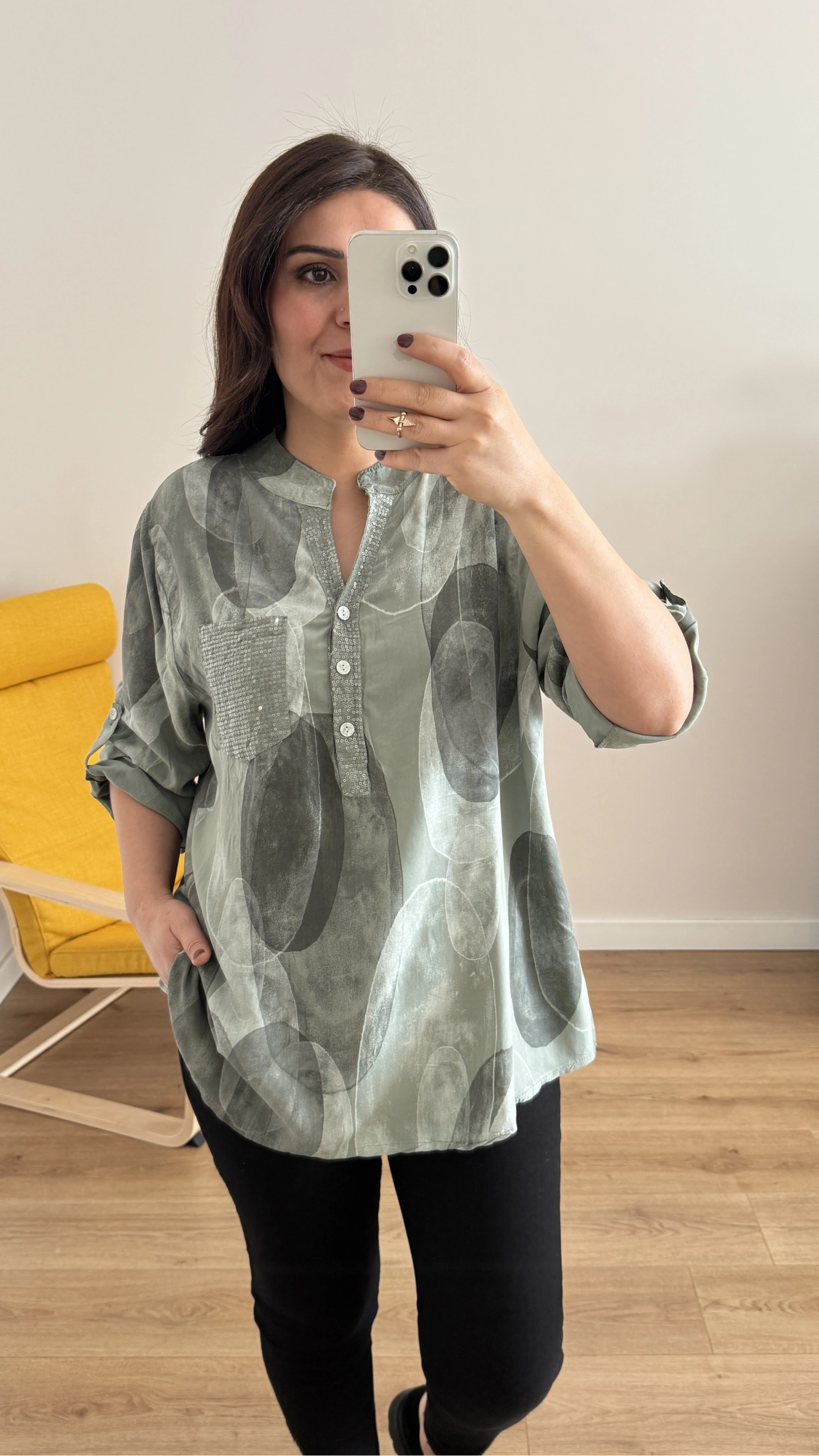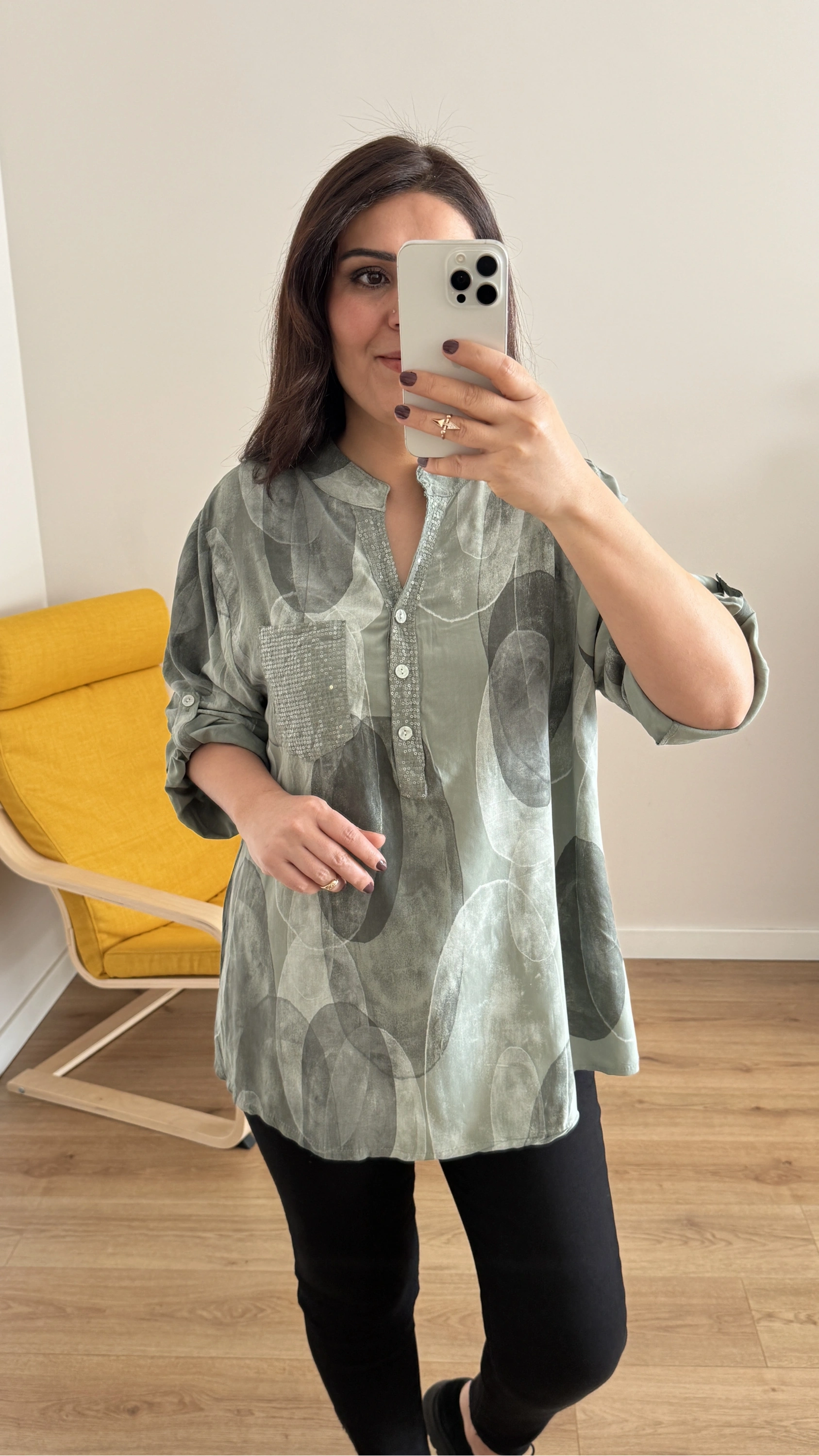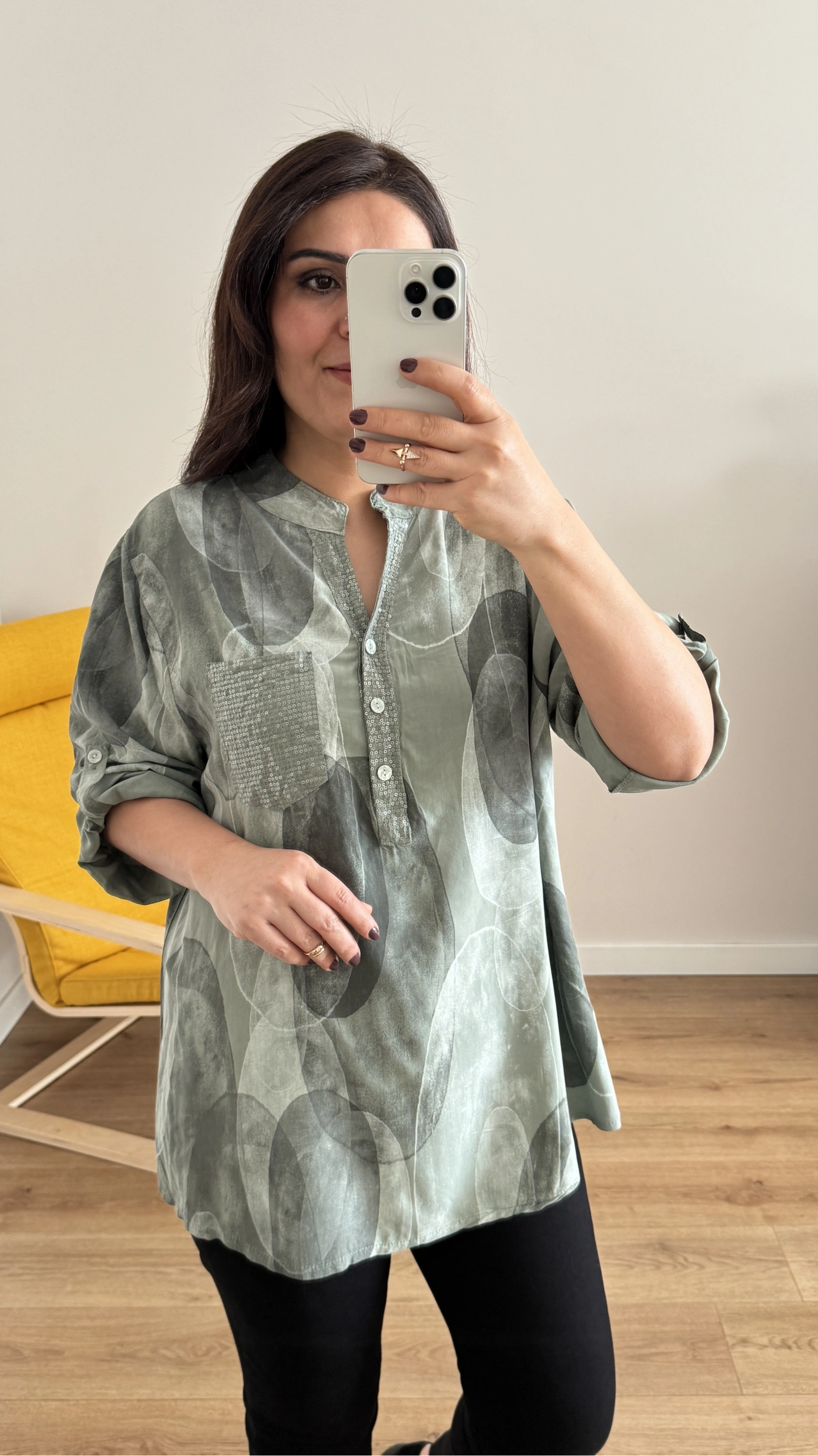 Hakim Yaka Pul Payet Desenli Haki Yeşil İthal Gömlek Hakkında