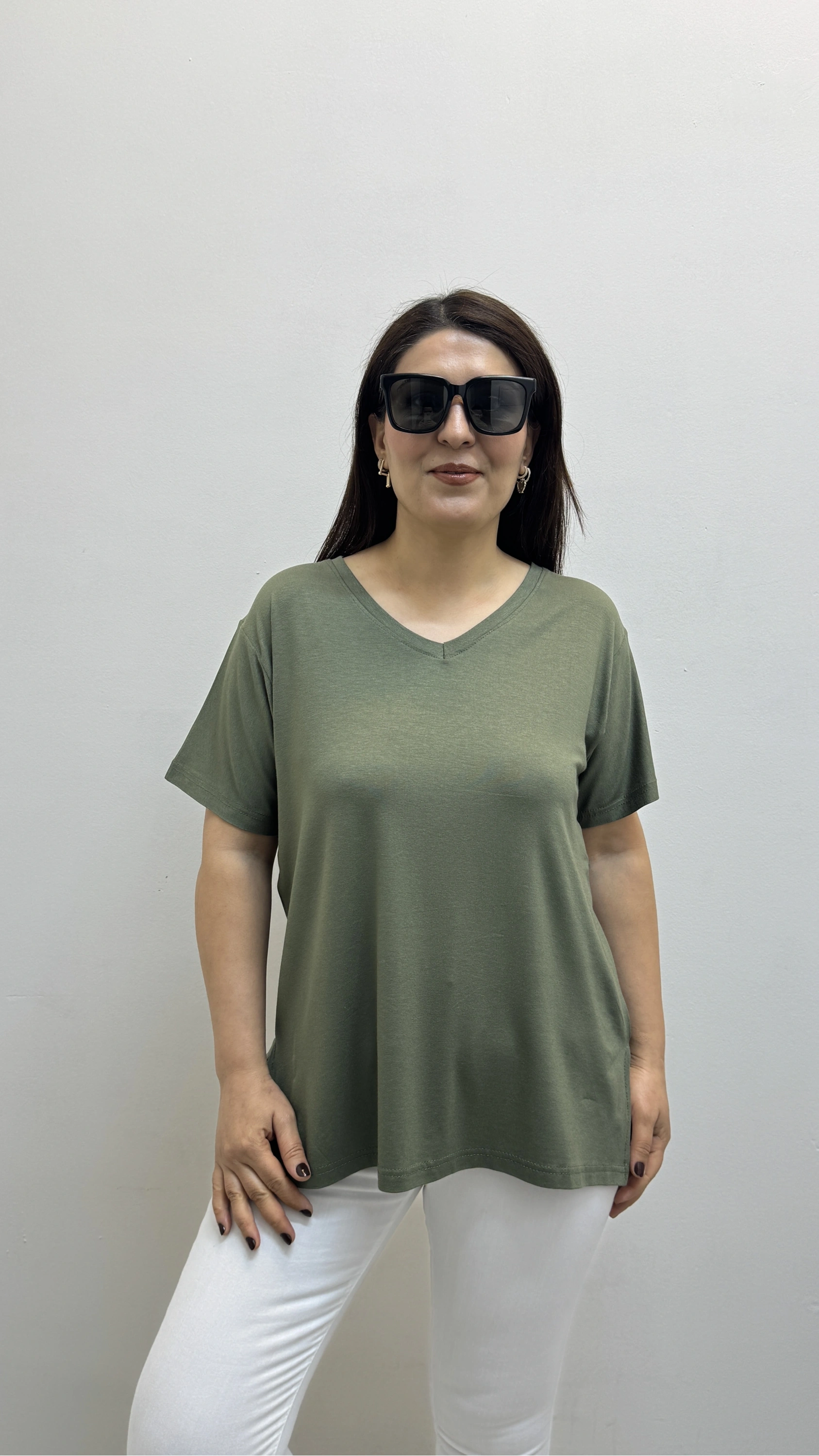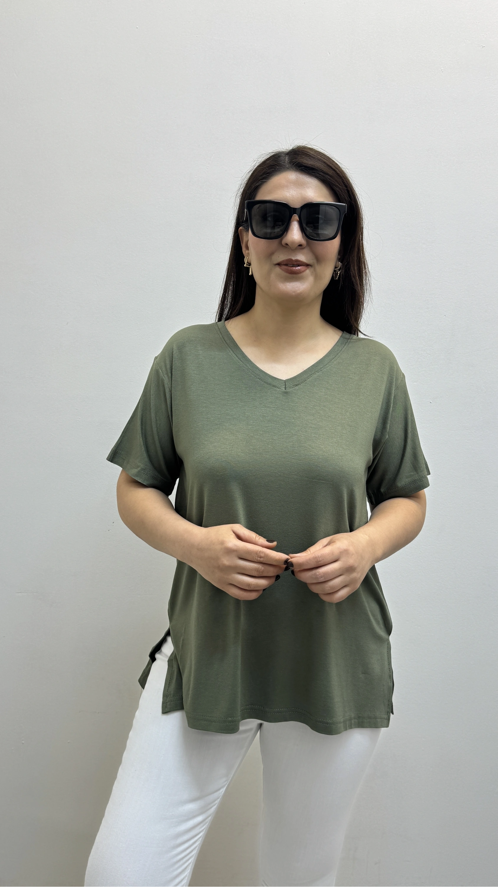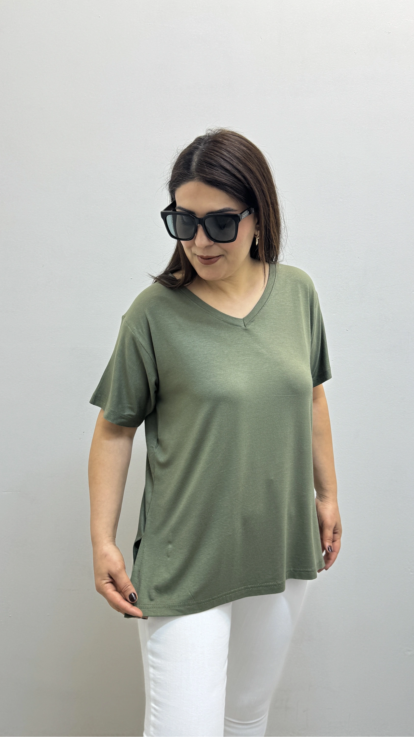 İki Yandan Yırtmaçlı V Yaka Haki Yeşil Basic Tişört Hakkında