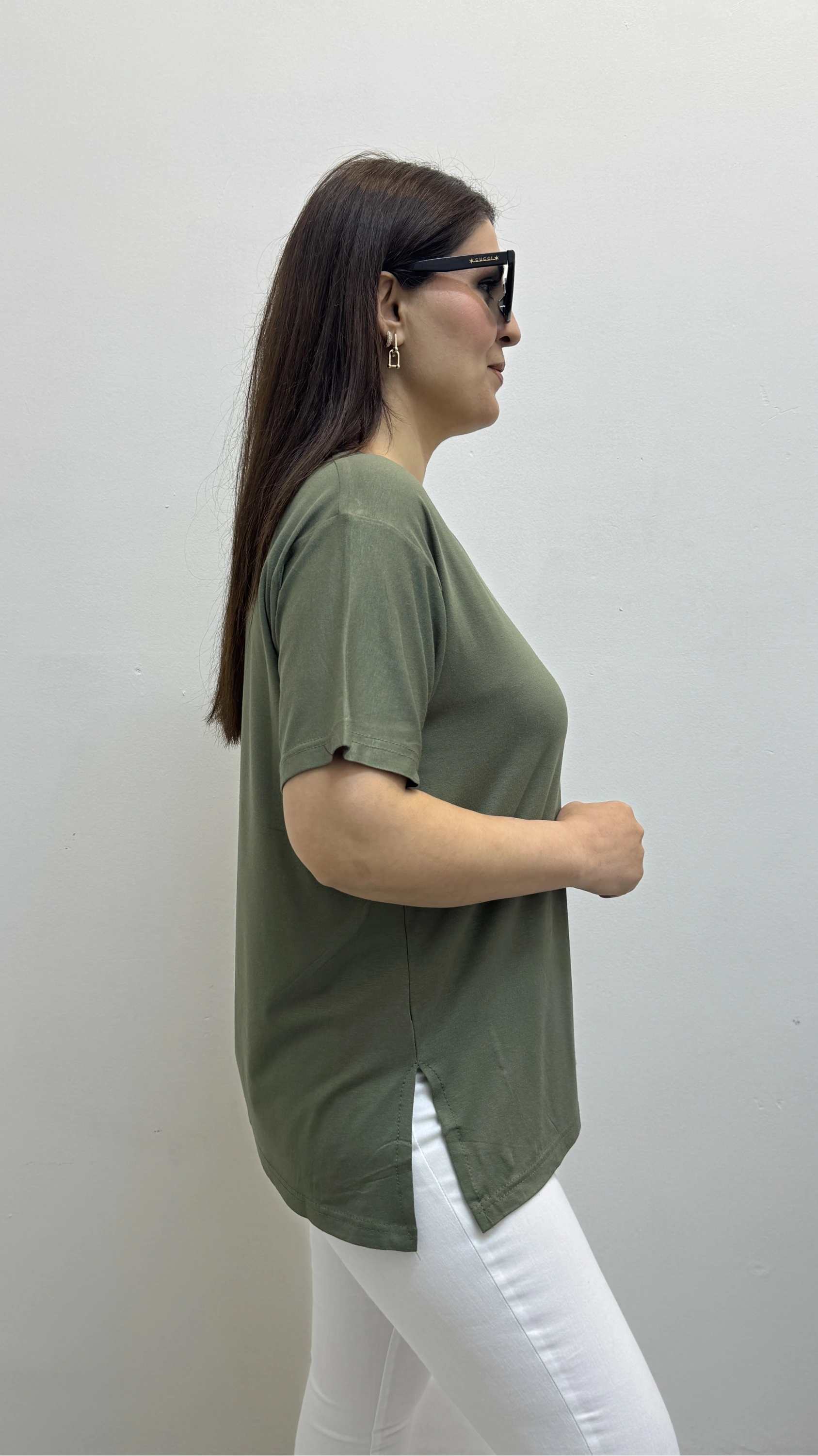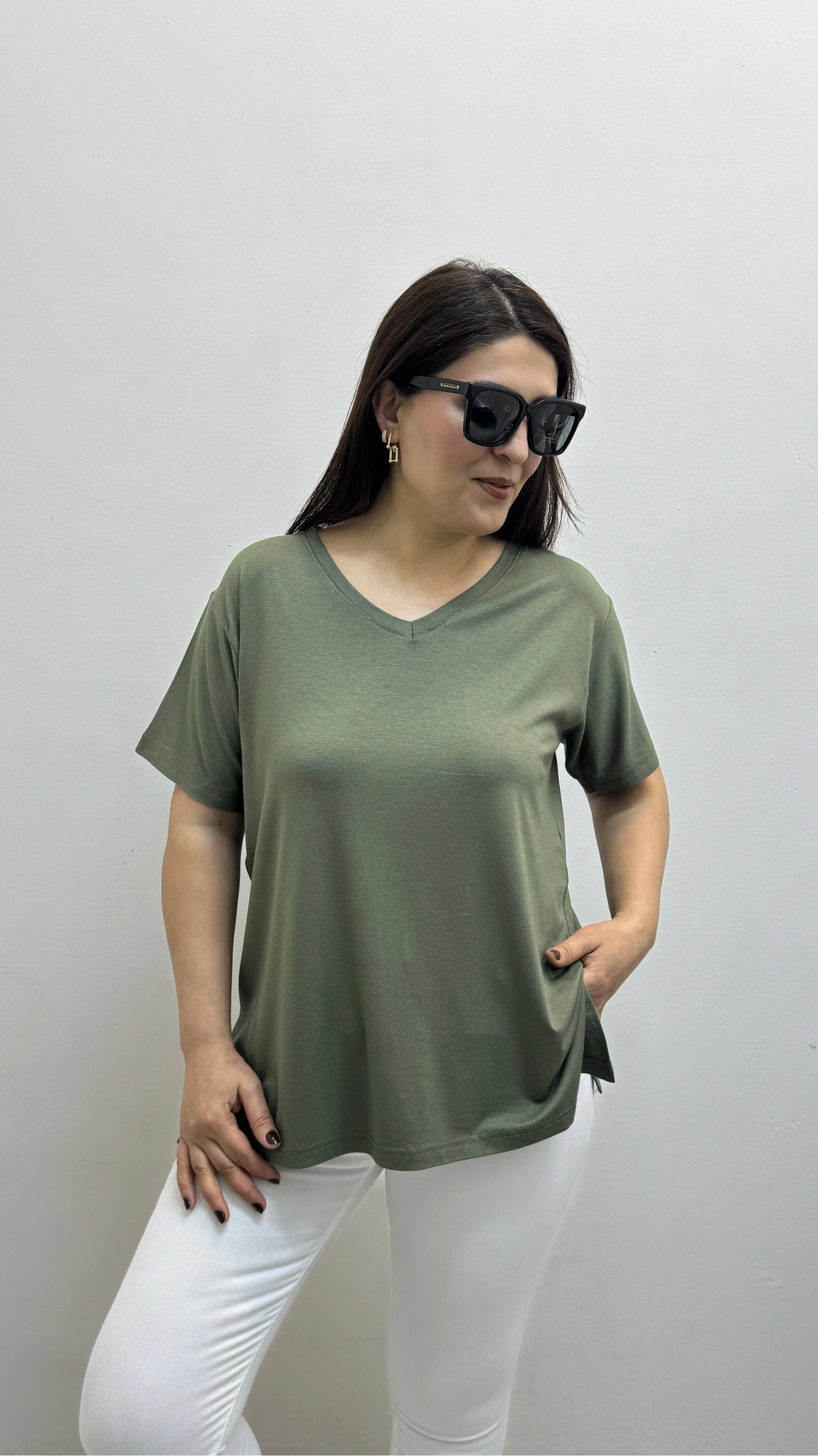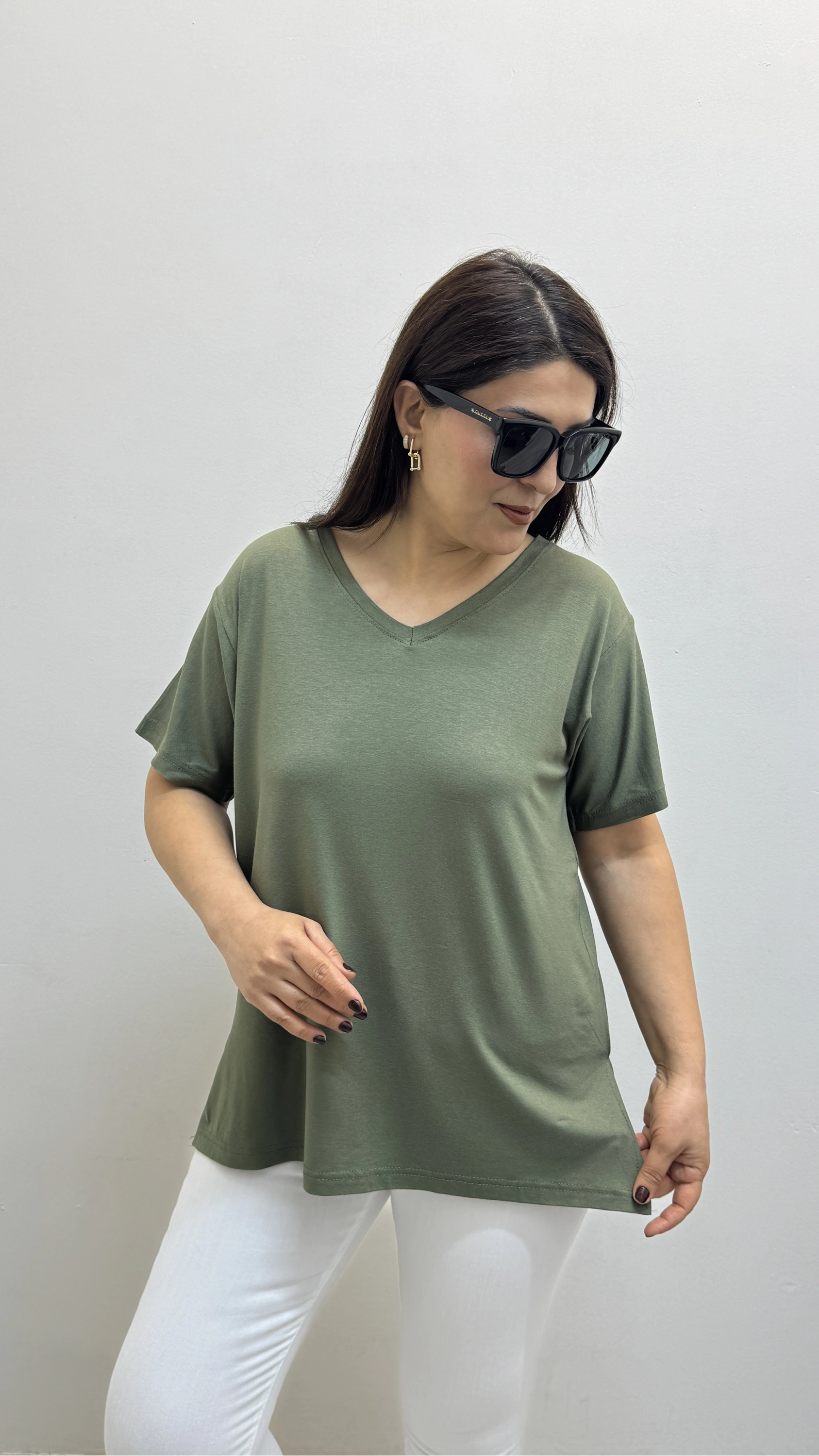 İki Yandan Yırtmaçlı V Yaka Haki Yeşil Basic Tişört Hakkında