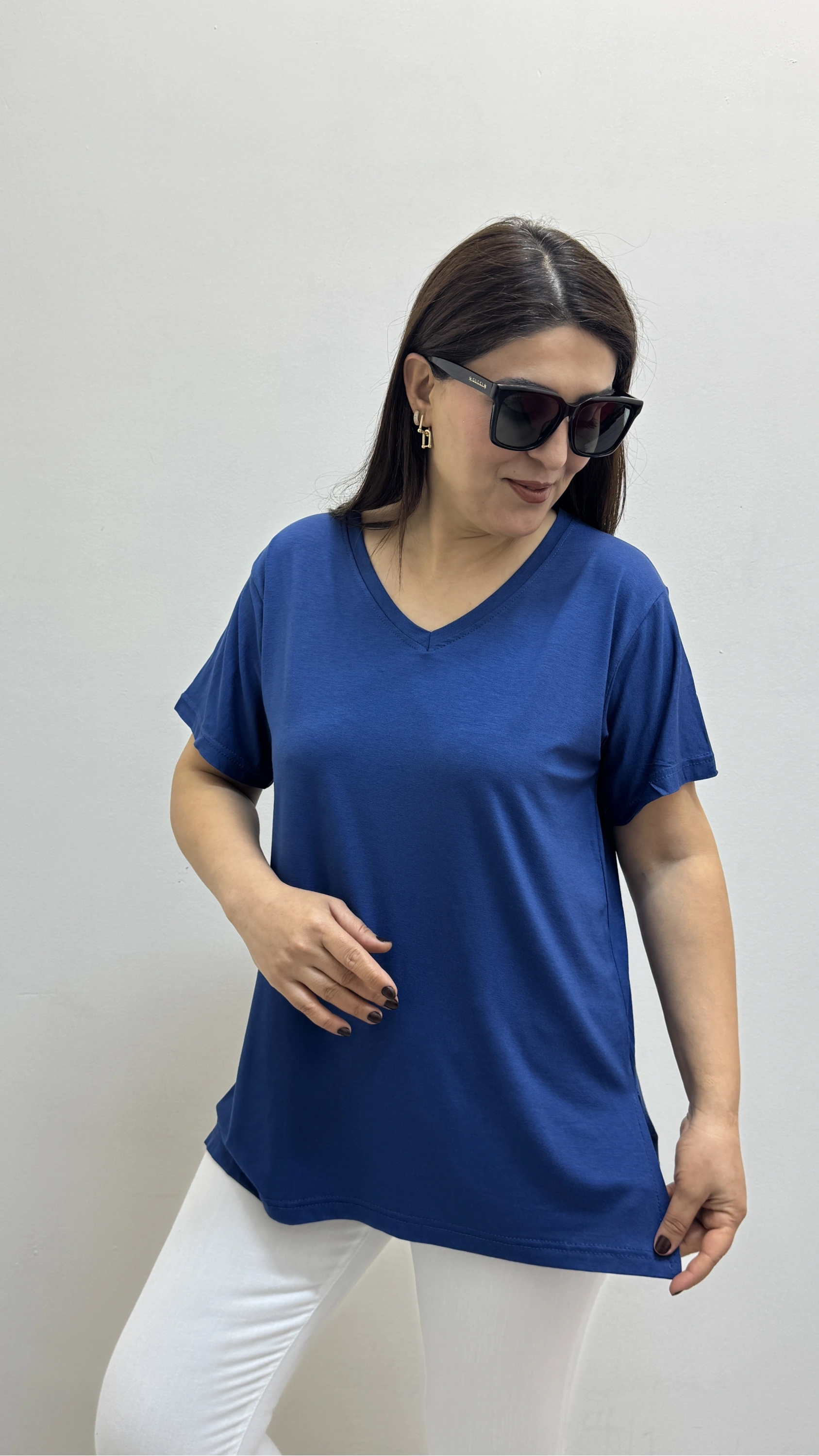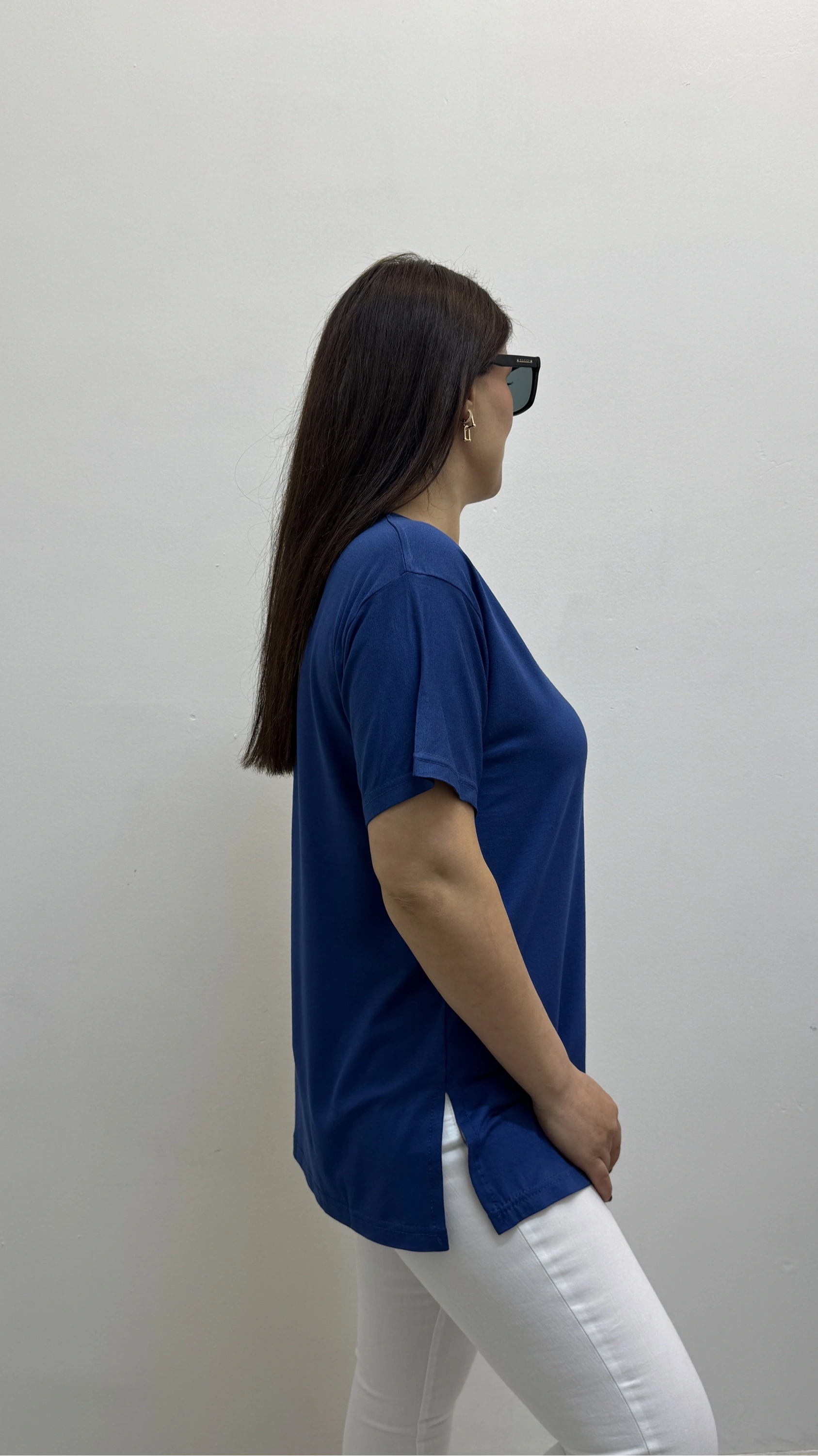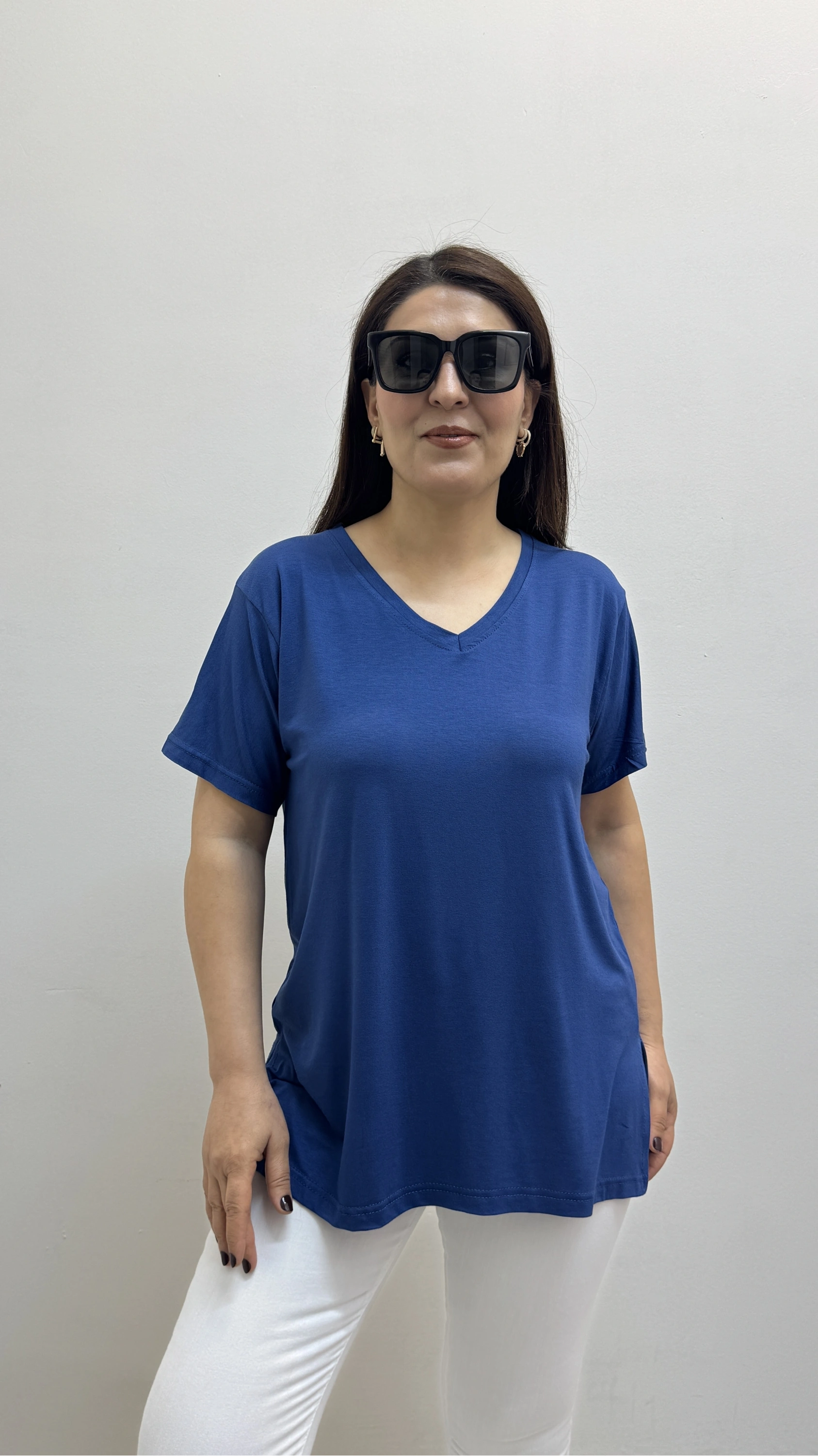 İki Yandan Yırtmaçlı V Yaka İndigo Mavi Basic Tişört Hakkında