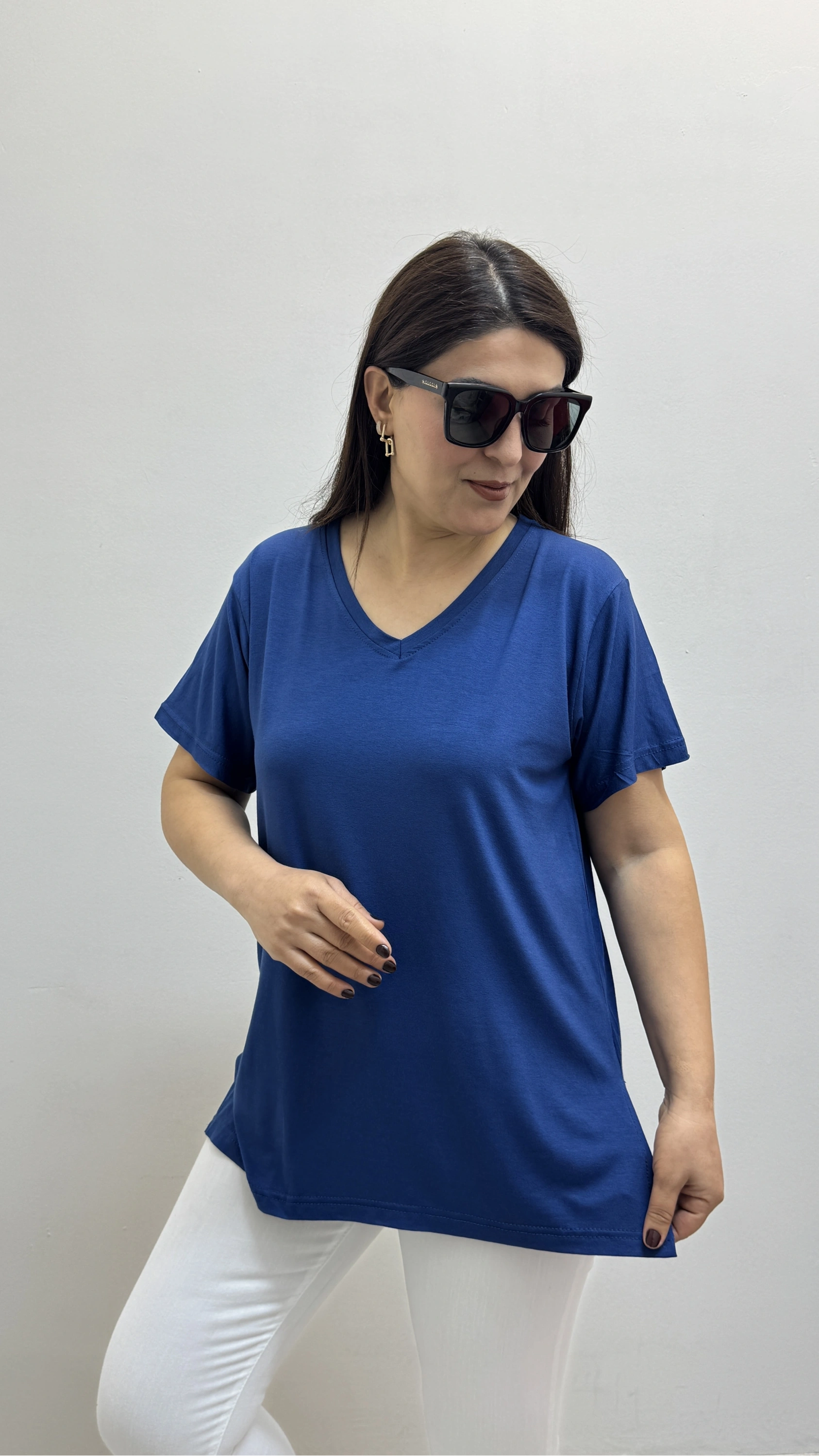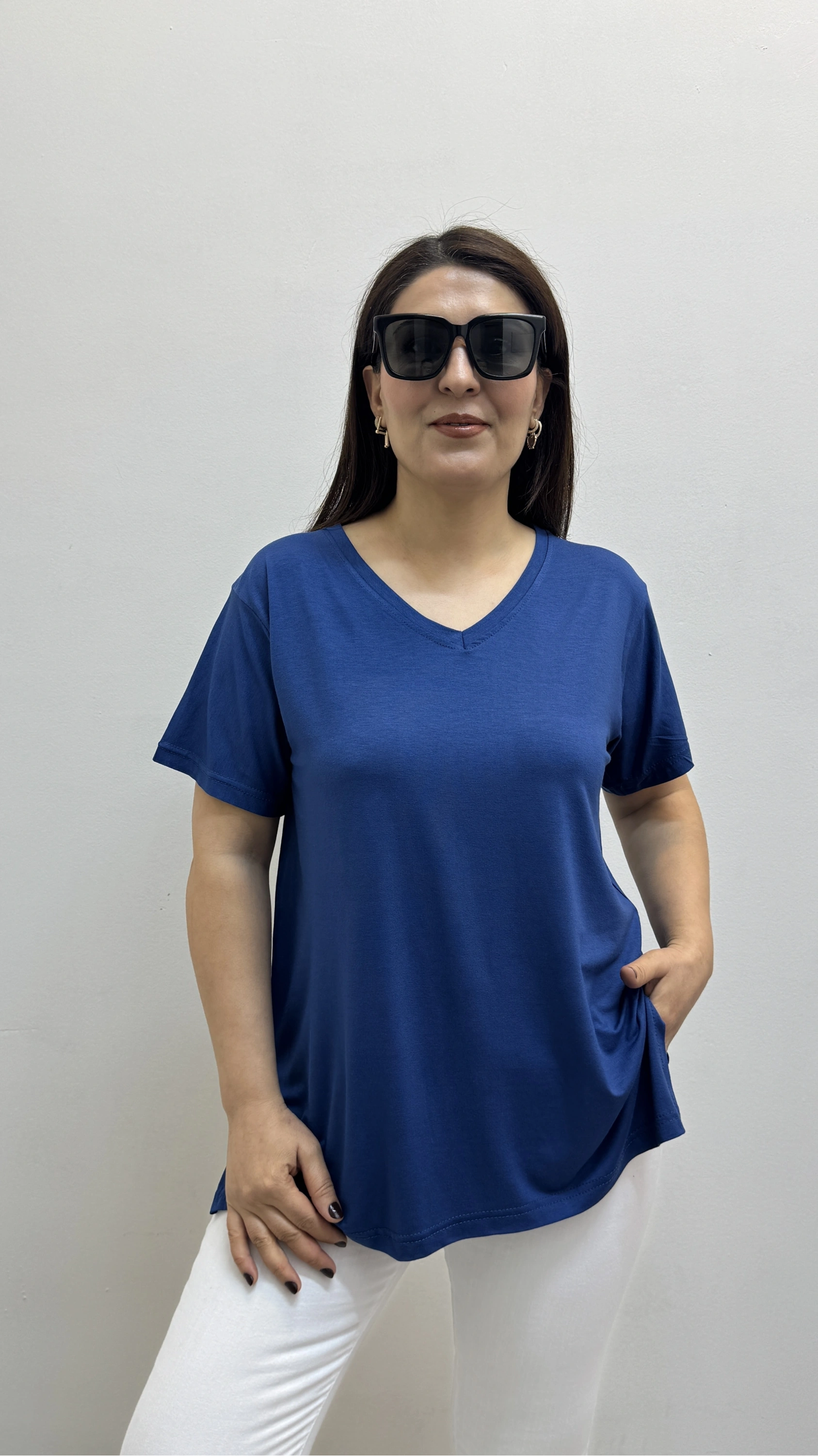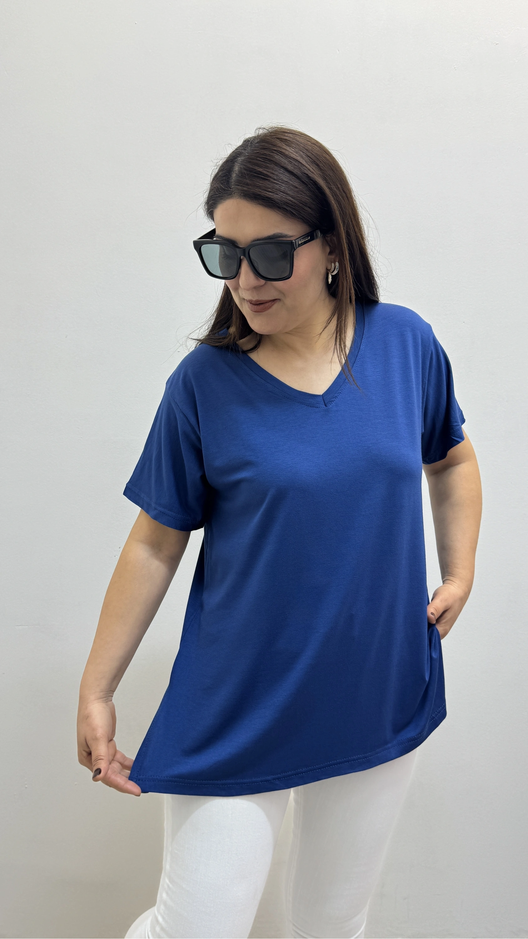 İki Yandan Yırtmaçlı V Yaka İndigo Mavi Basic Tişört Hakkında