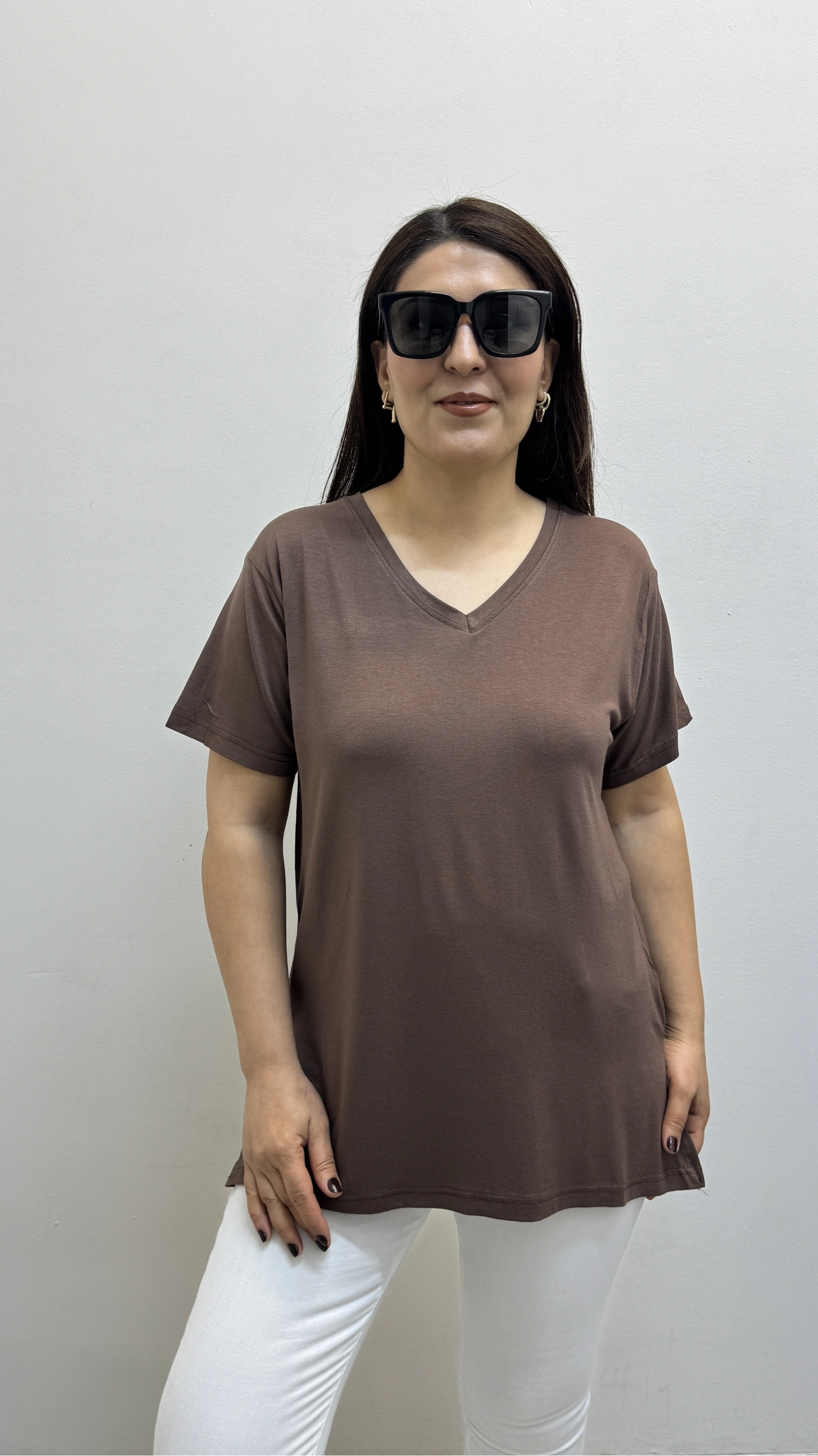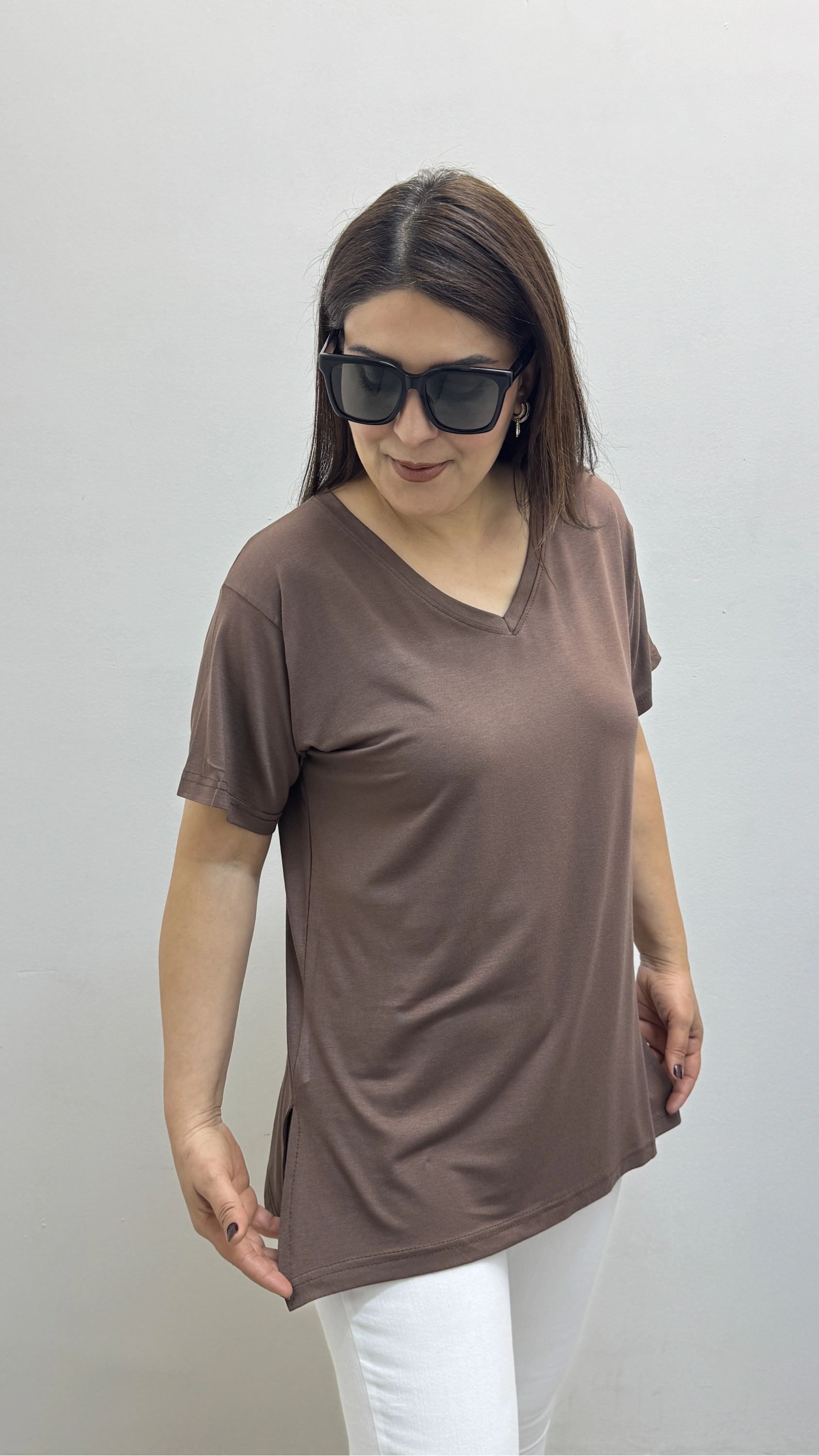 İki Yandan Yırtmaçlı V Yaka Kahverengi Basic Tişört