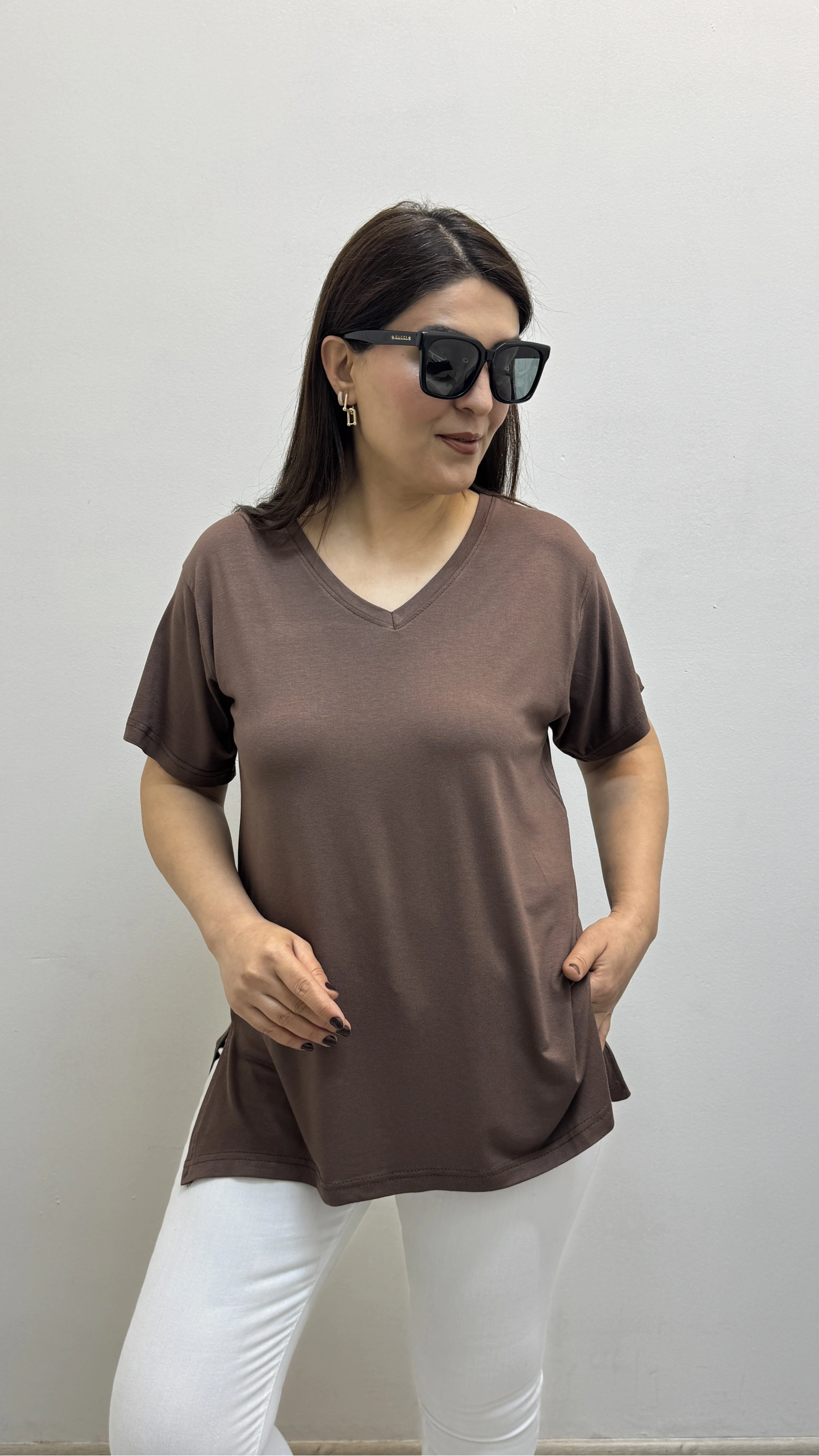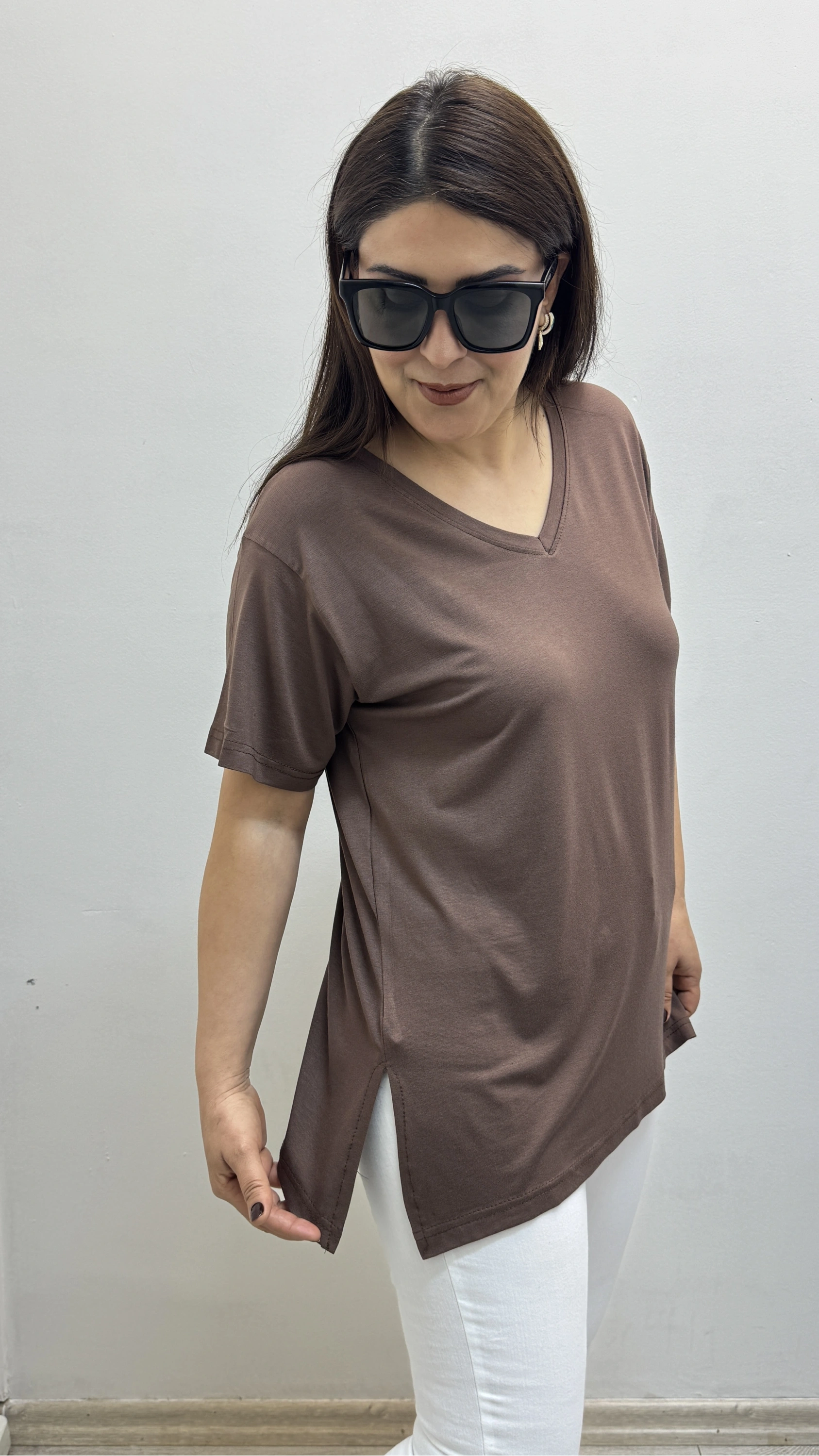 İki Yandan Yırtmaçlı V Yaka Kahverengi Basic Tişört Hakkında