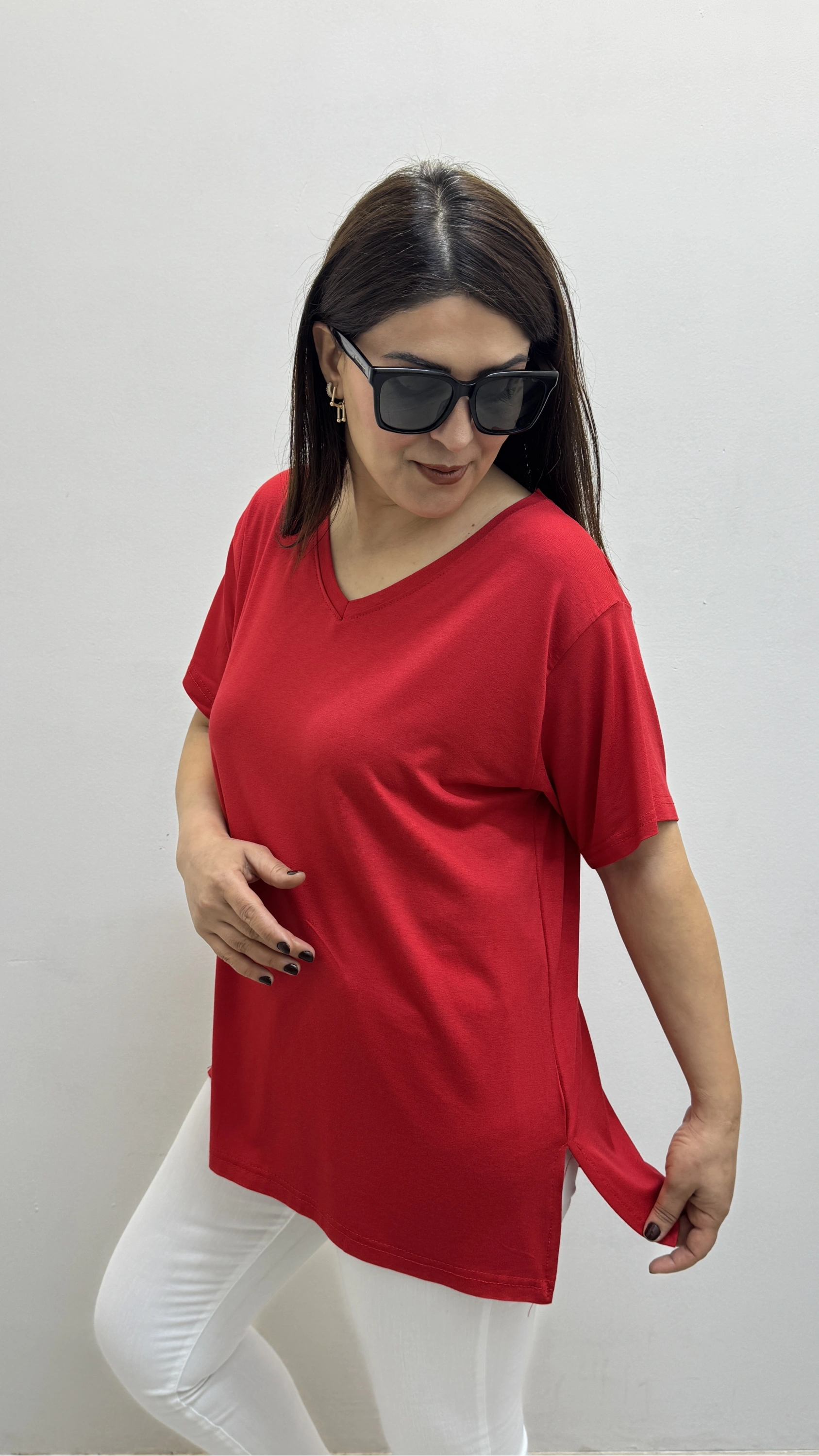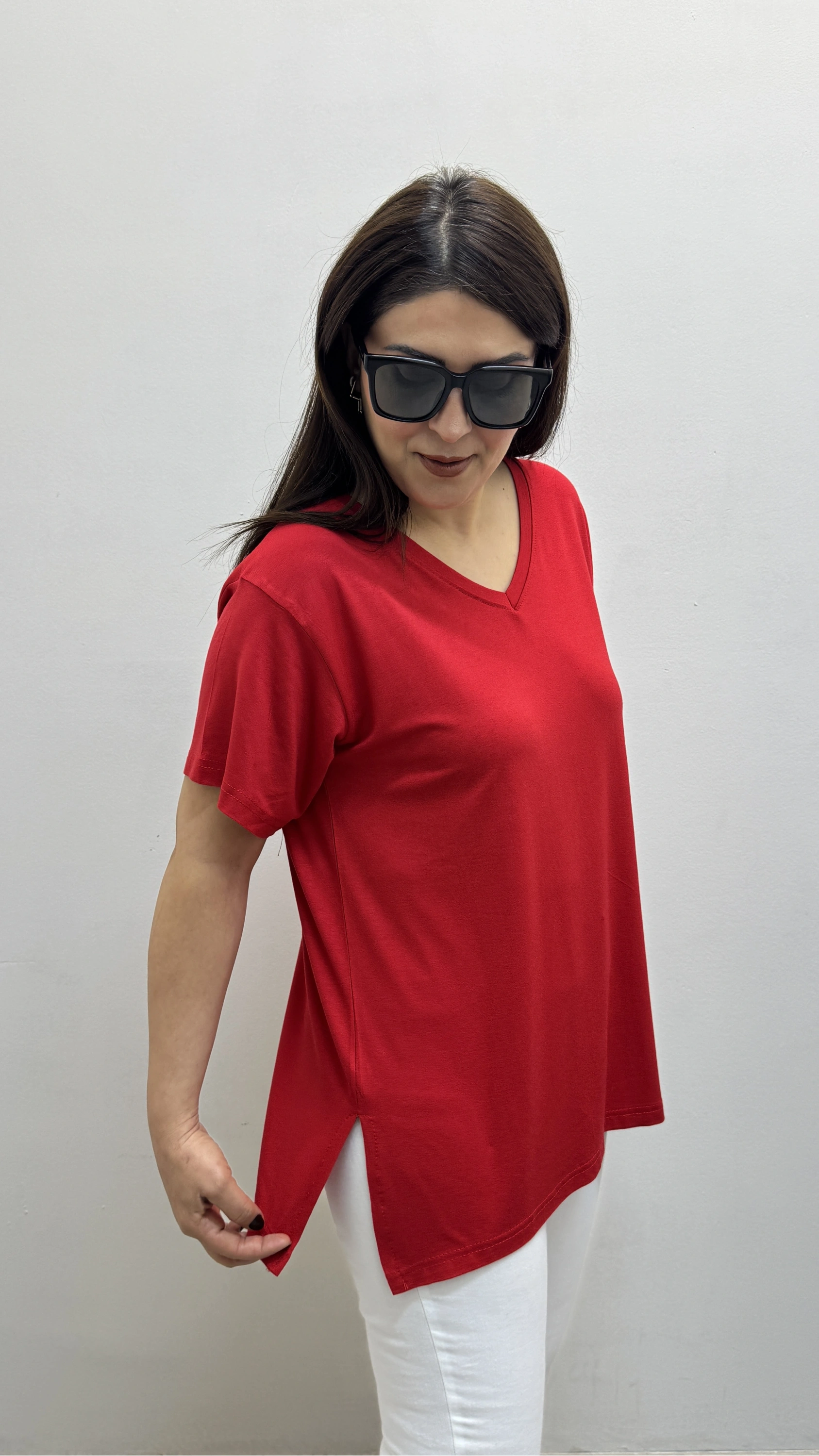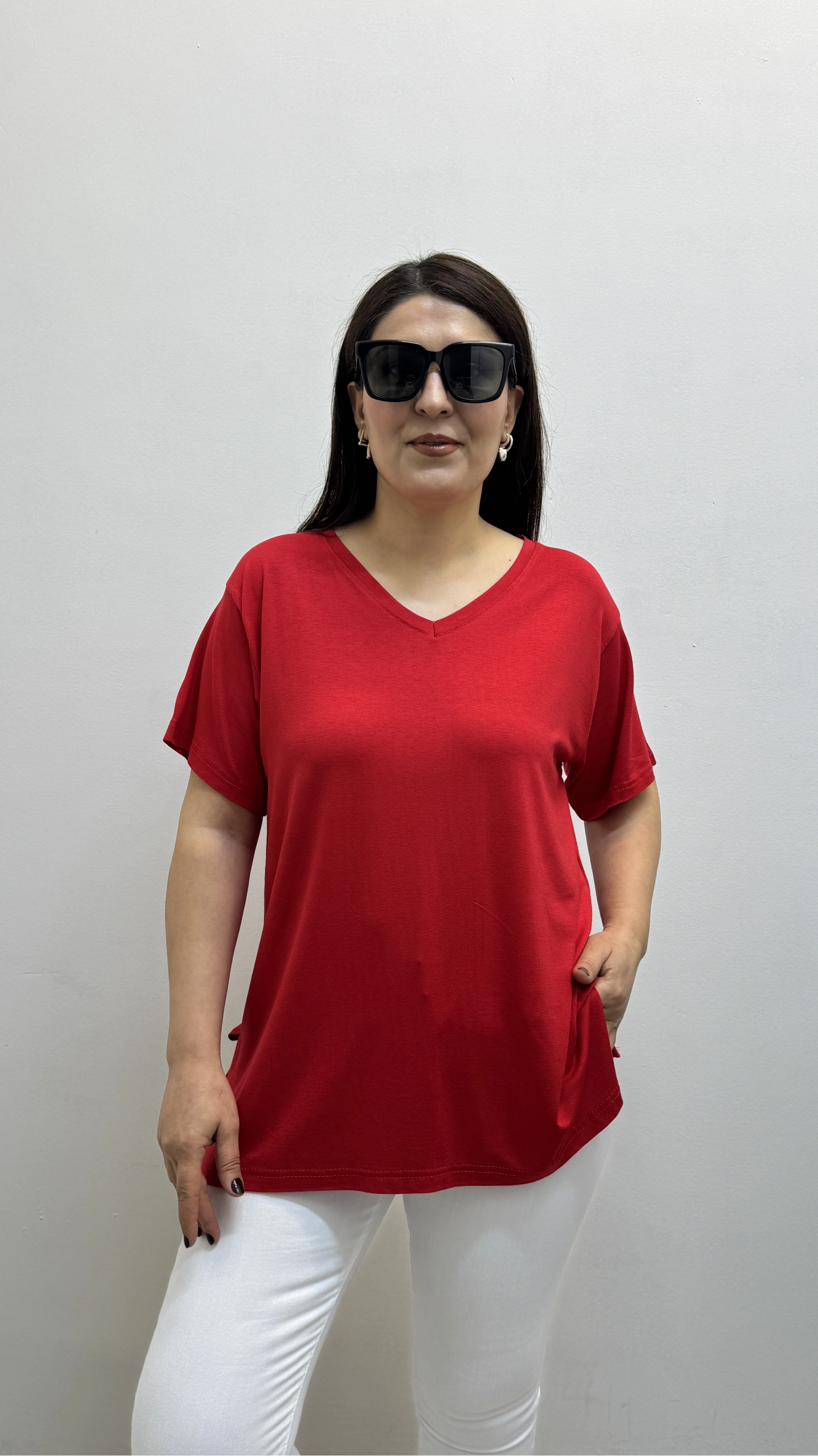 İki Yandan Yırtmaçlı V Yaka Kırmızı Basic Tişört