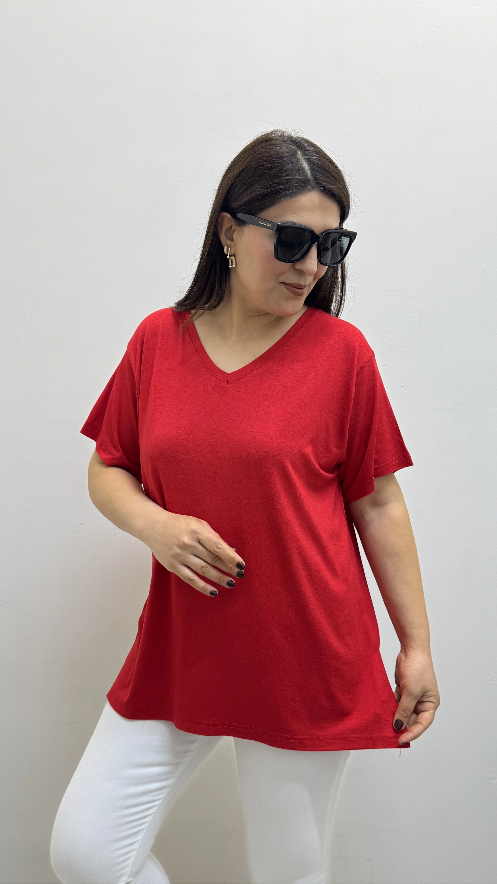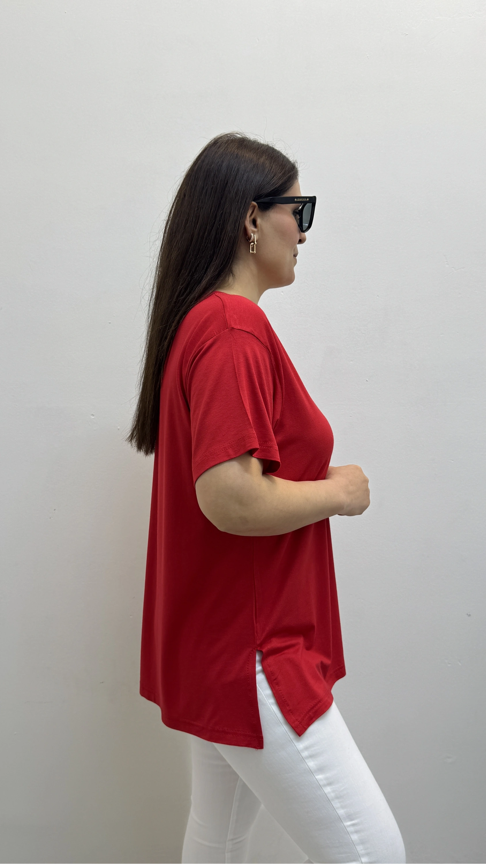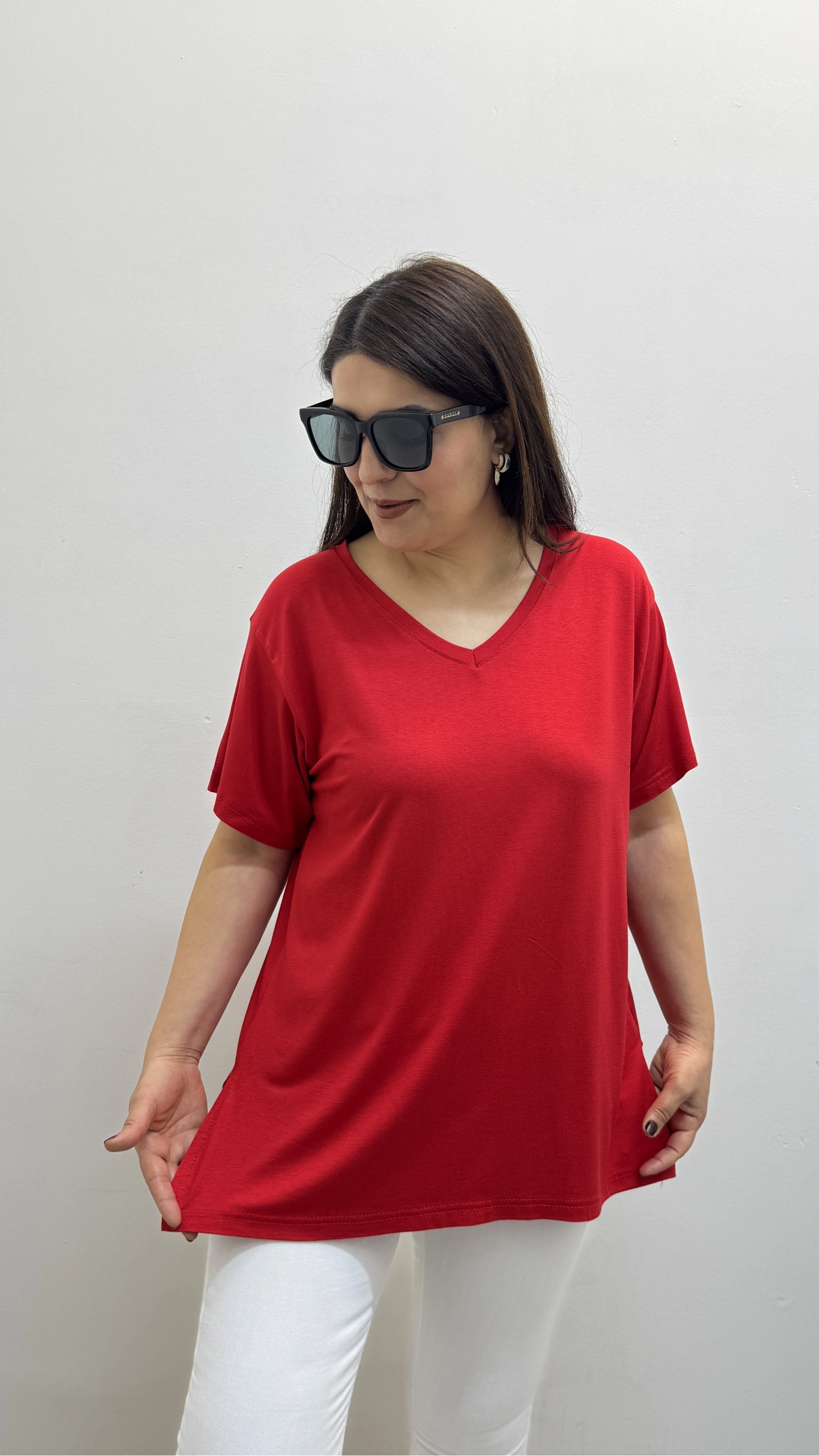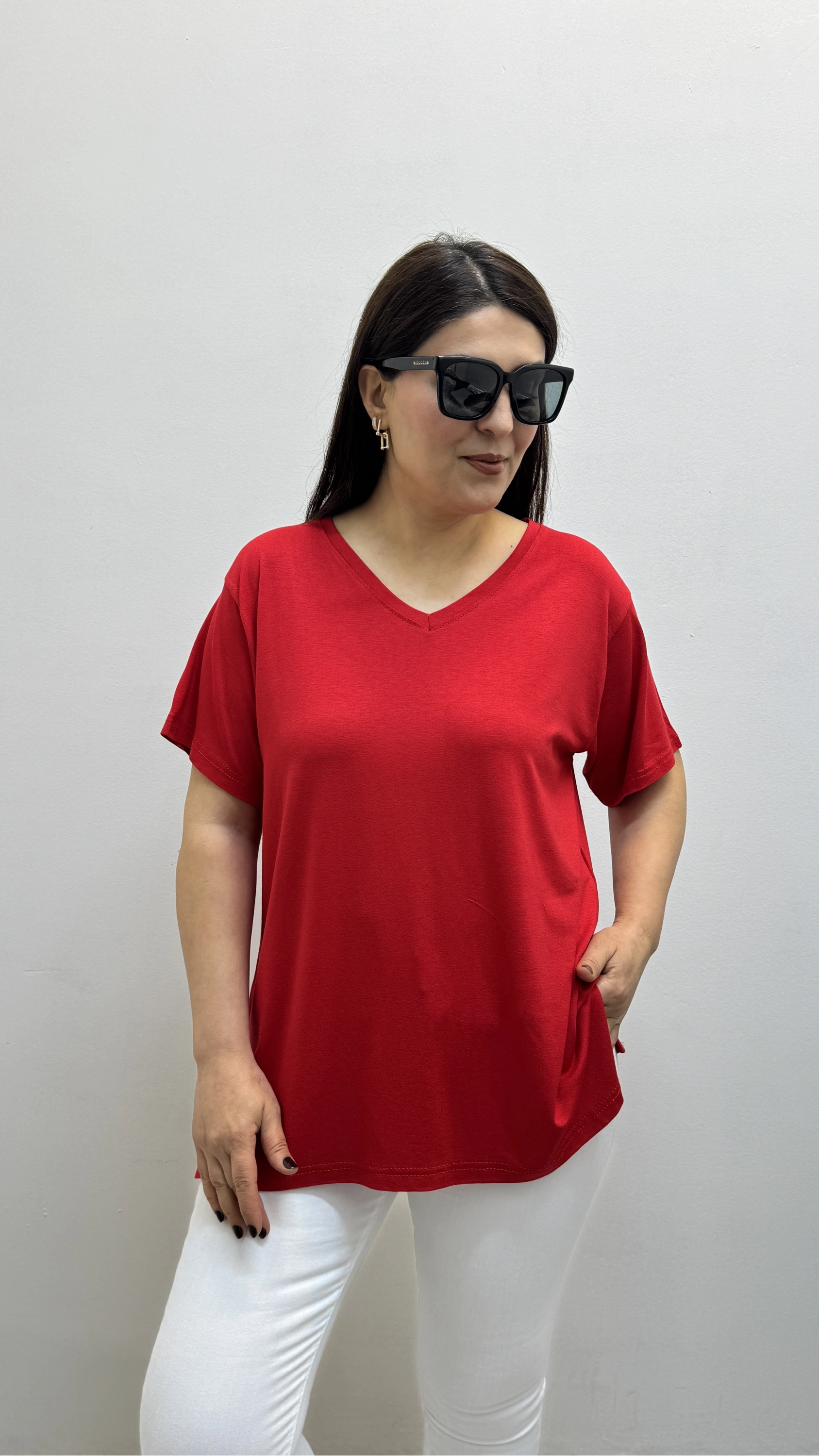 İki Yandan Yırtmaçlı V Yaka Kırmızı Basic Tişört