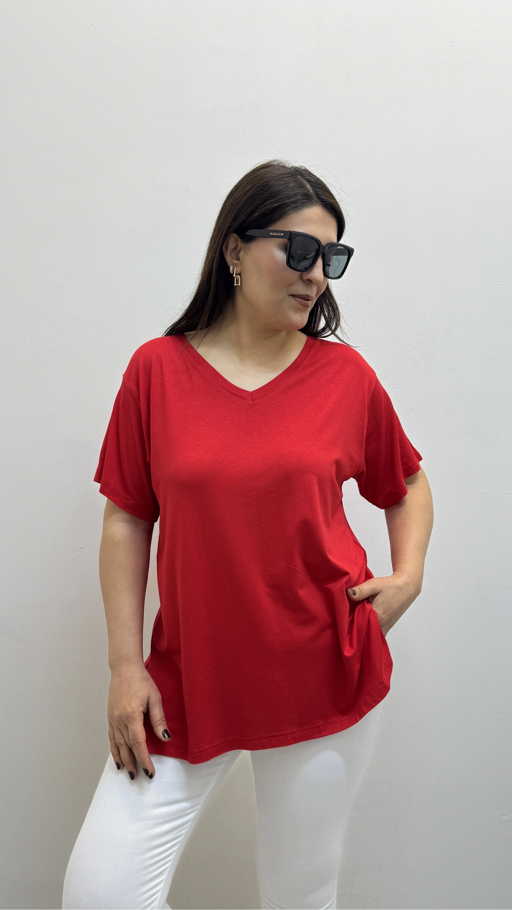 İki Yandan Yırtmaçlı V Yaka Kırmızı Basic Tişört Hakkında