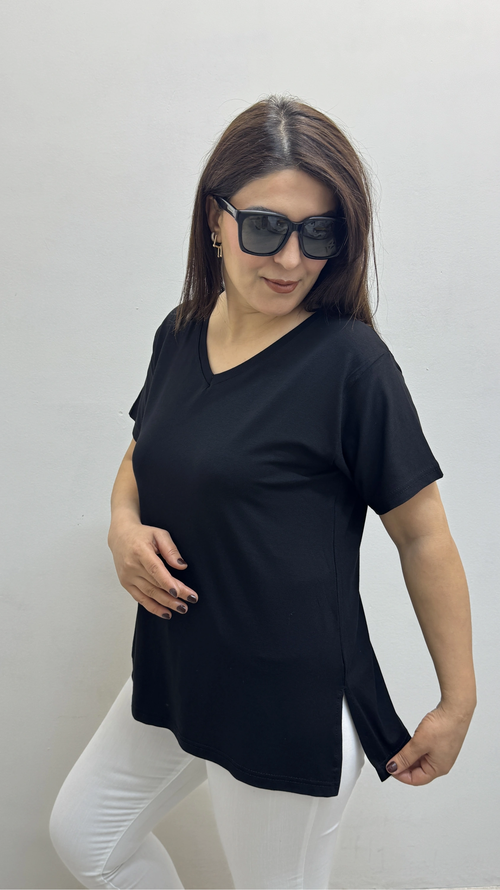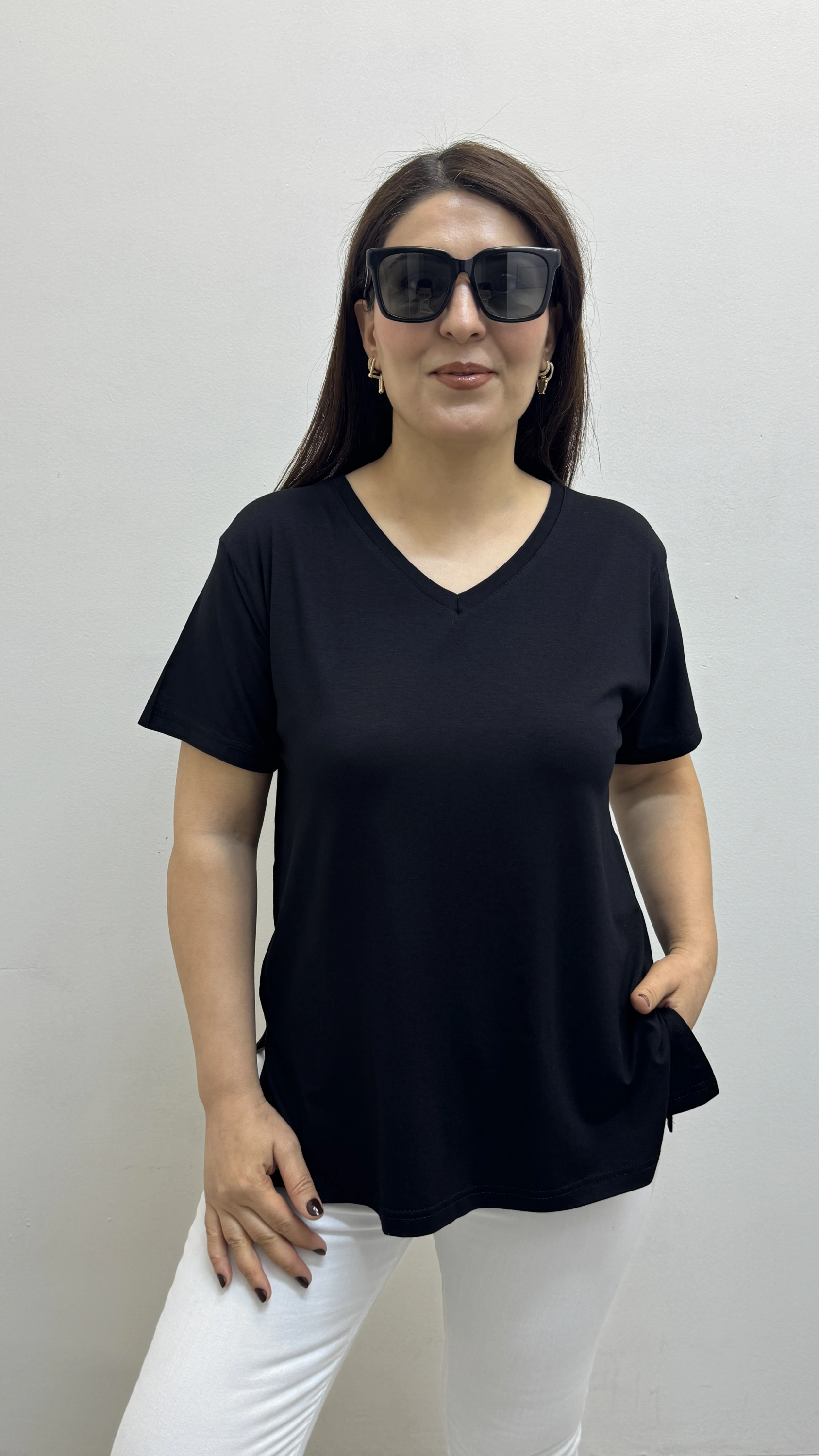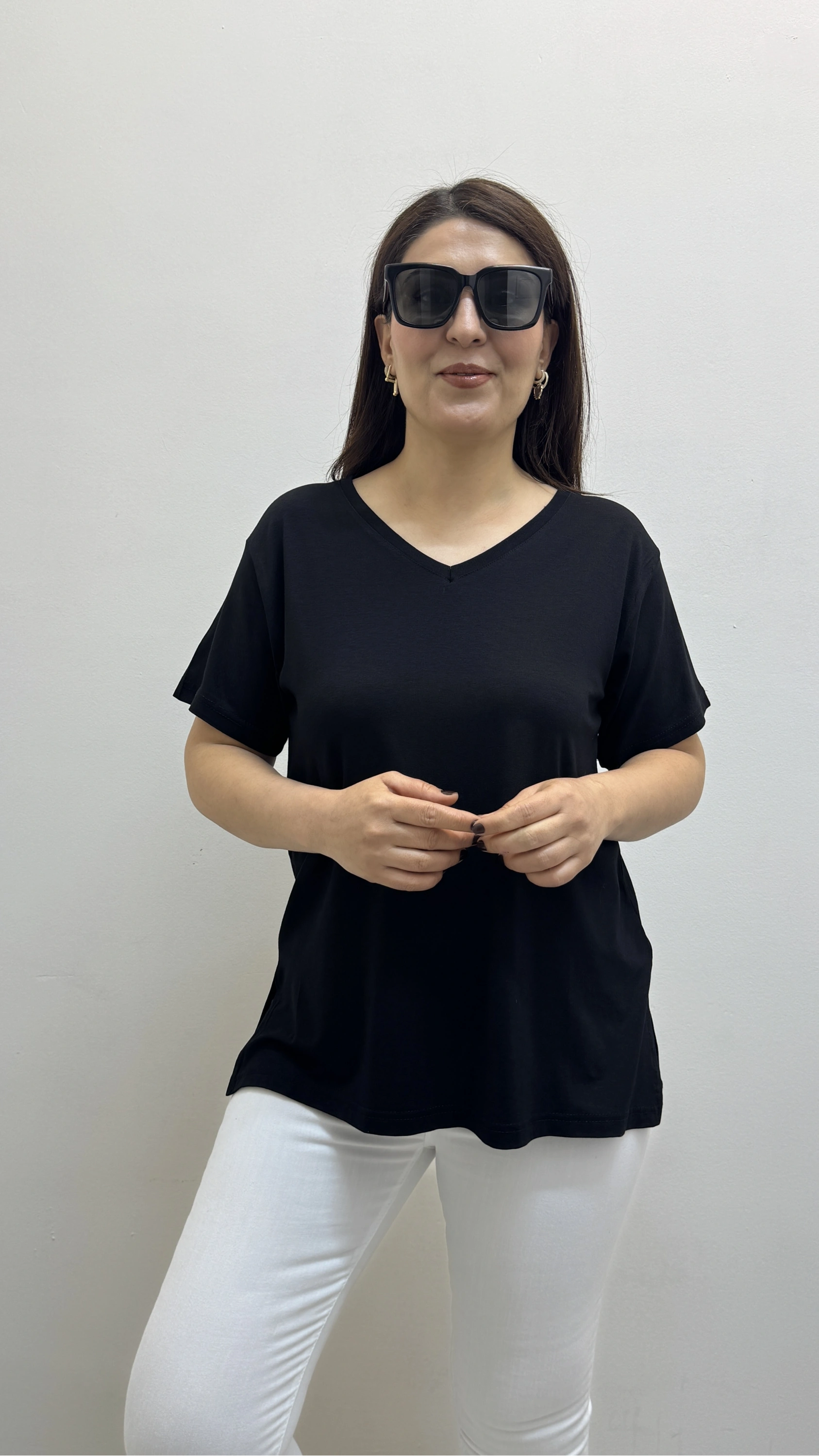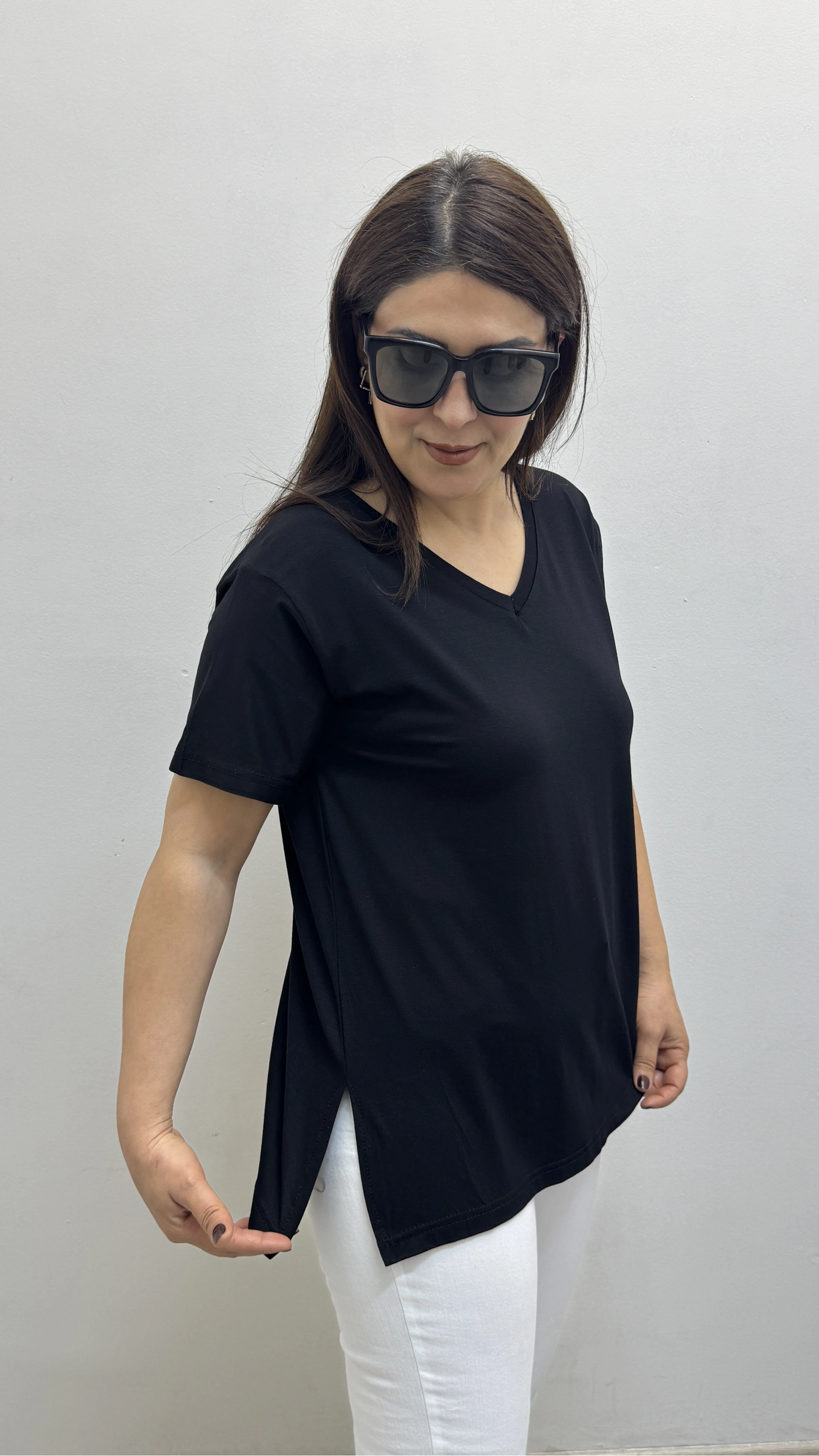 İki Yandan Yırtmaçlı V Yaka Siyah Basic Tişört Hakkında