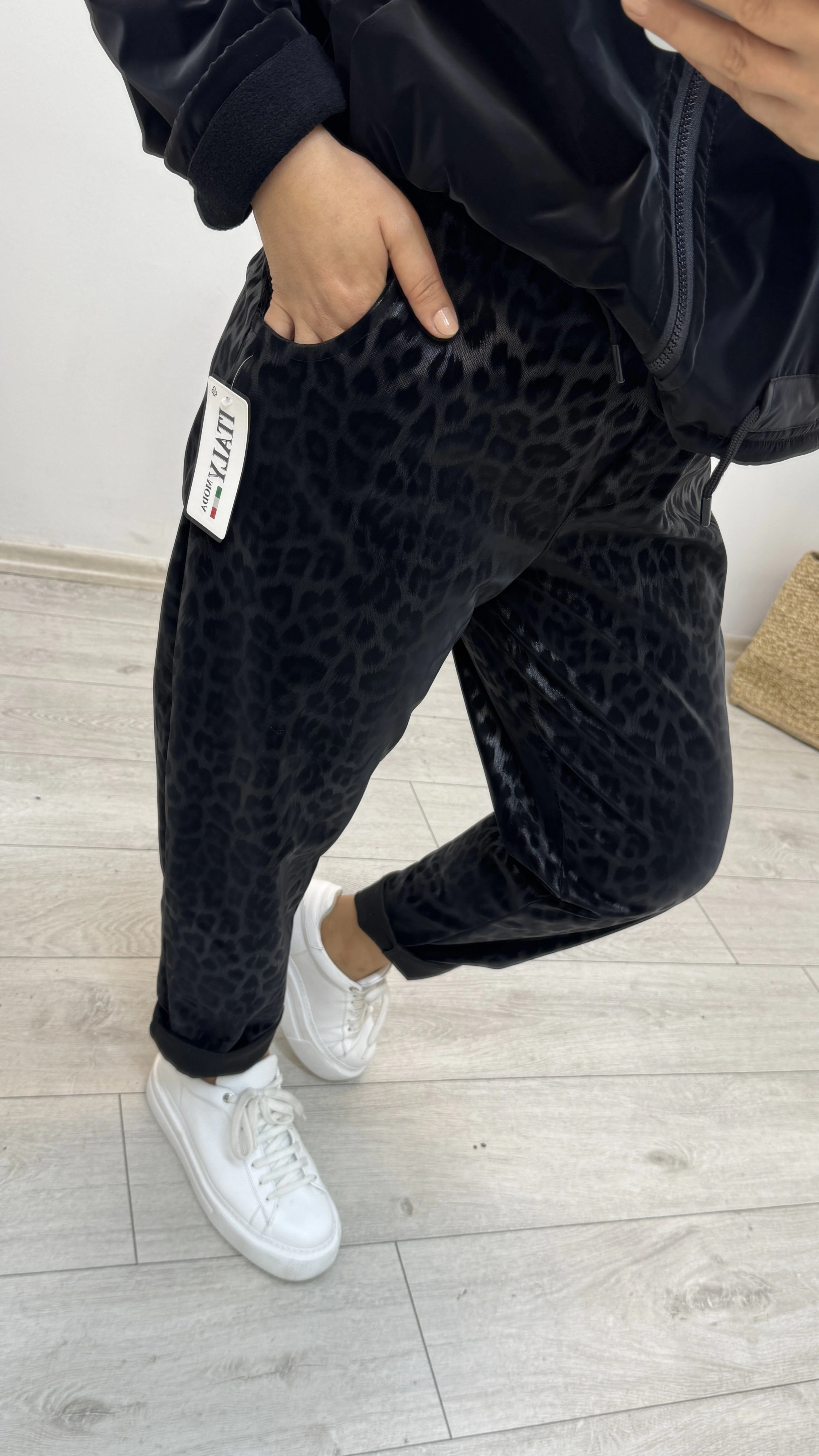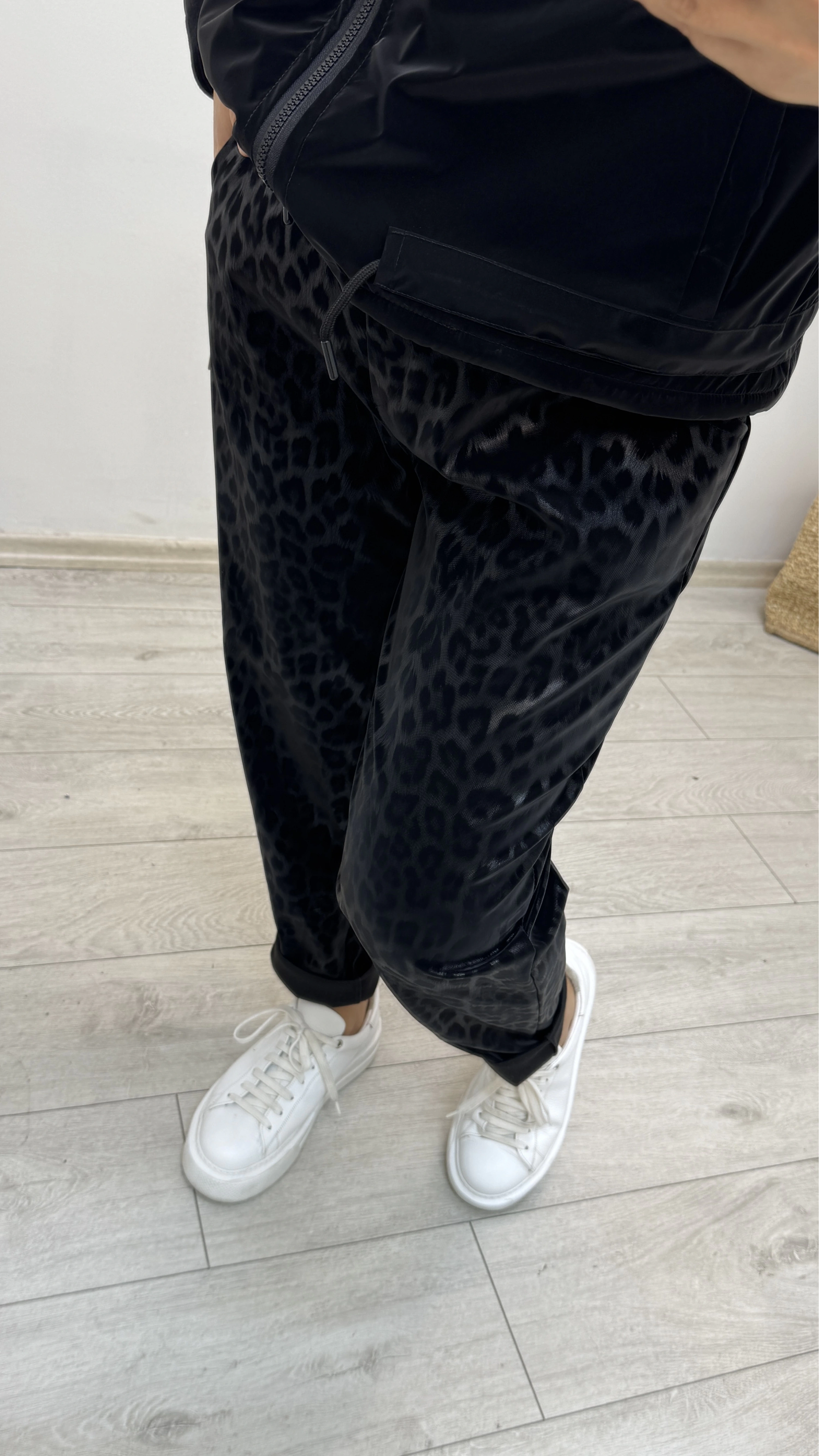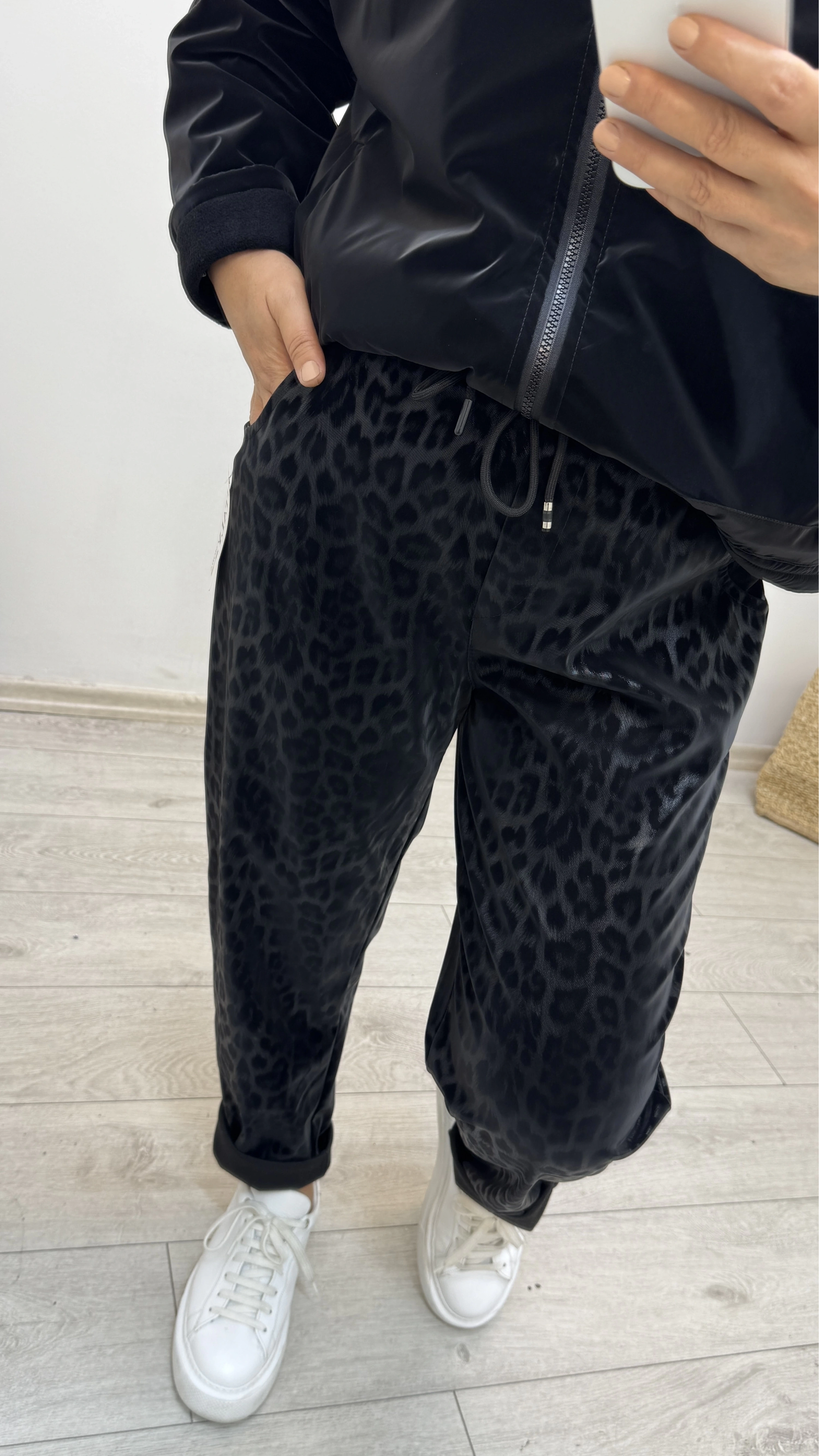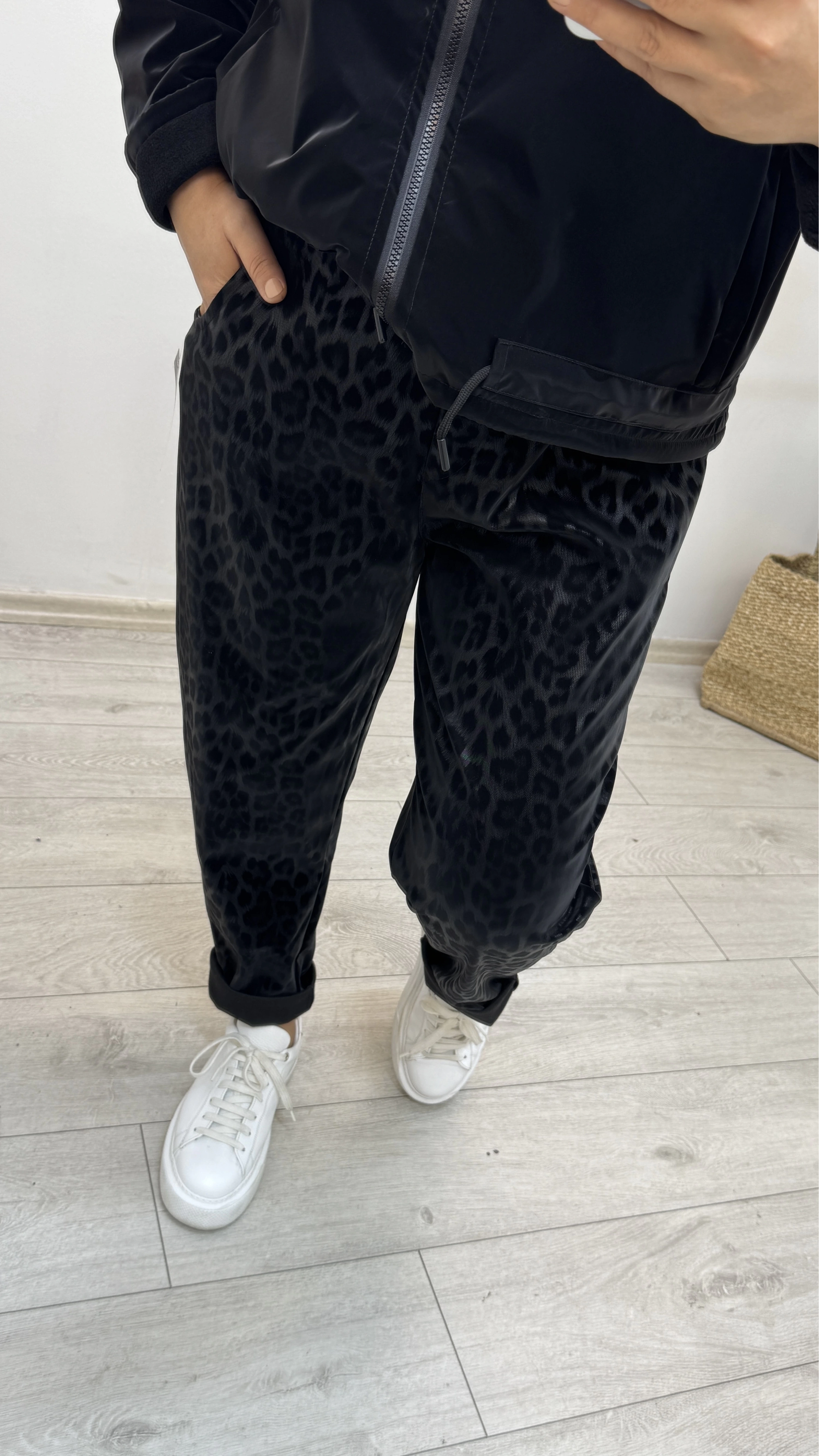 İthal Deri Görünümlü Leopar Baskılı Siyah Pantolon