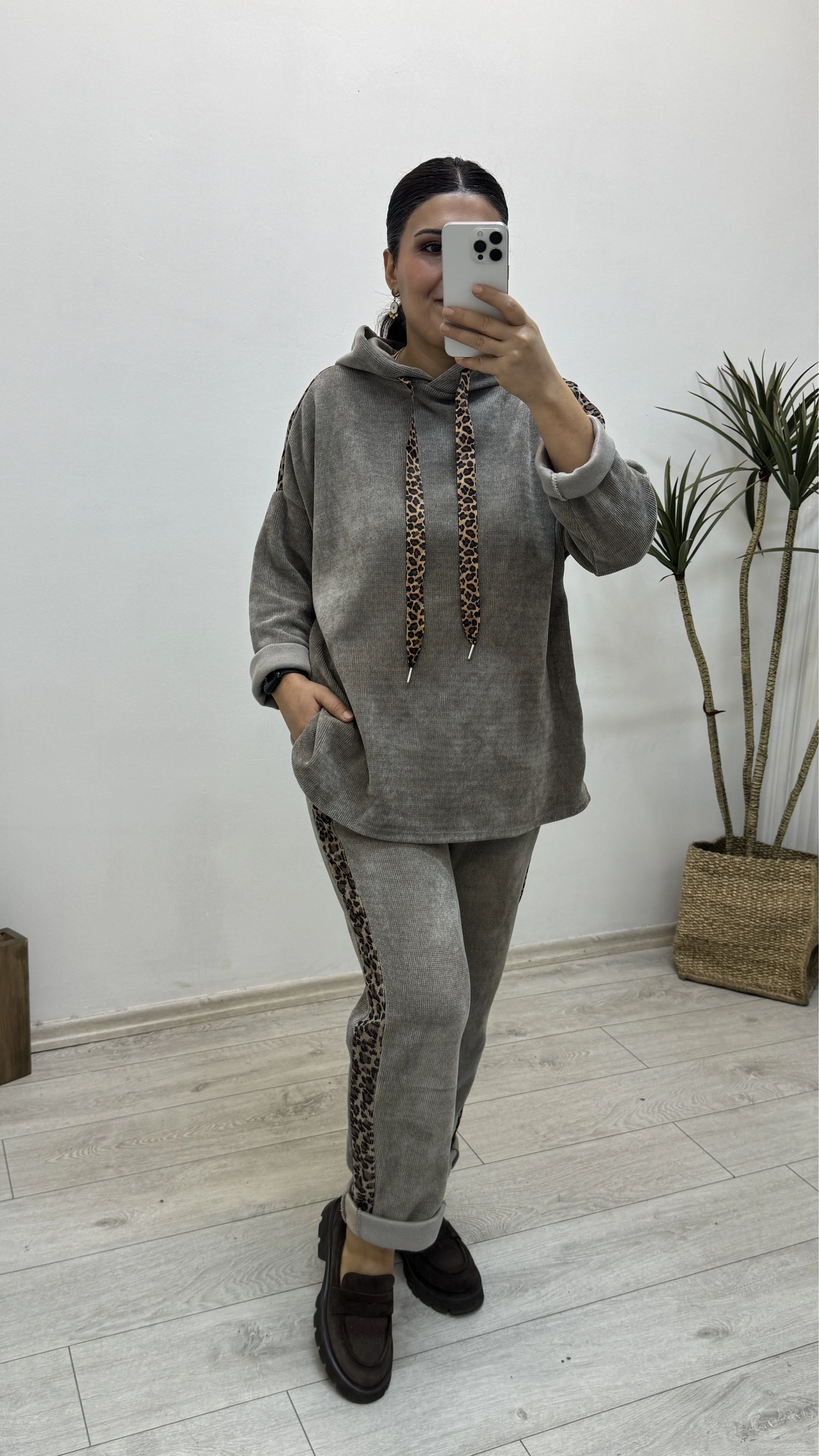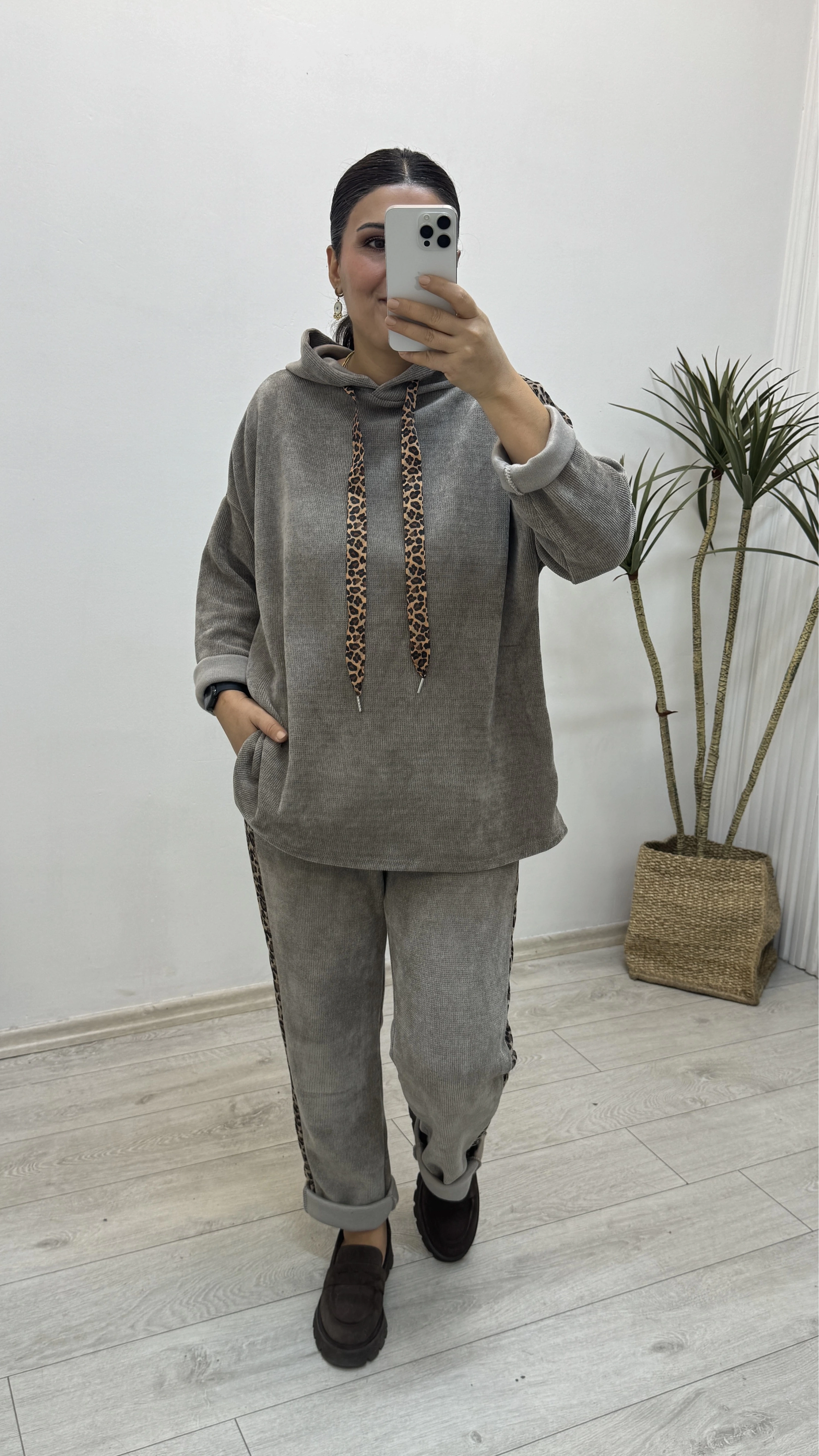 İthal Kapüşonlu Vizonrengi Kadife Takım