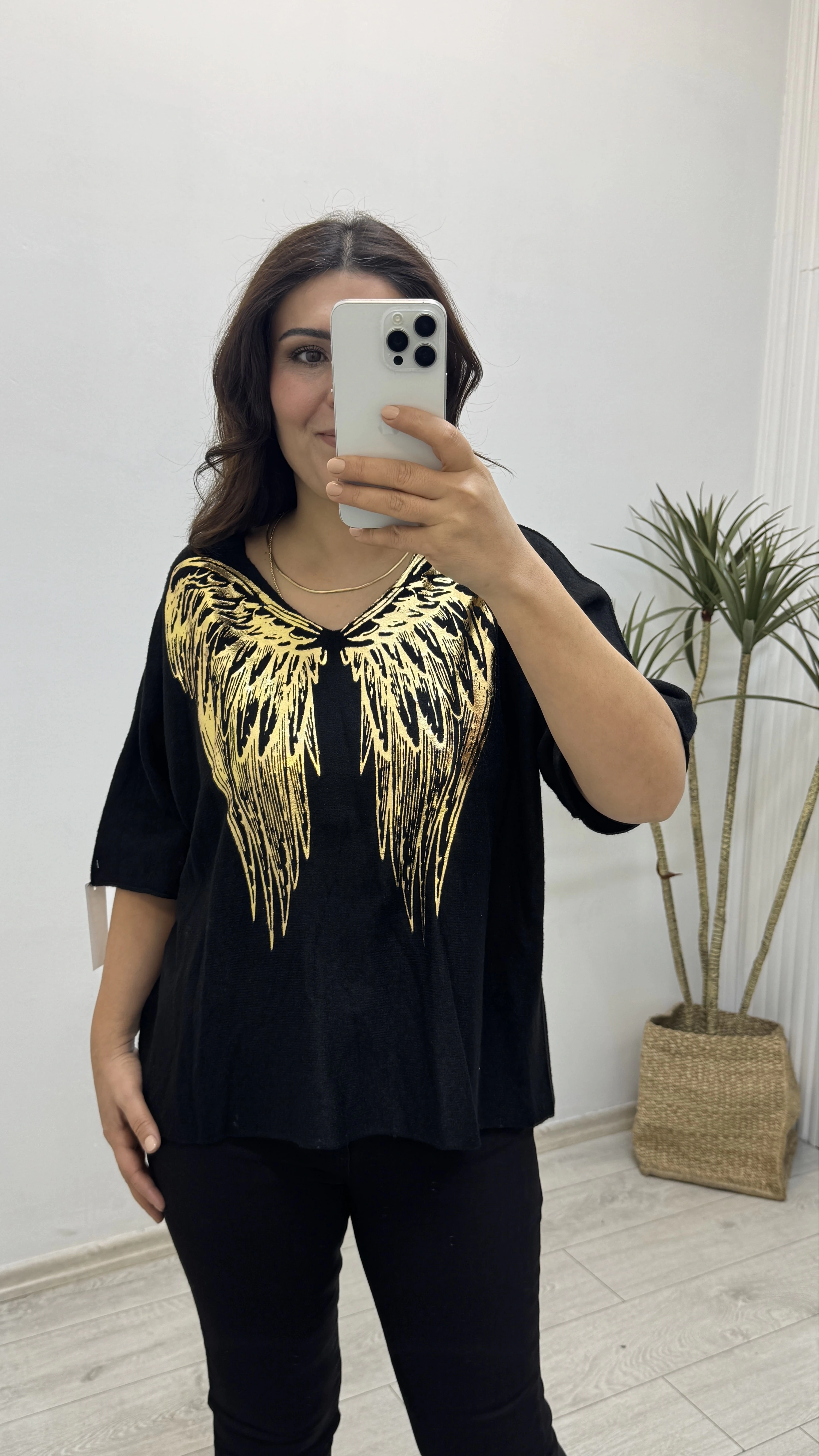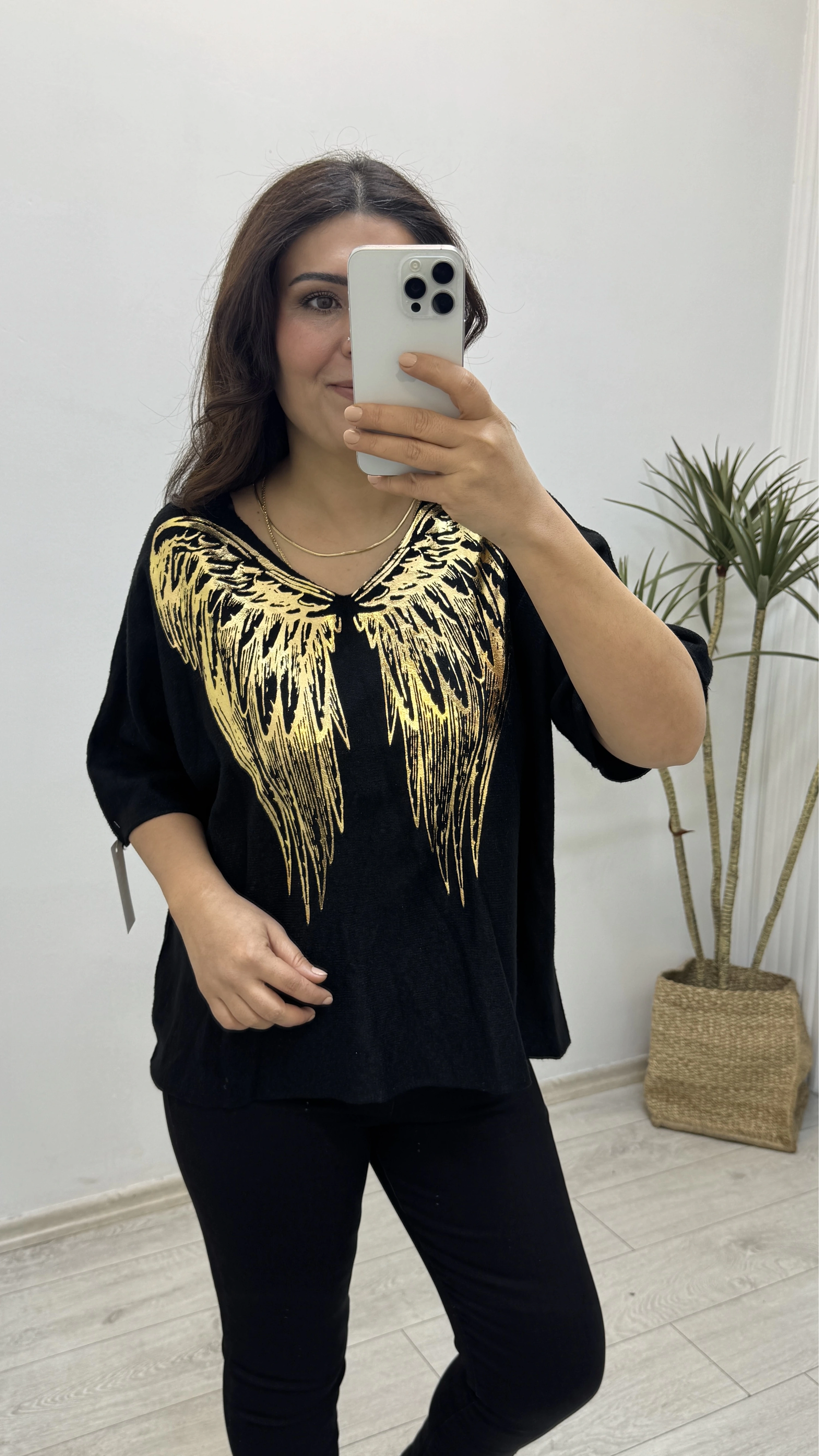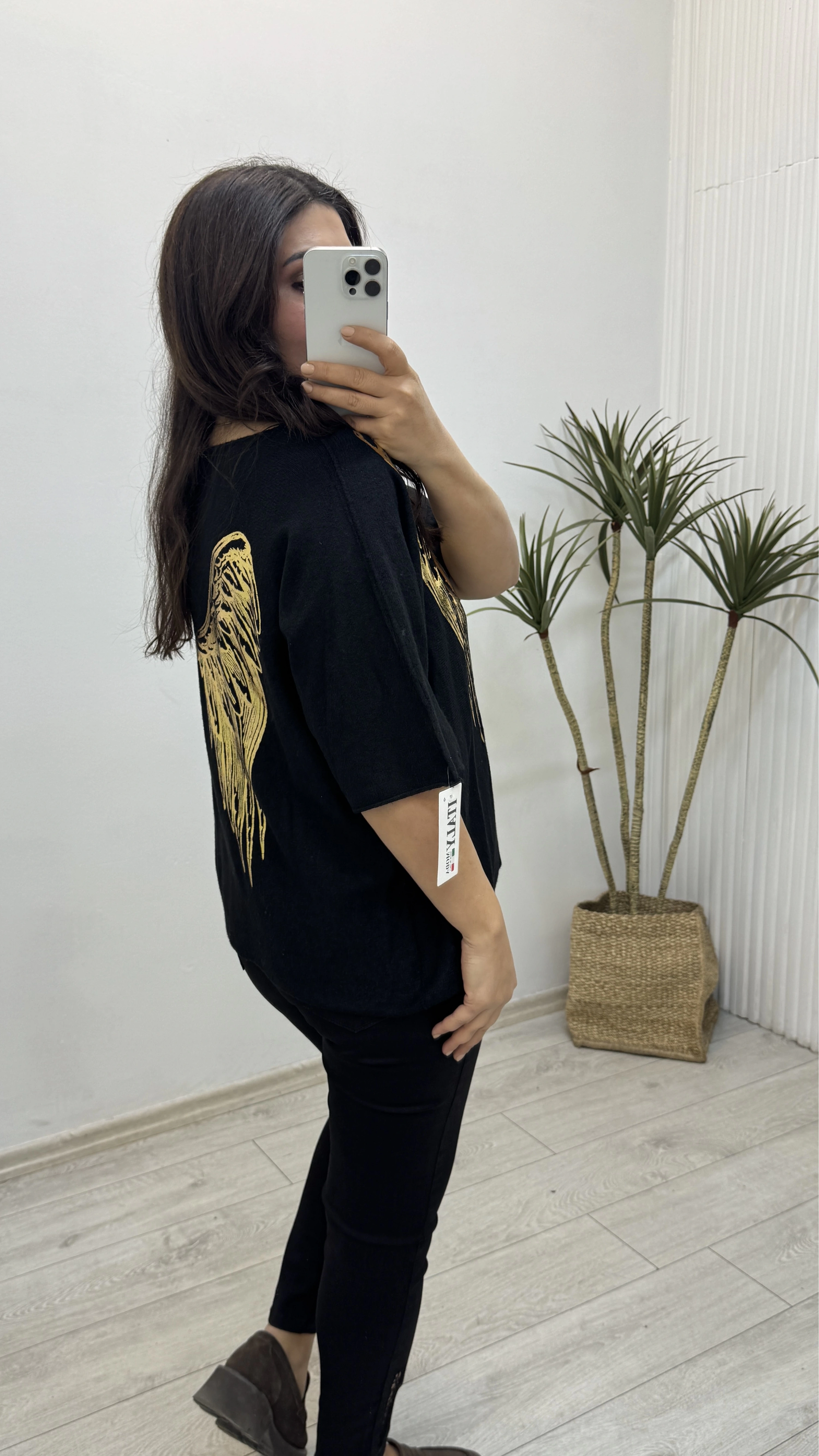 İthal Melek Kanadı Baskılı Dirsek Kol Siyah Kazak Hakkında