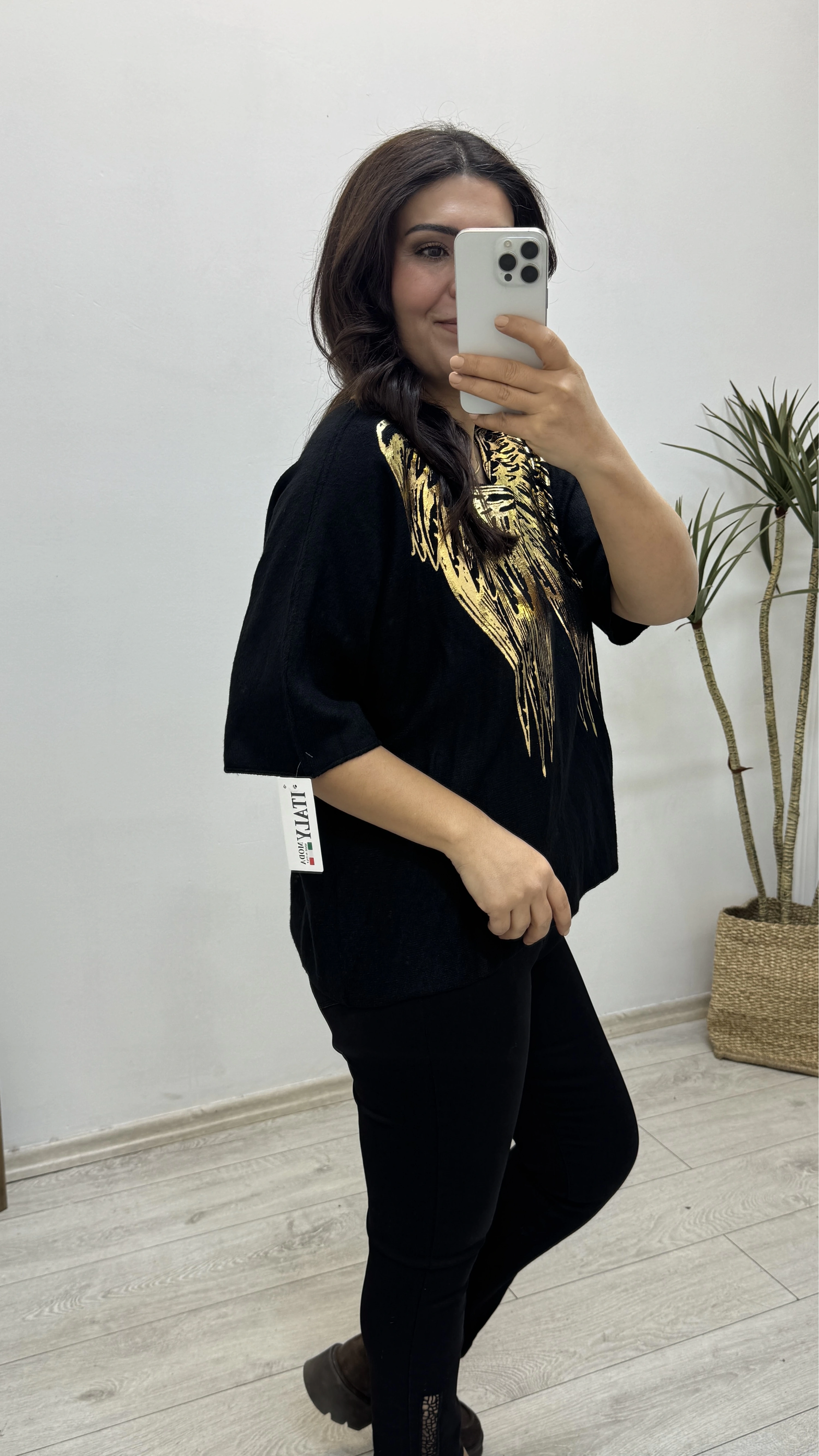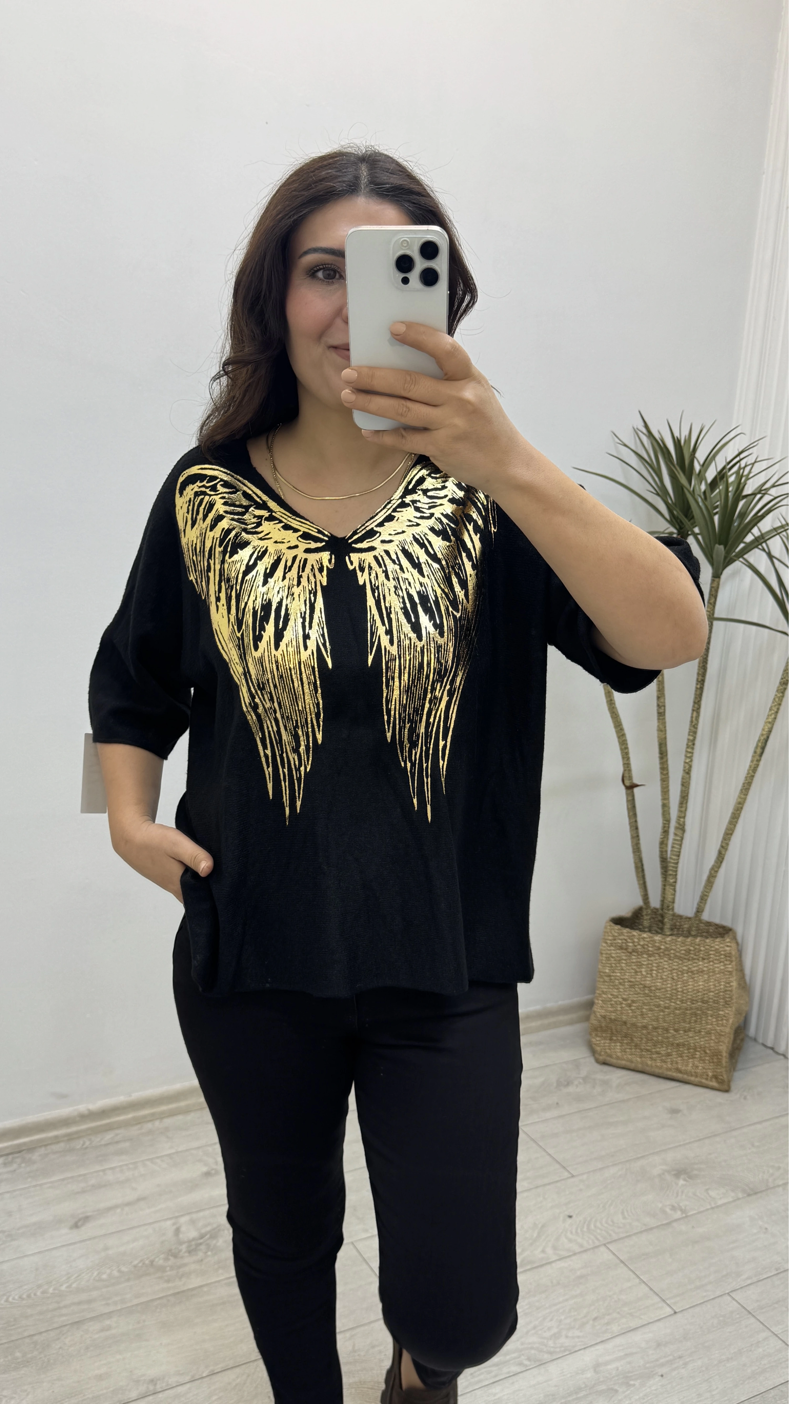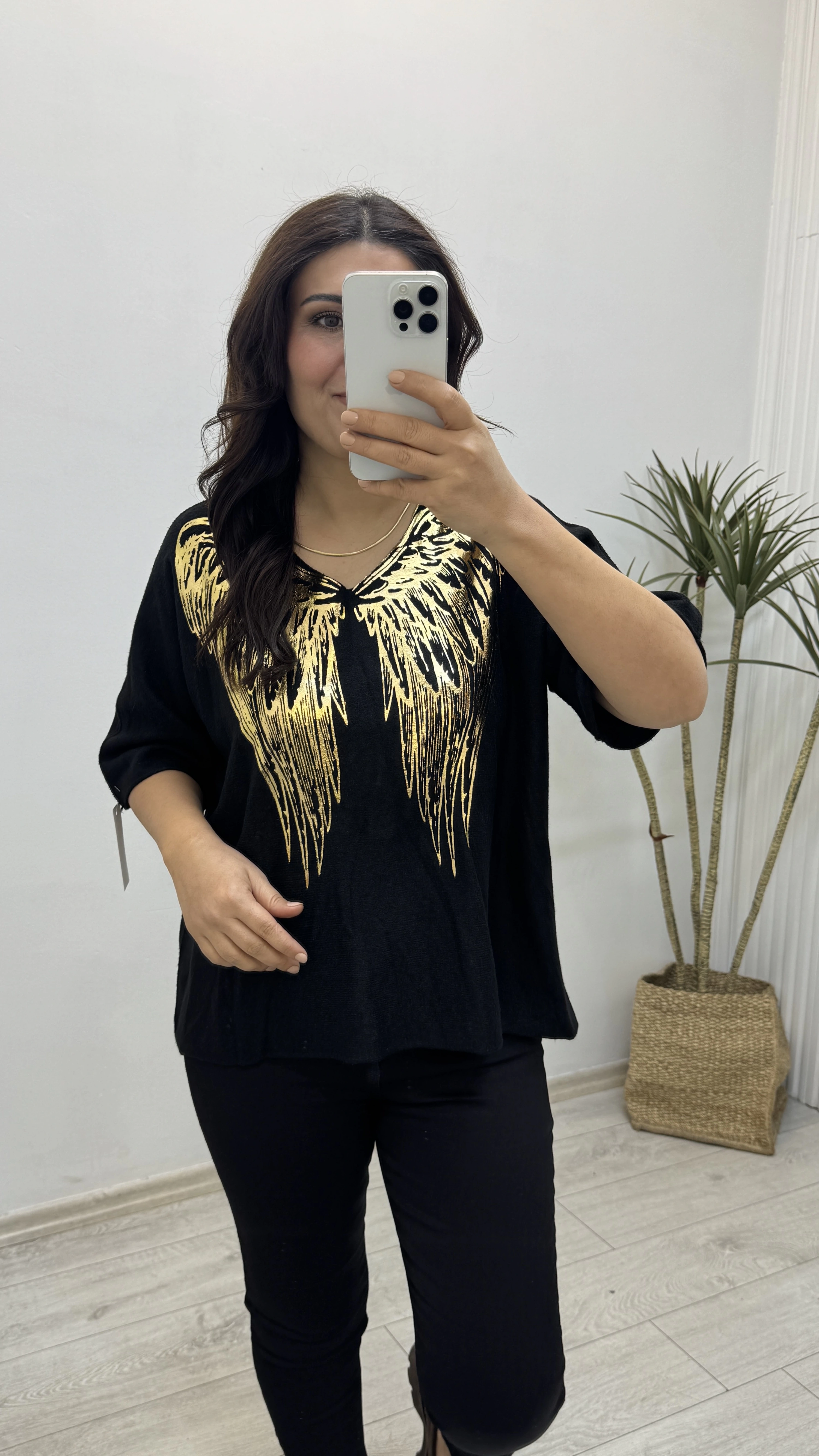 İthal Melek Kanadı Baskılı Dirsek Kol Siyah Kazak Hakkında