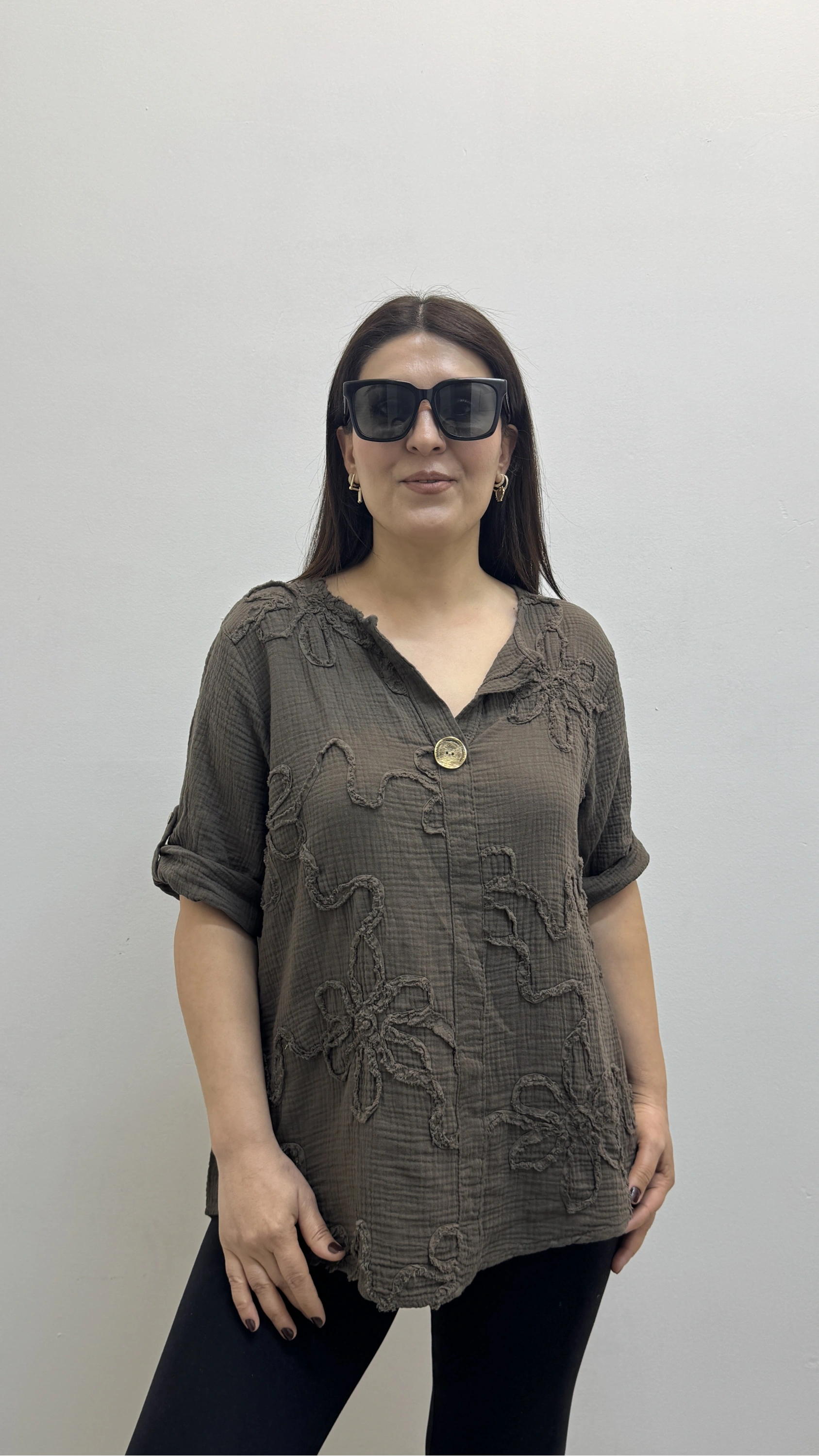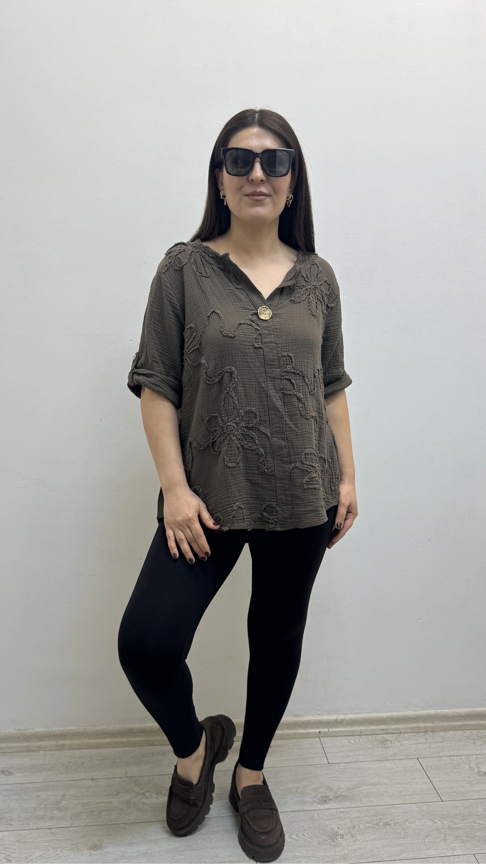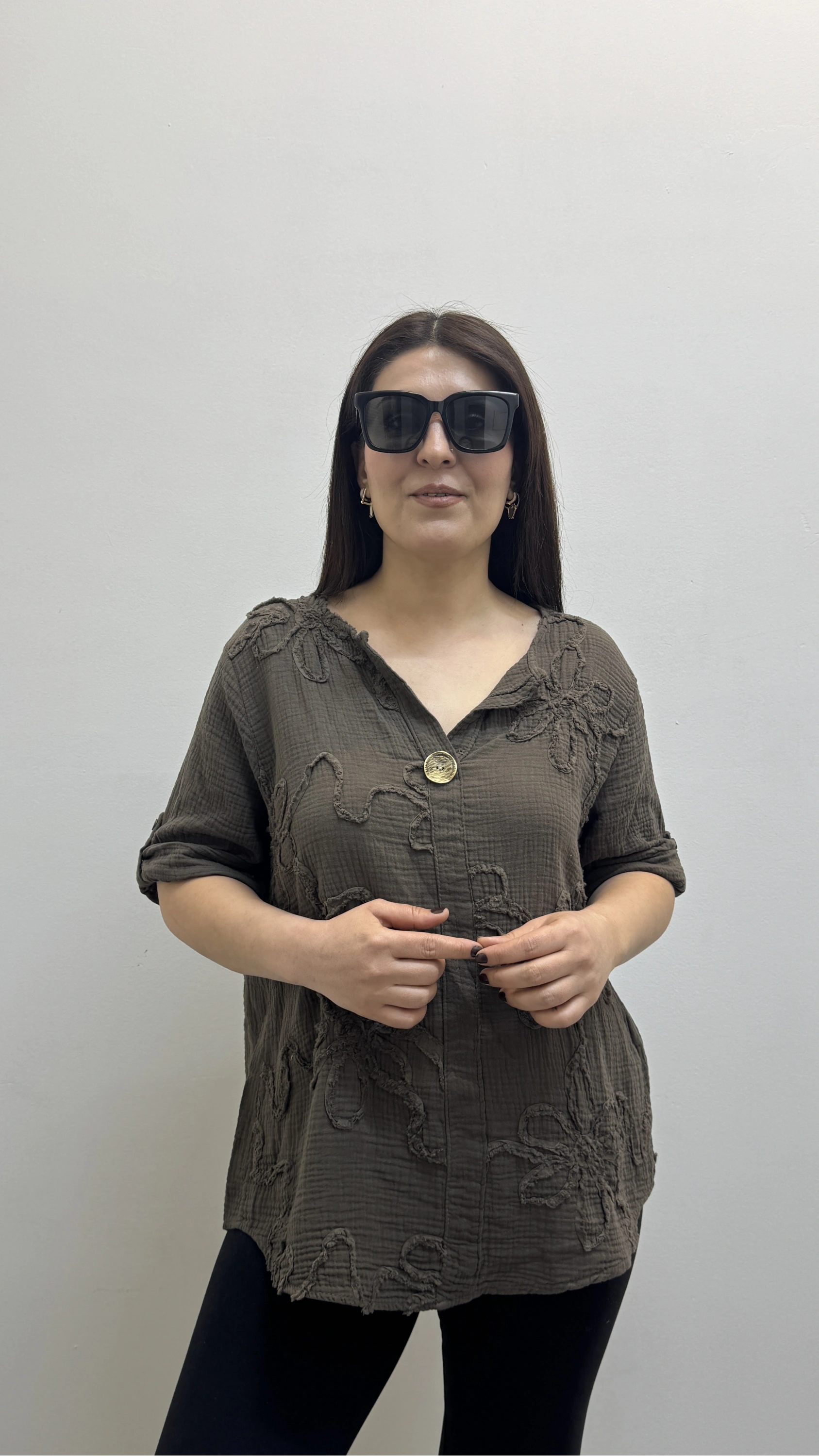 Kabartma Desenli Kahverengi Müslin Bluz Hakkında