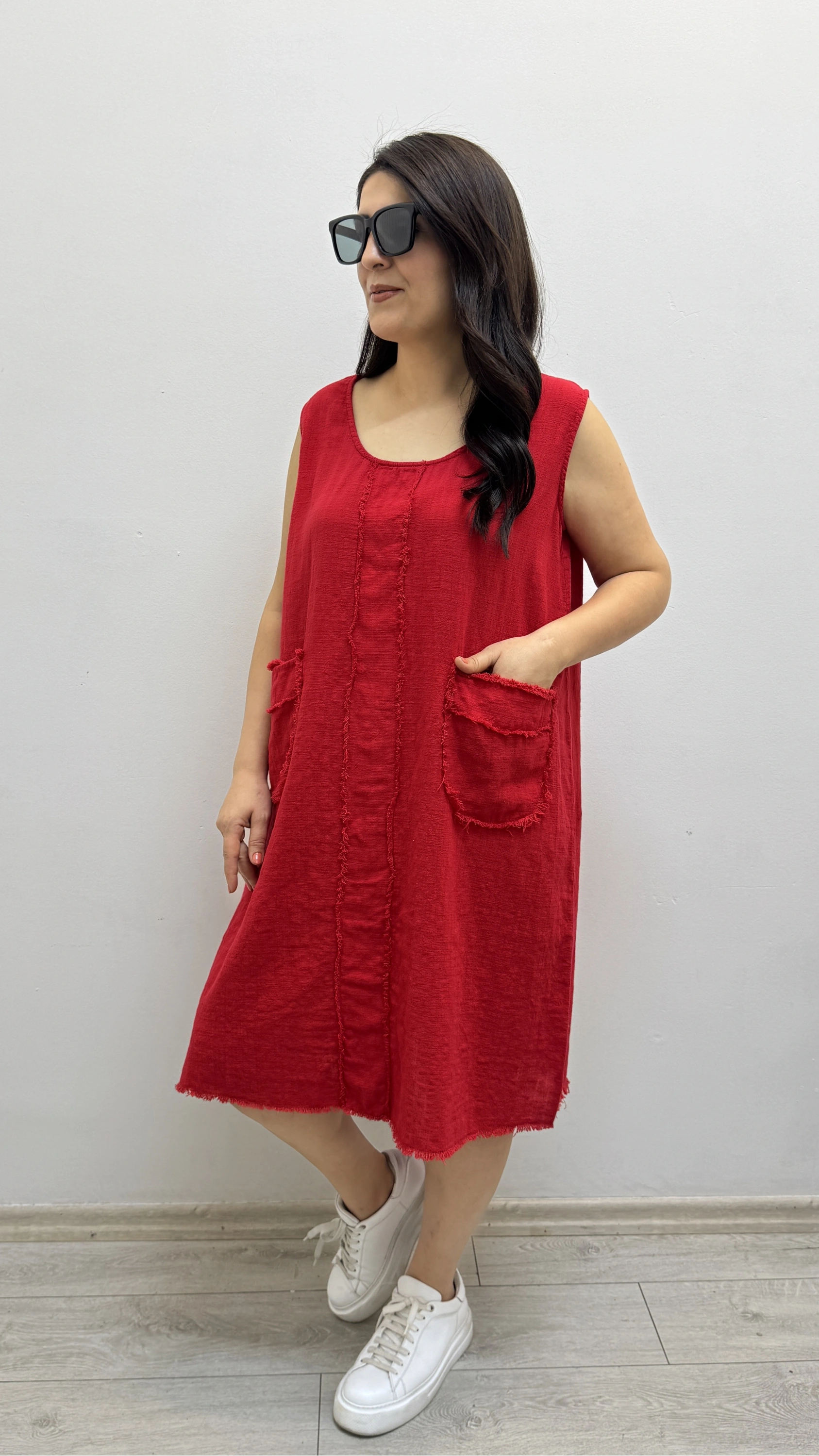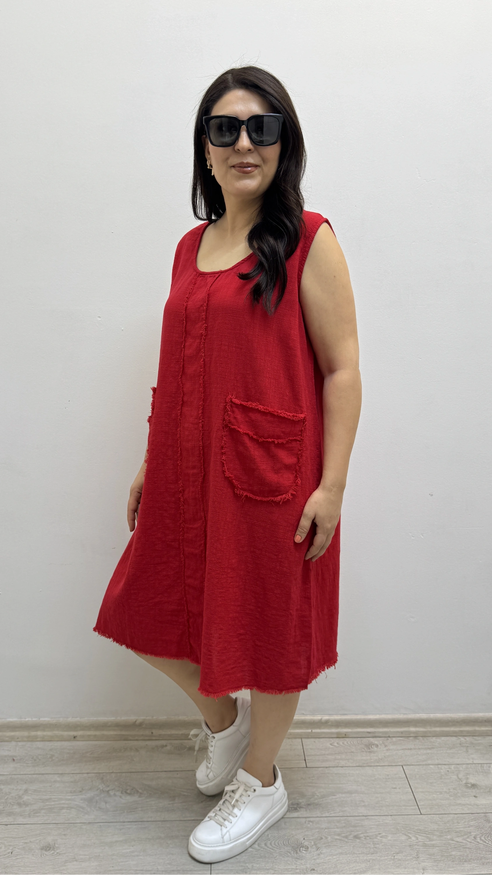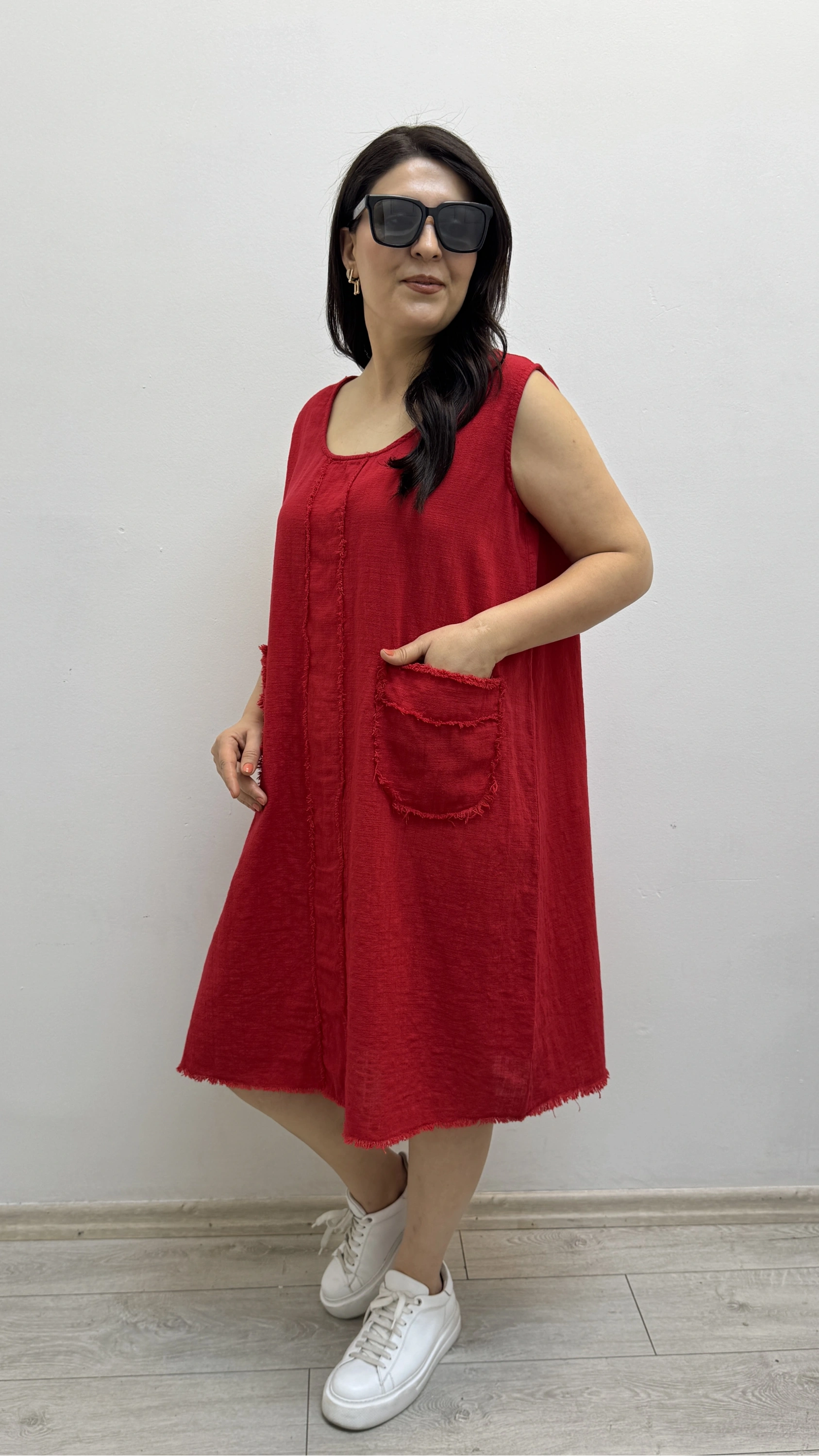 Kalın Askılı Püskül Dikişli Cepli Pamuklu Kırmızı Elbise Hakkında