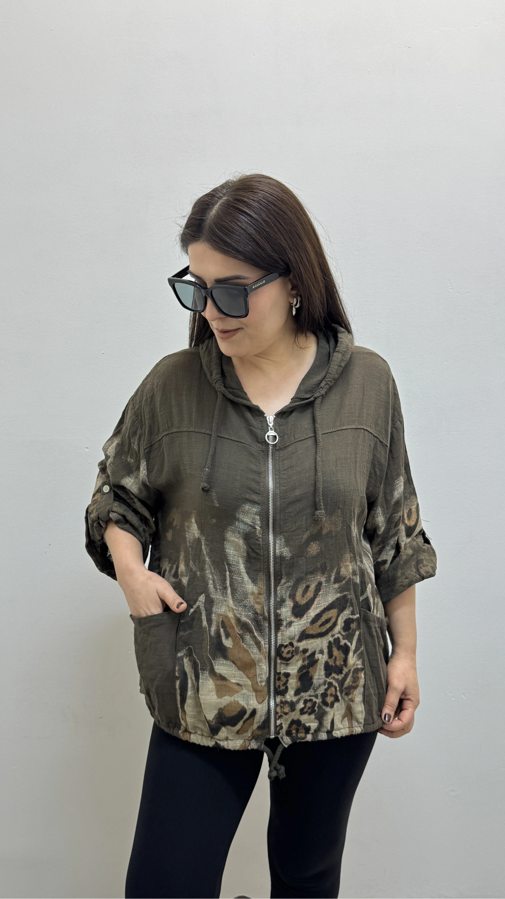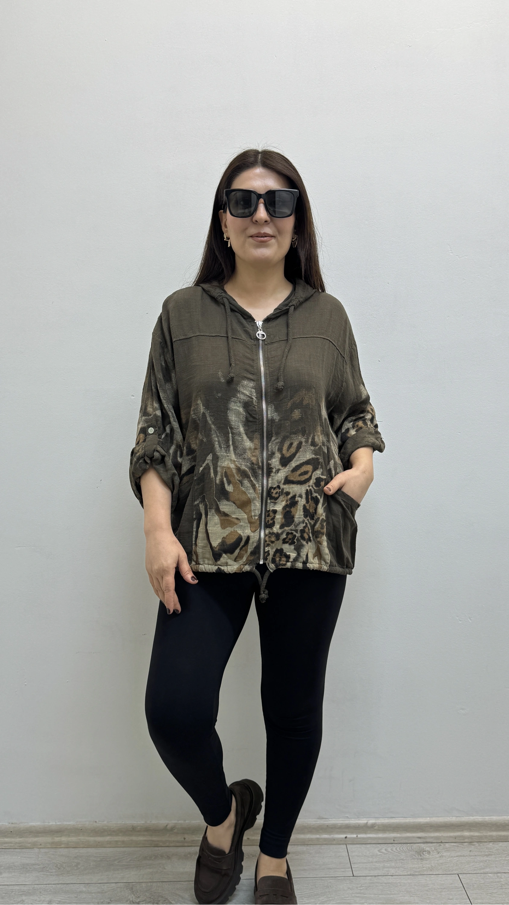 Leopar Desenli Fermuarlı Kahverengi İthal Gömlek