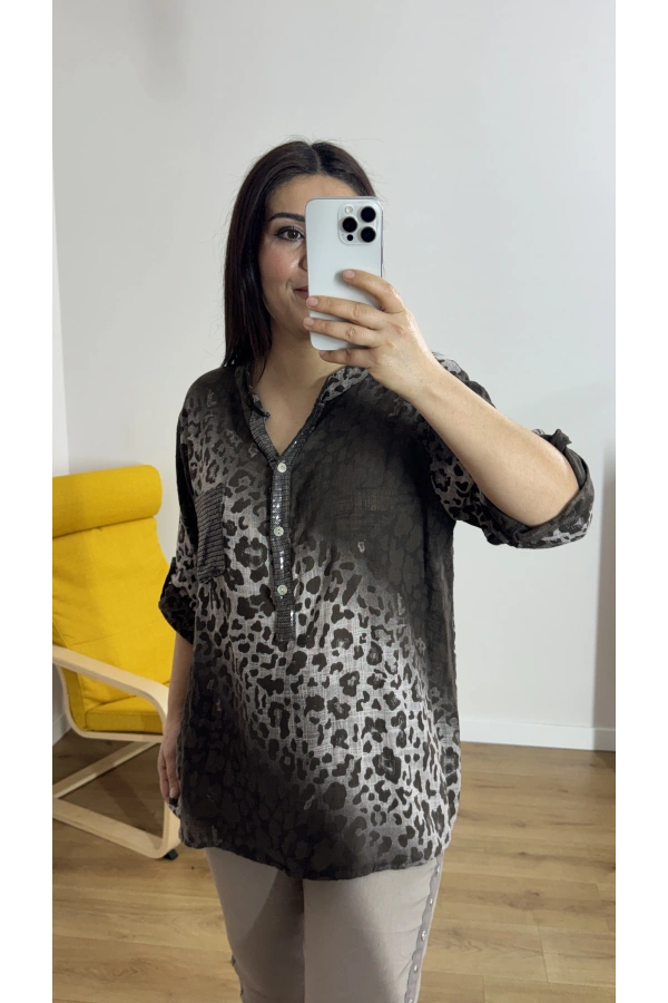 Leopar Desenli Haki Yaka Kahverengi İthal Bluz