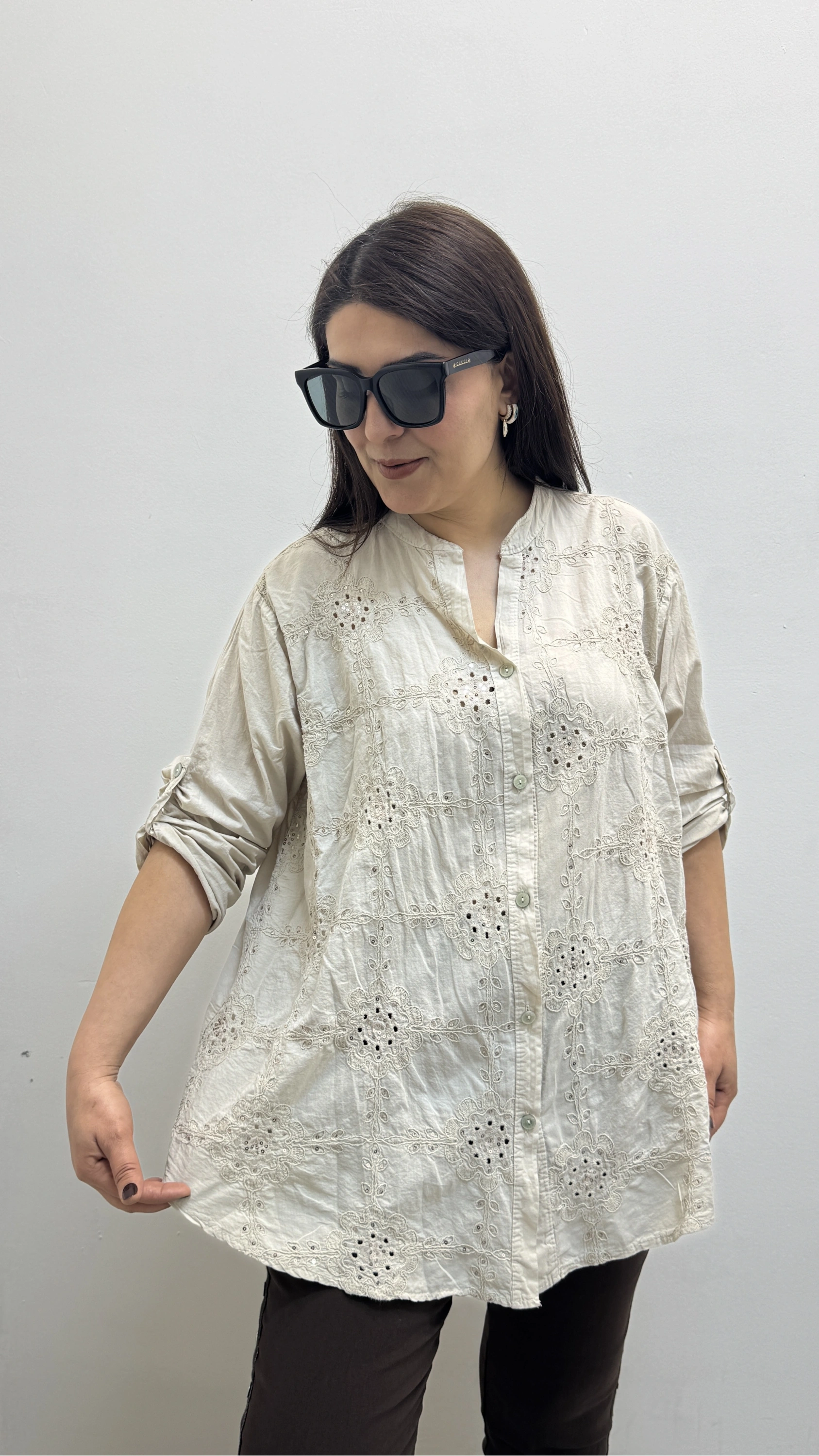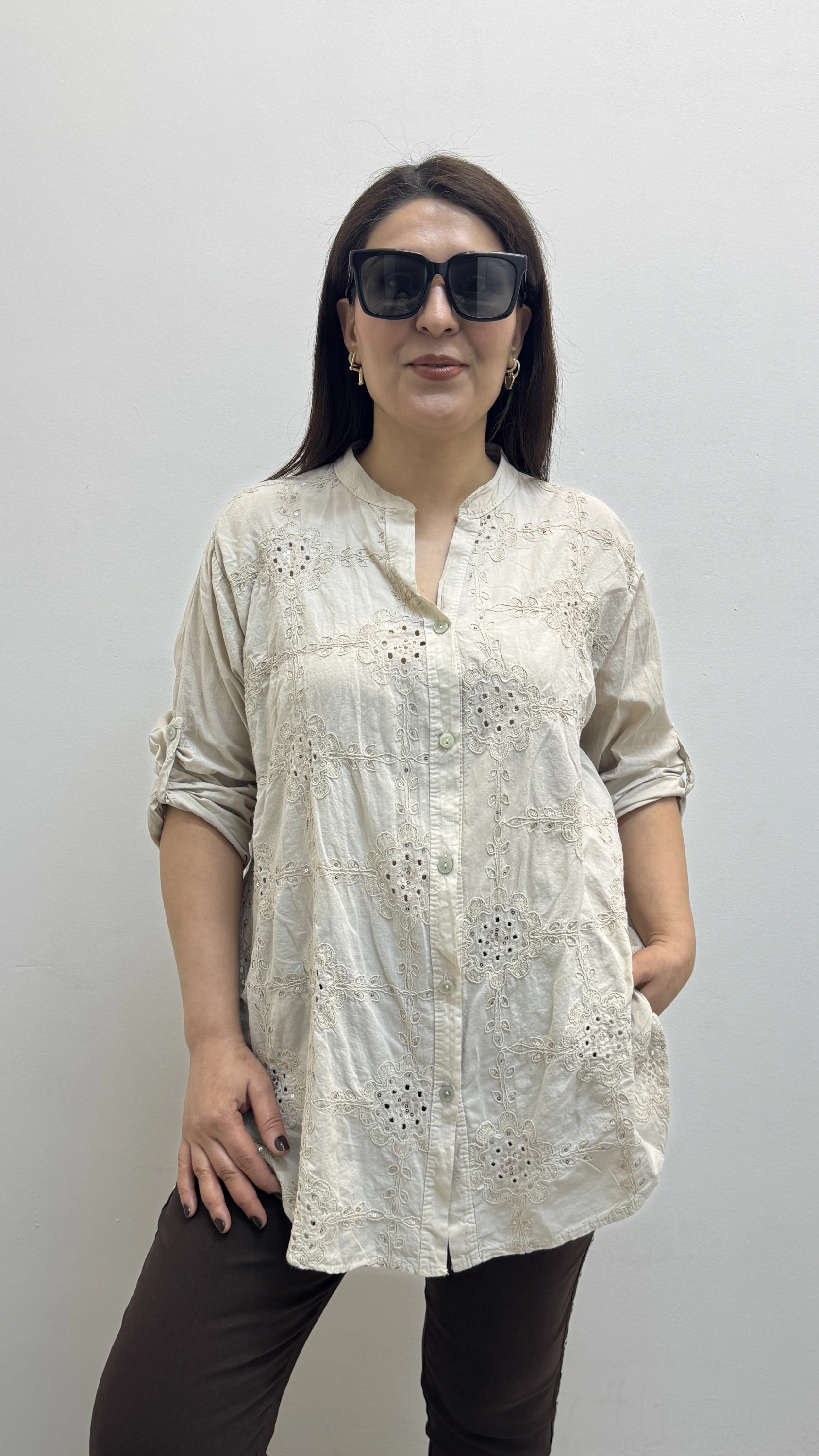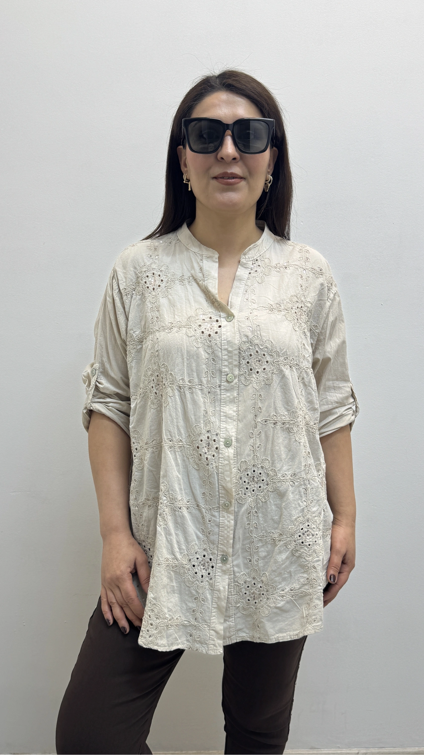 Nakış İşlemeli Boydan Düğmeli Hakim Yaka Bej Rengi İthal Gömlek