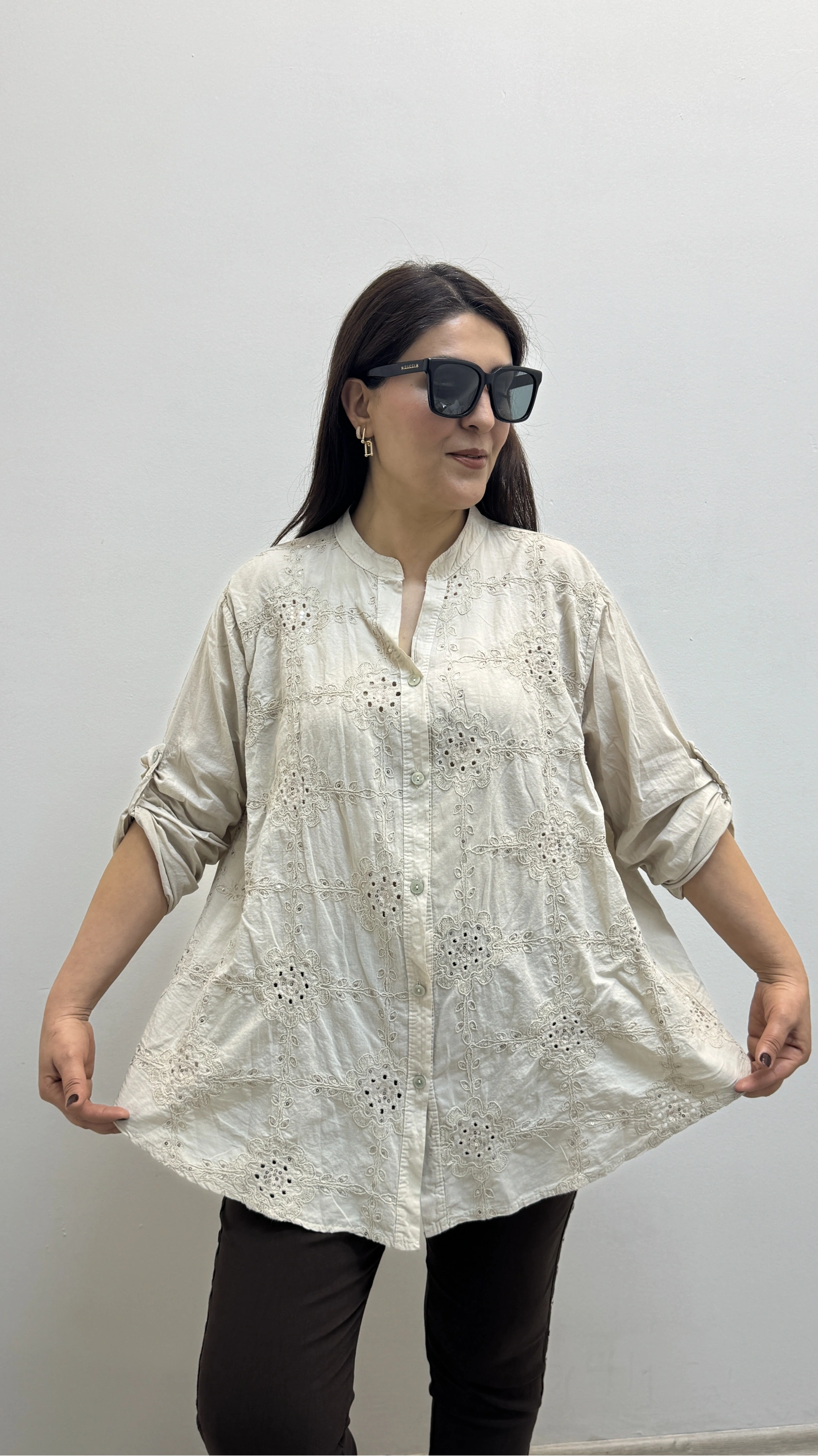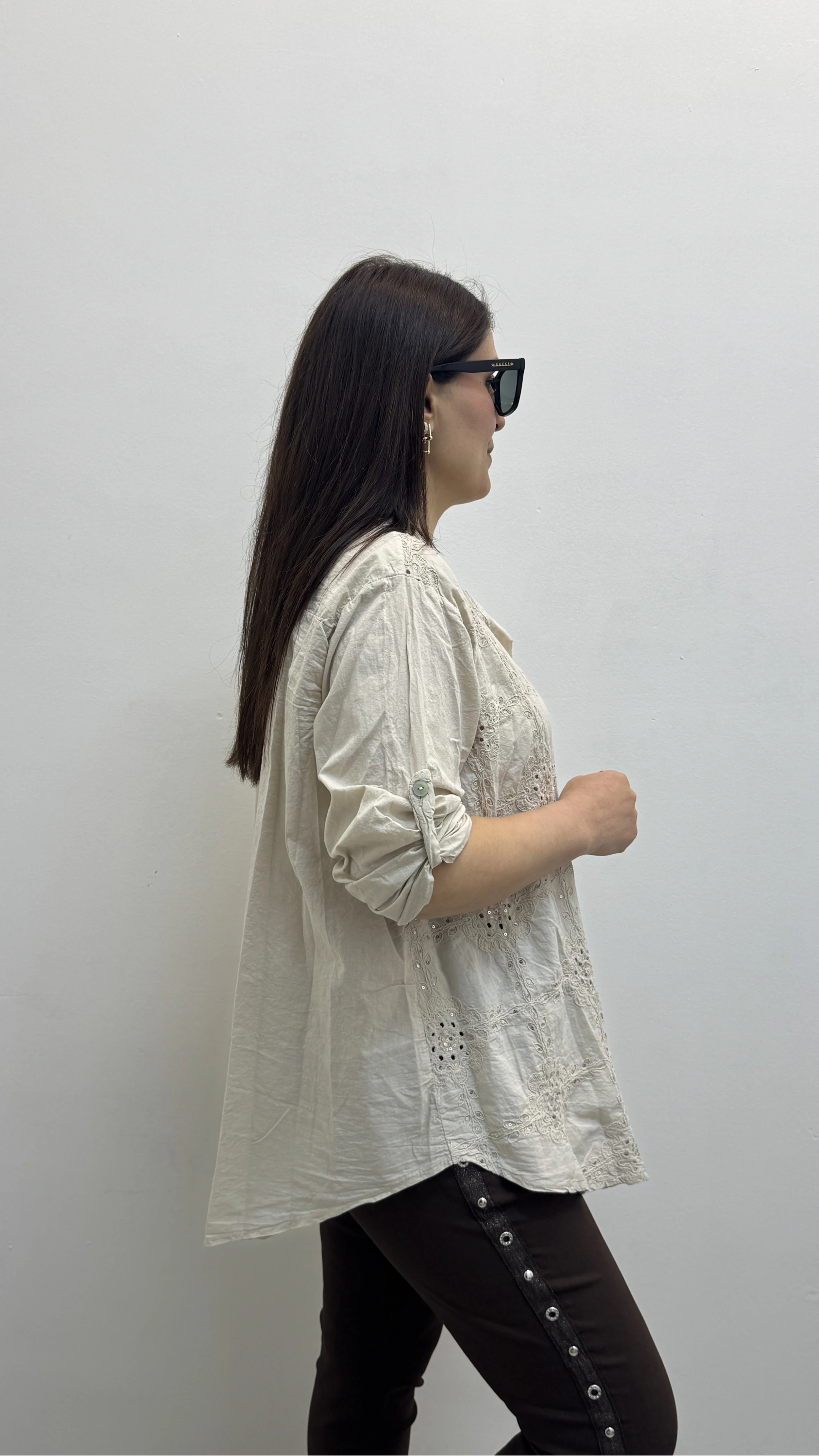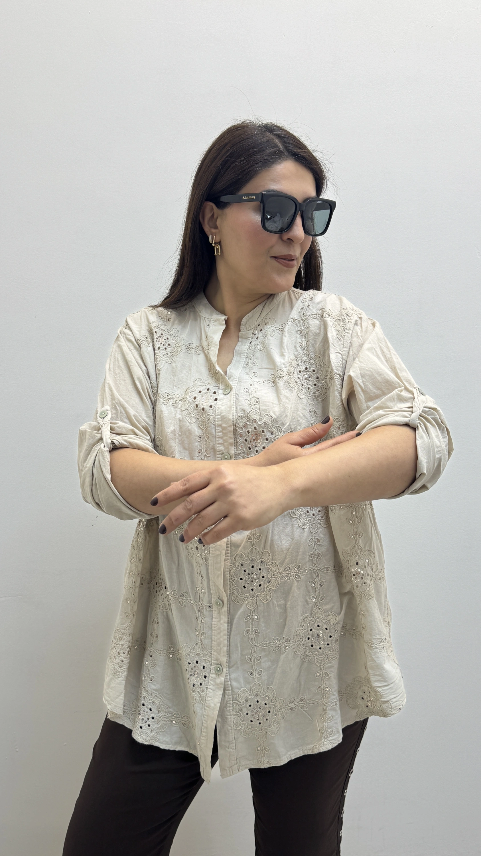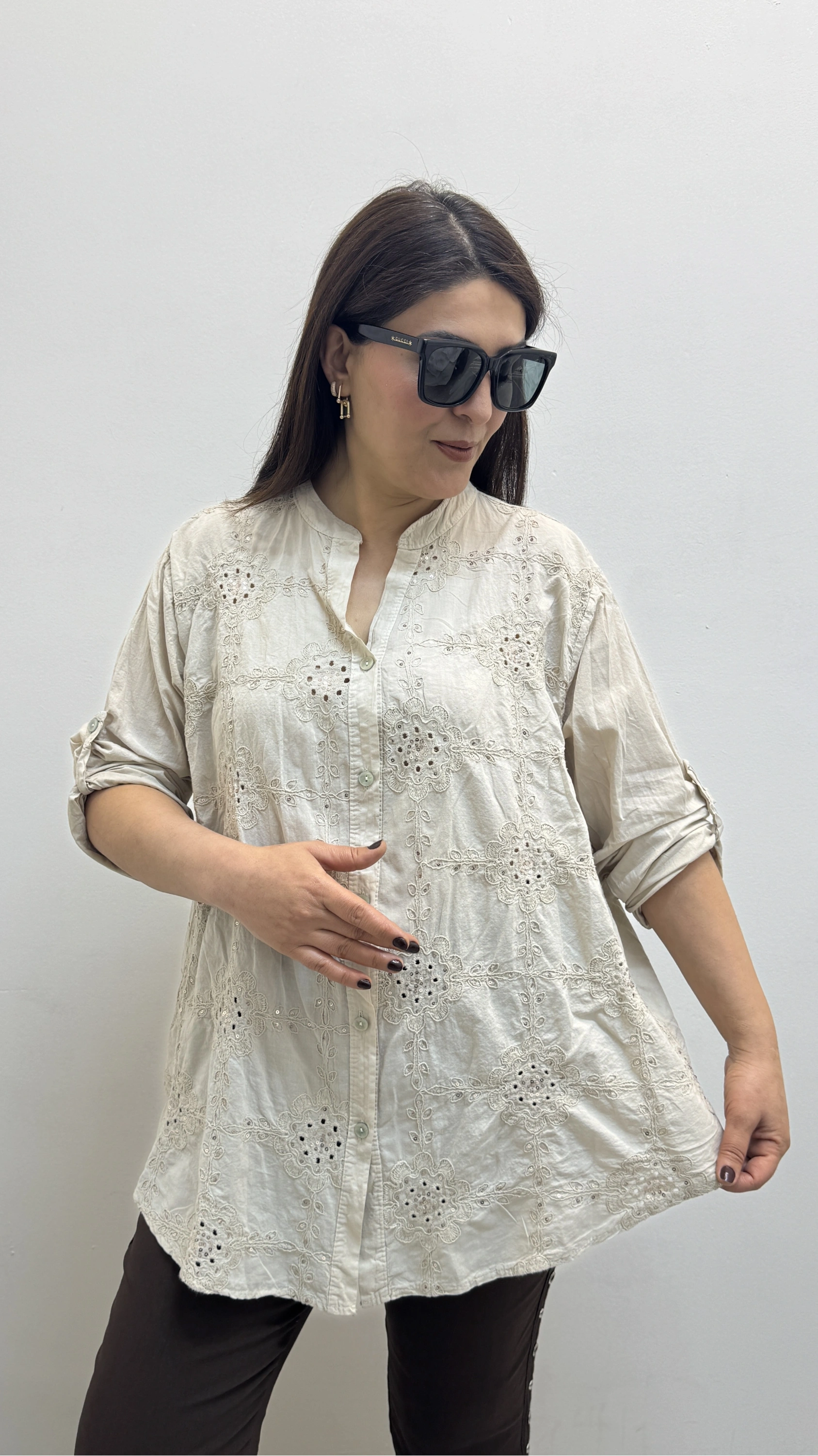 Nakış İşlemeli Boydan Düğmeli Hakim Yaka Bej Rengi İthal Gömlek