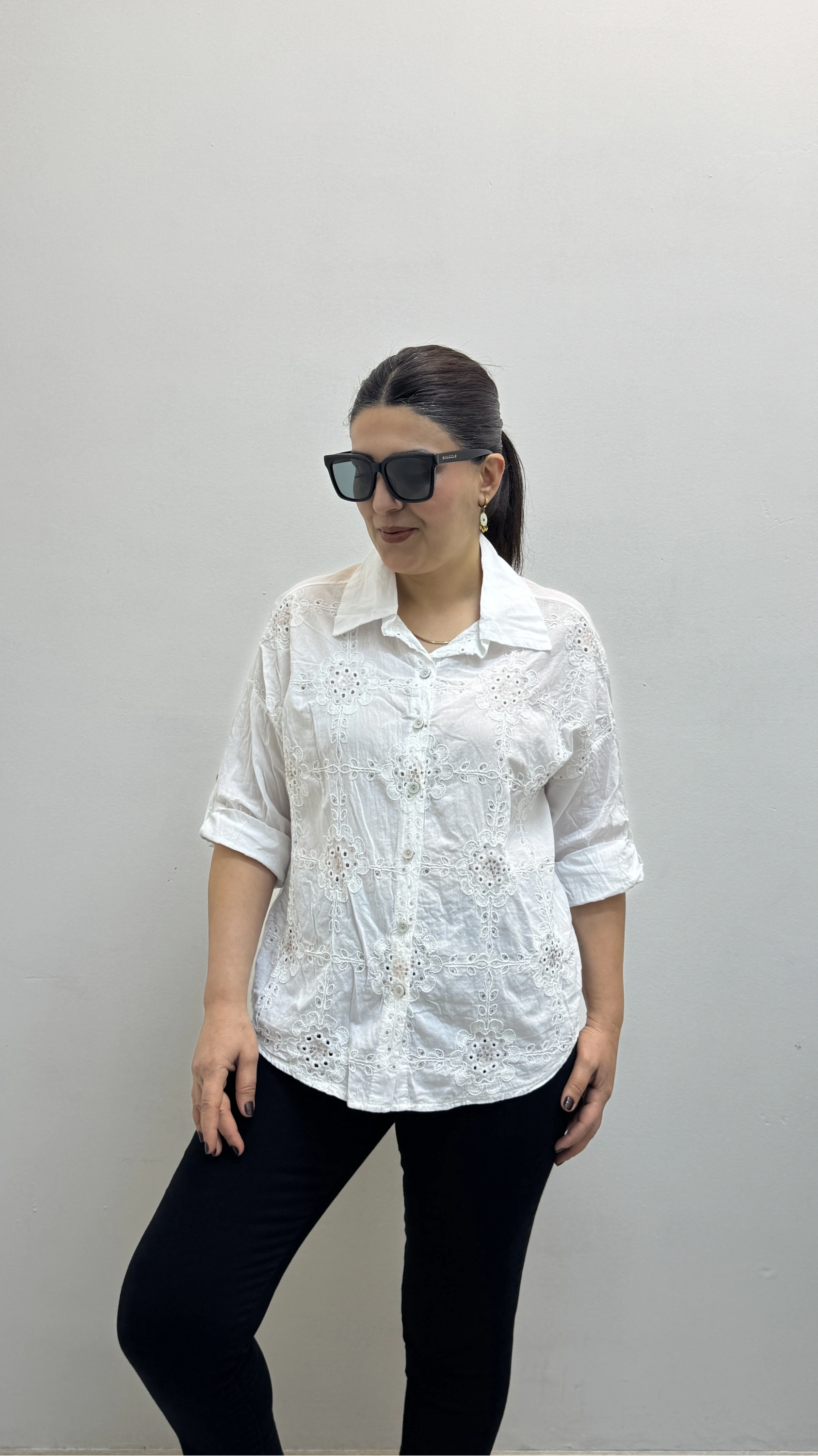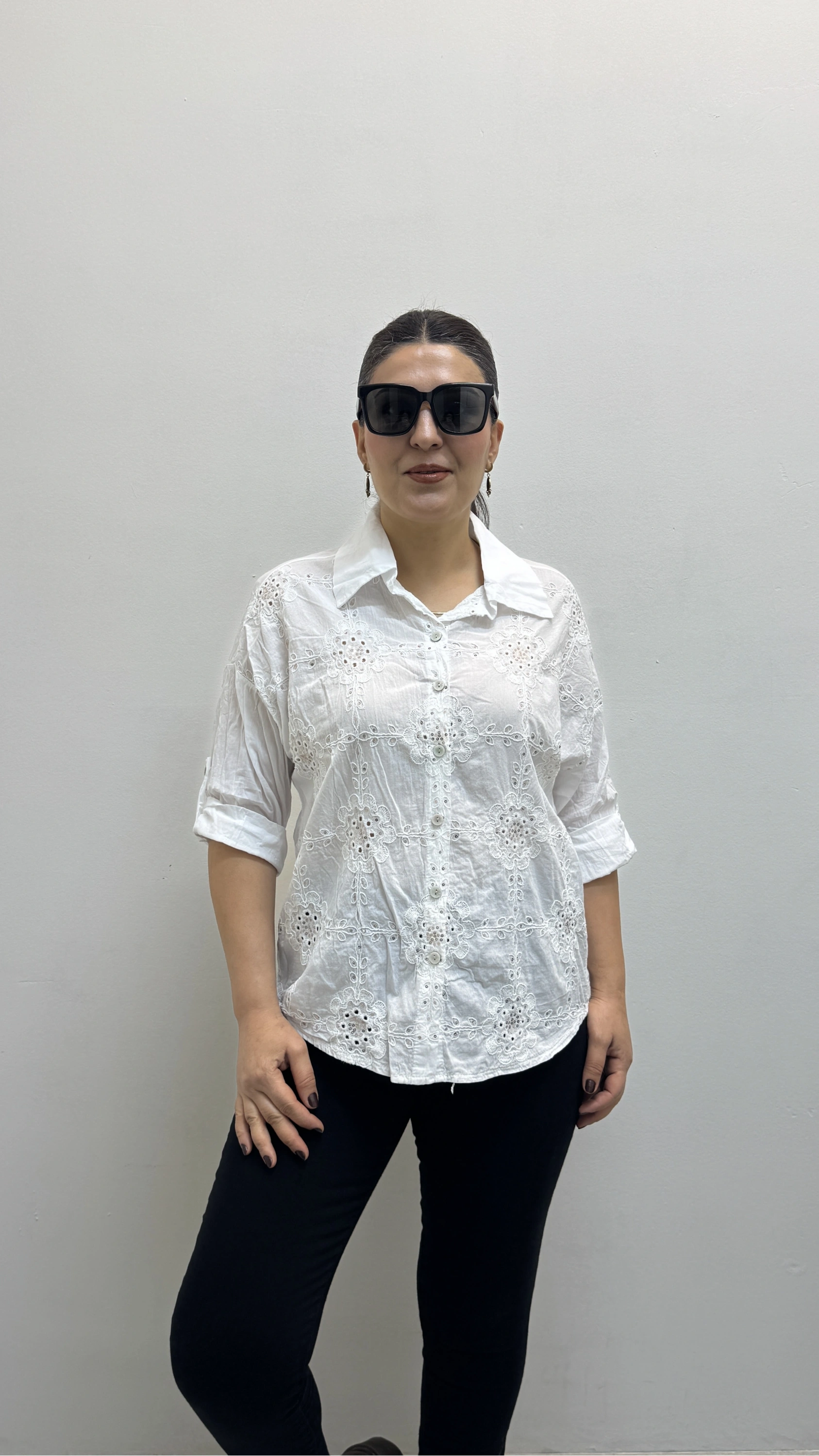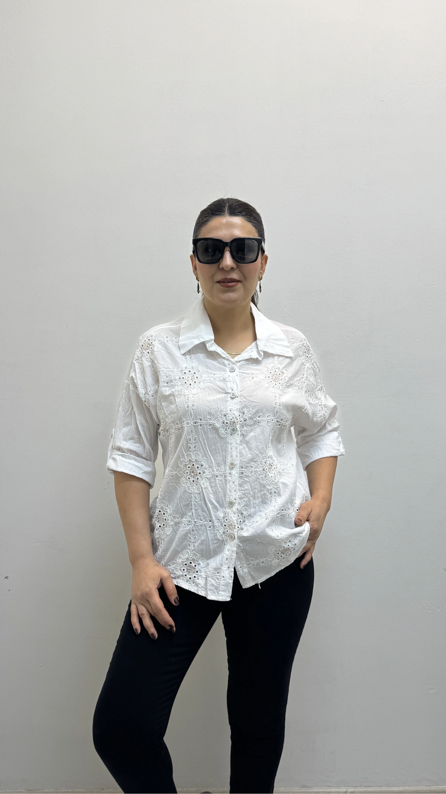 Nakış Ve Pul Payet İşlemeli Yakalı Beyaz Renk İthal Gömlek