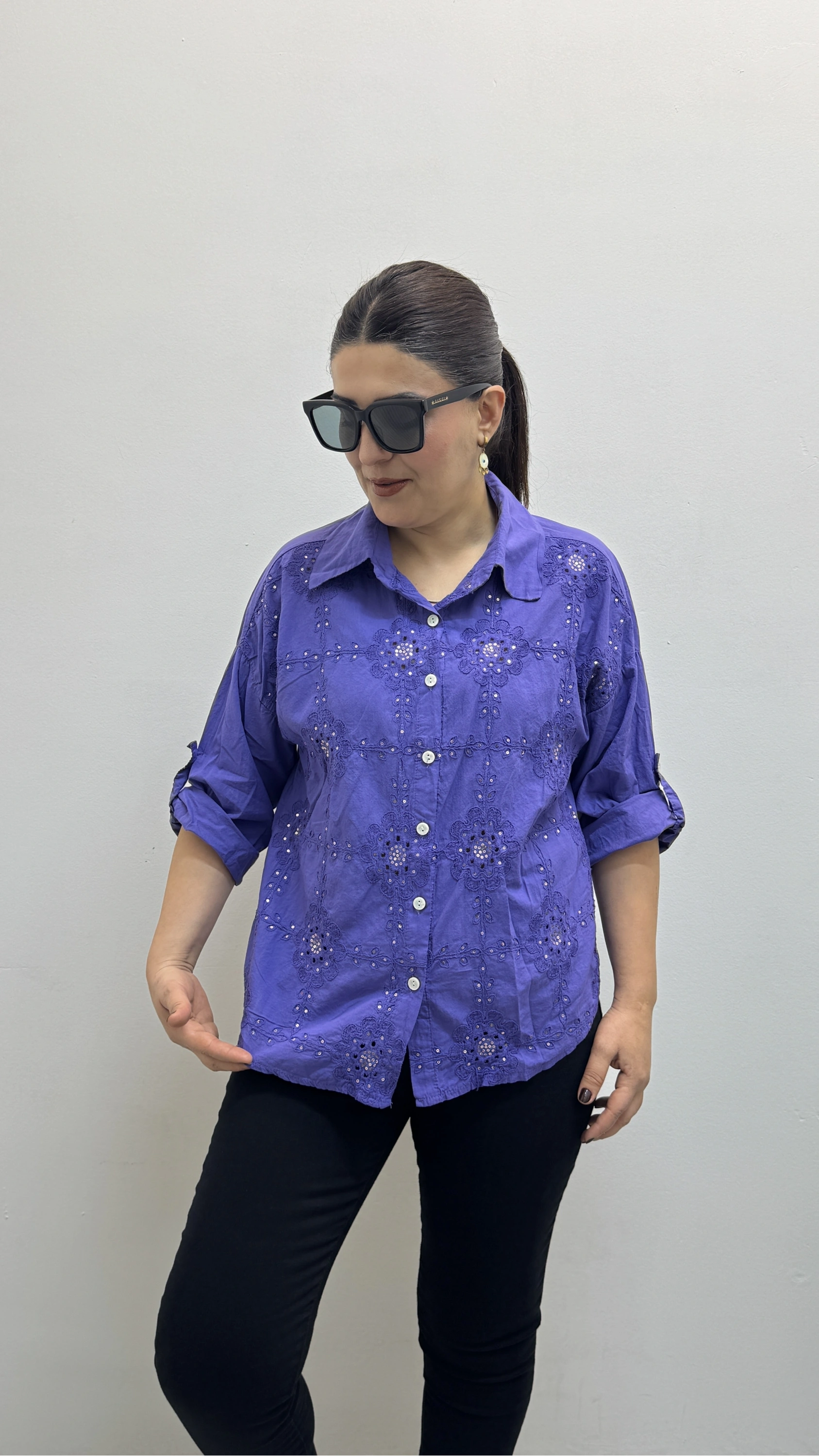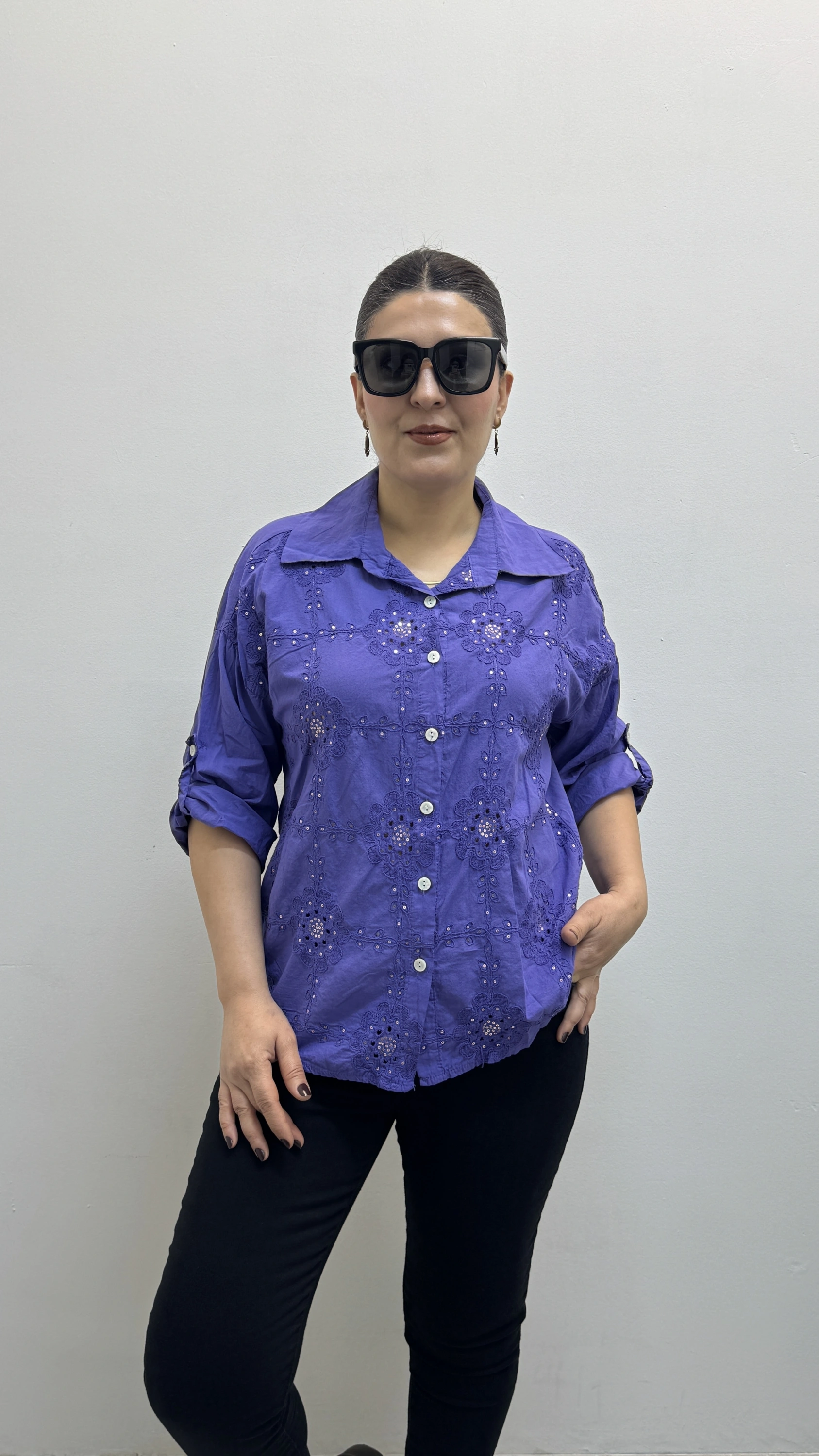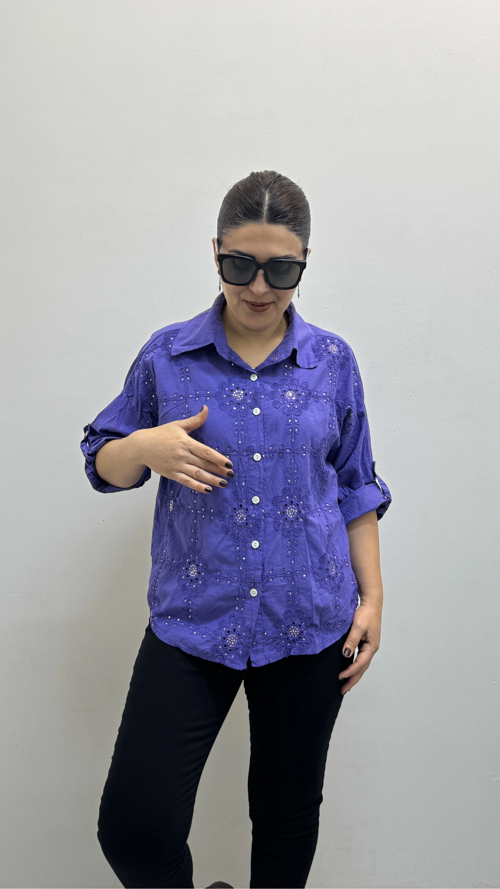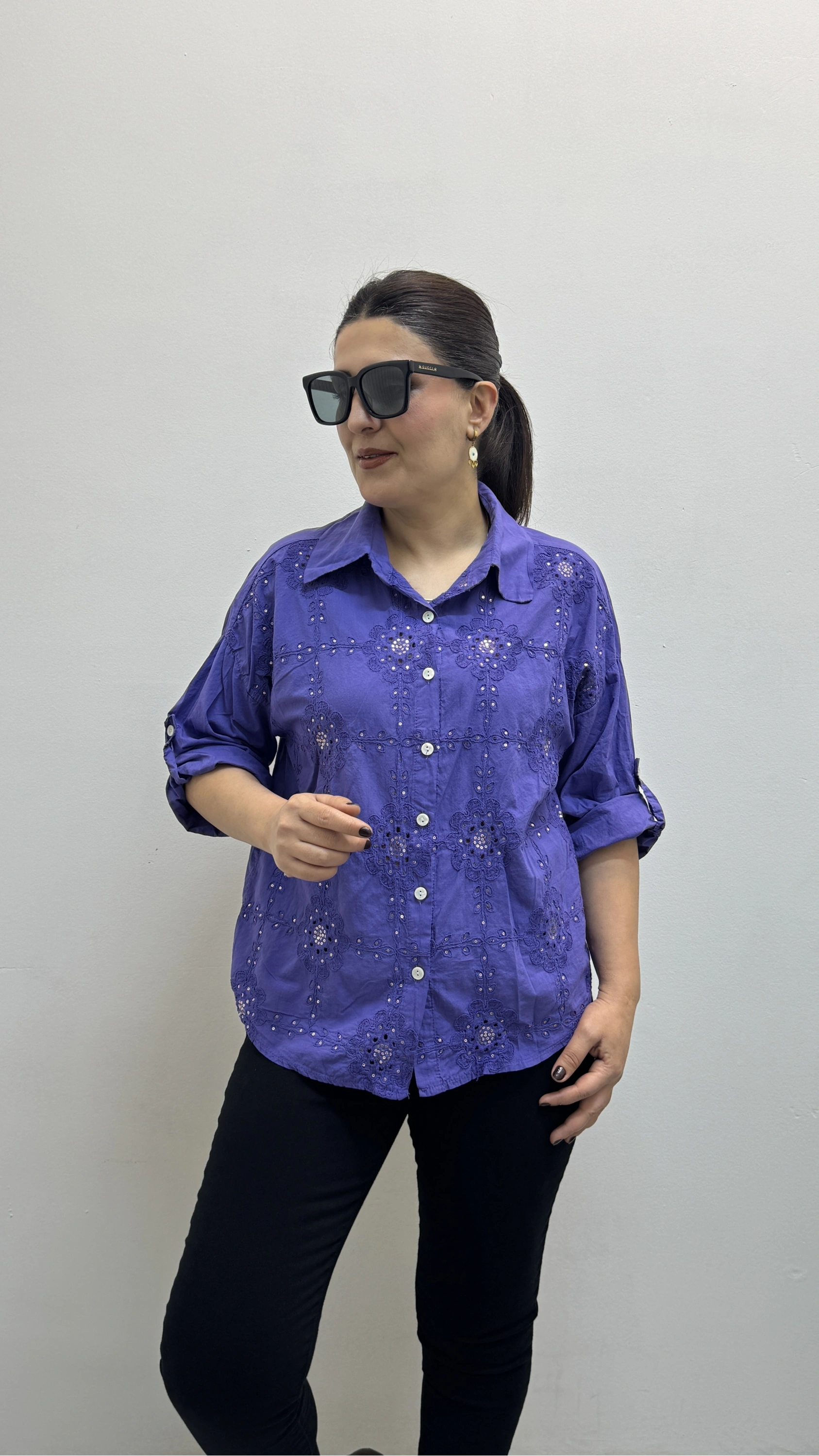 Nakış Ve Pul Payet İşlemeli Yakalı Mor Renk İthal Gömlek