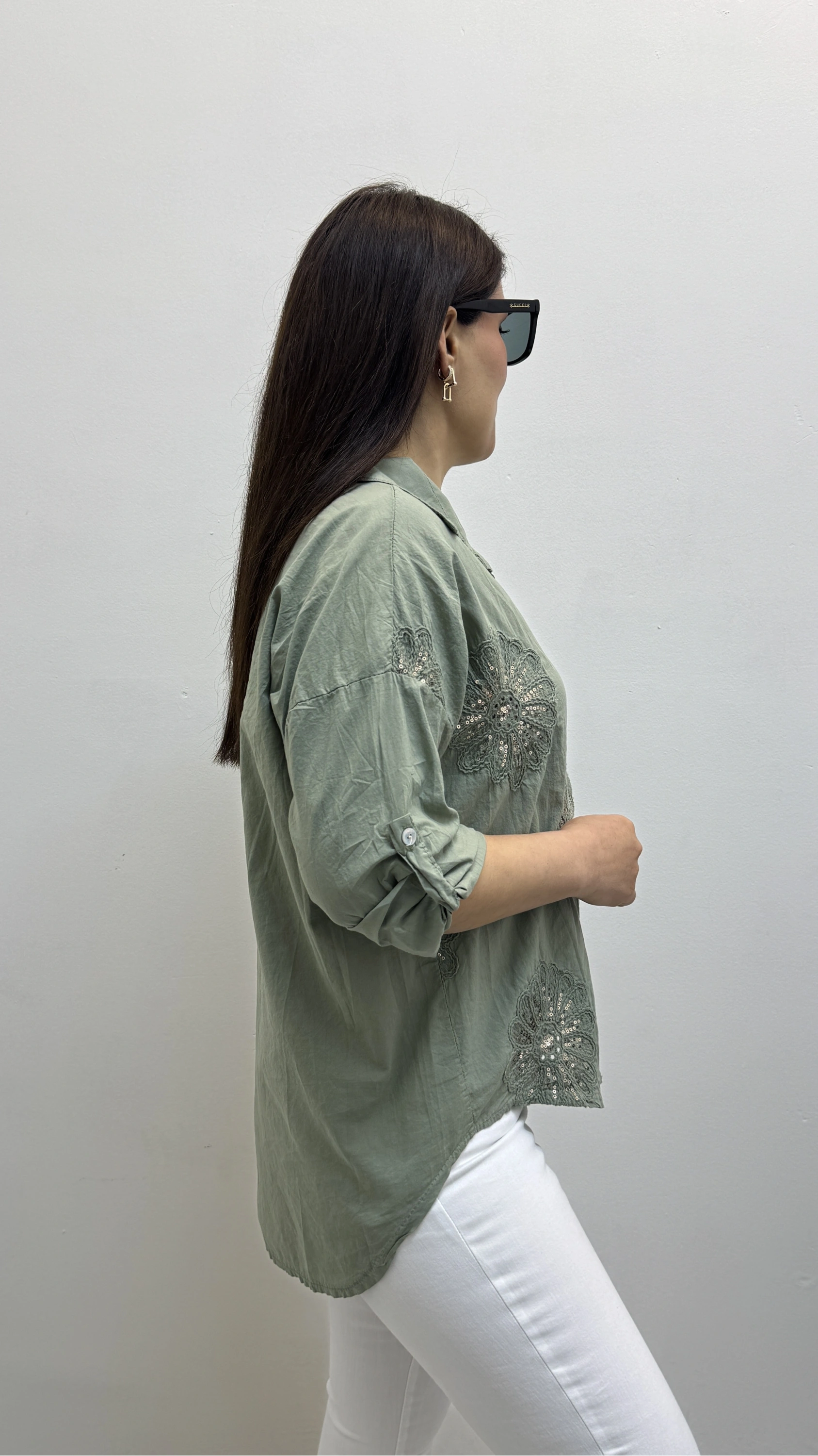 Nakış Ve Pul Payet İşlemeli Yeşil İthal Gömlek