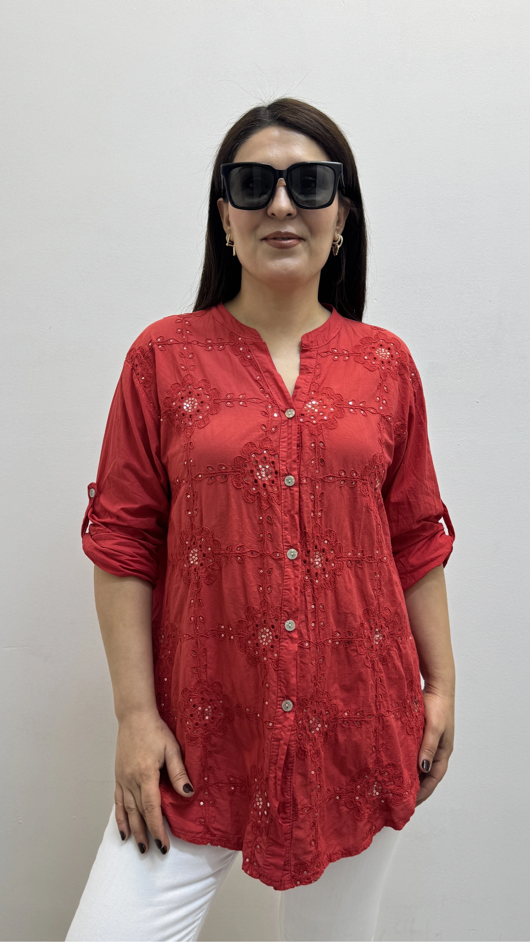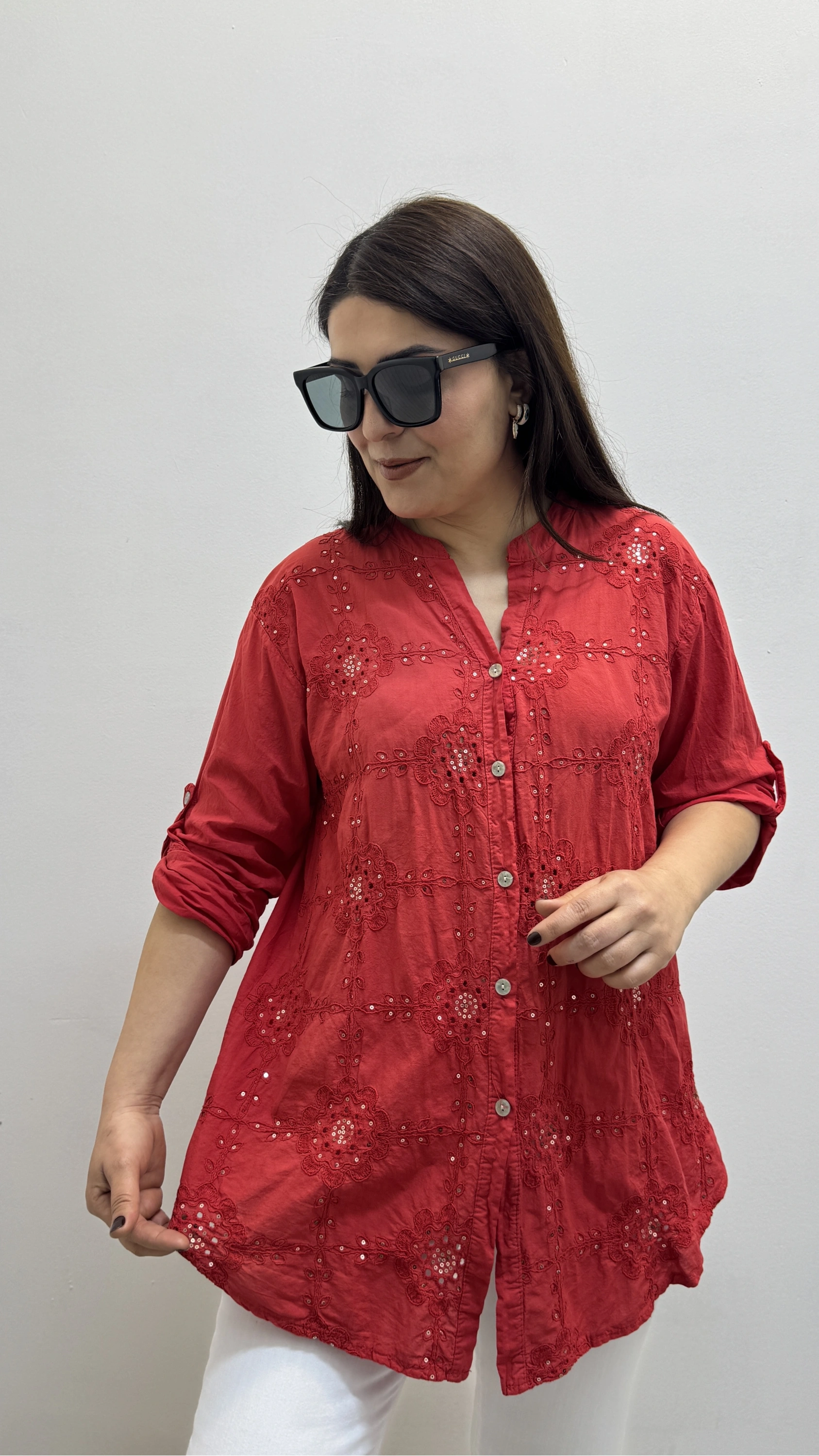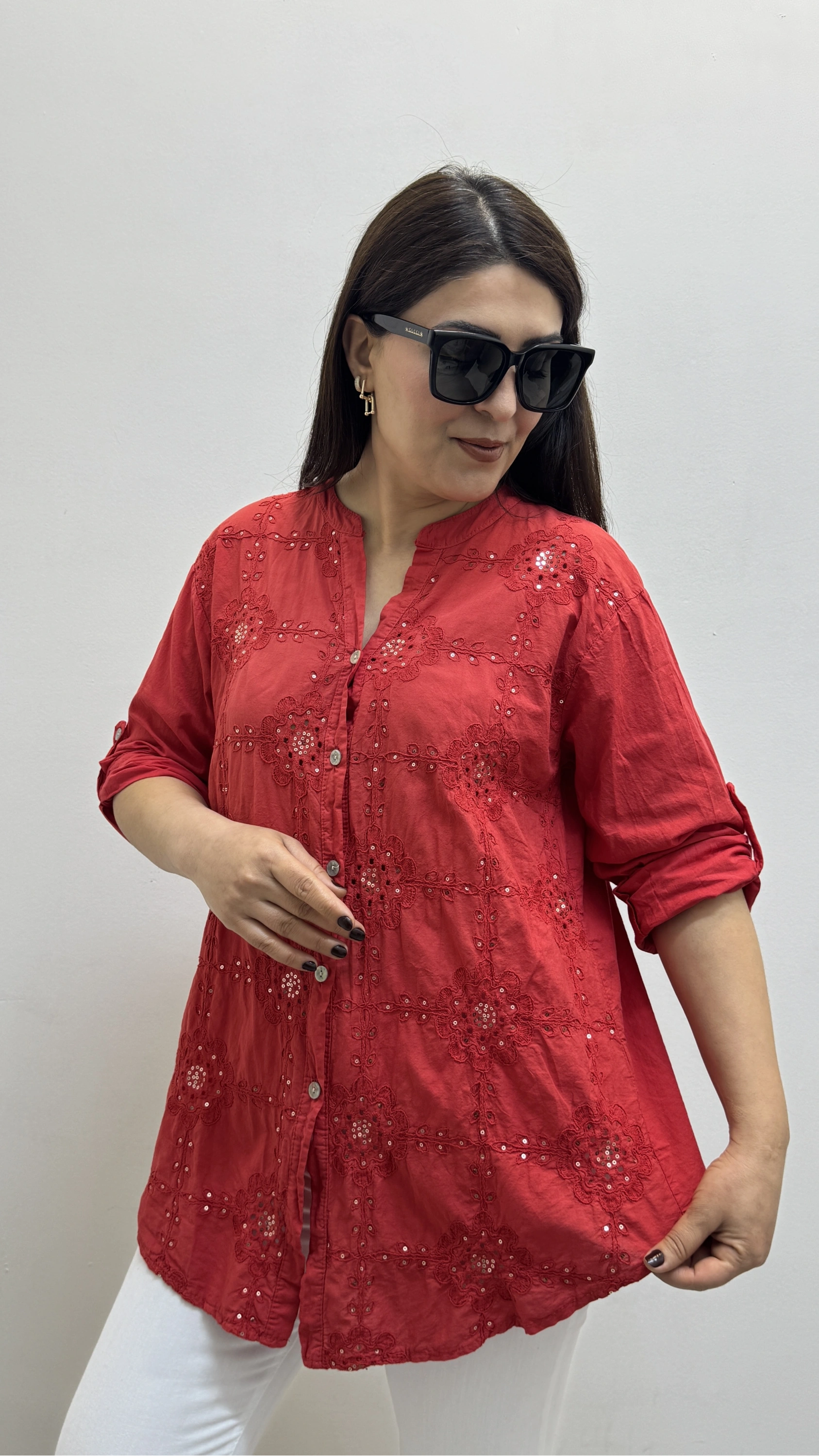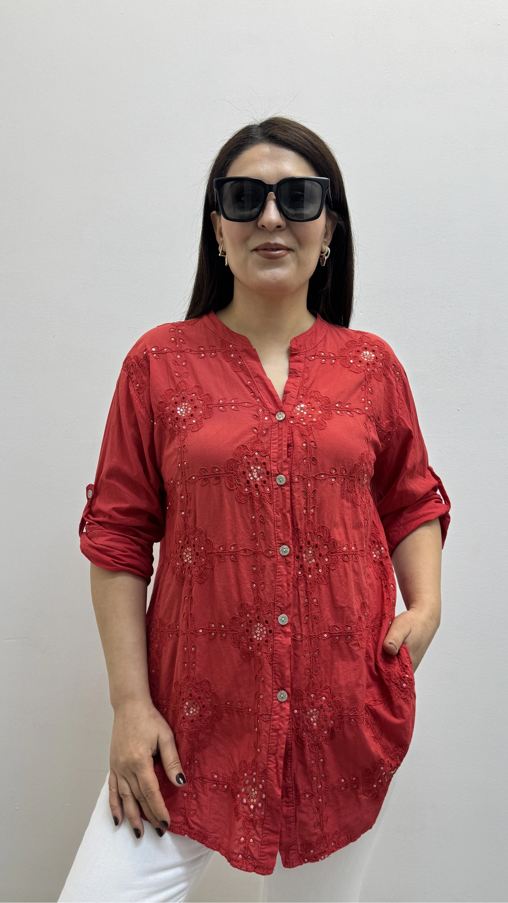Nakışlı Çiçek Desenli Pul Payet İşlemeli Hakim Yaka Kırmızı İthal Gömlek Hakkında