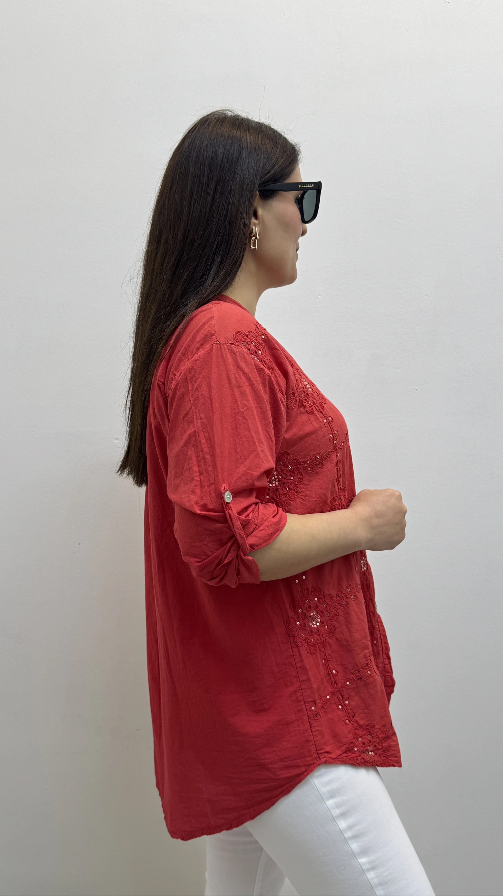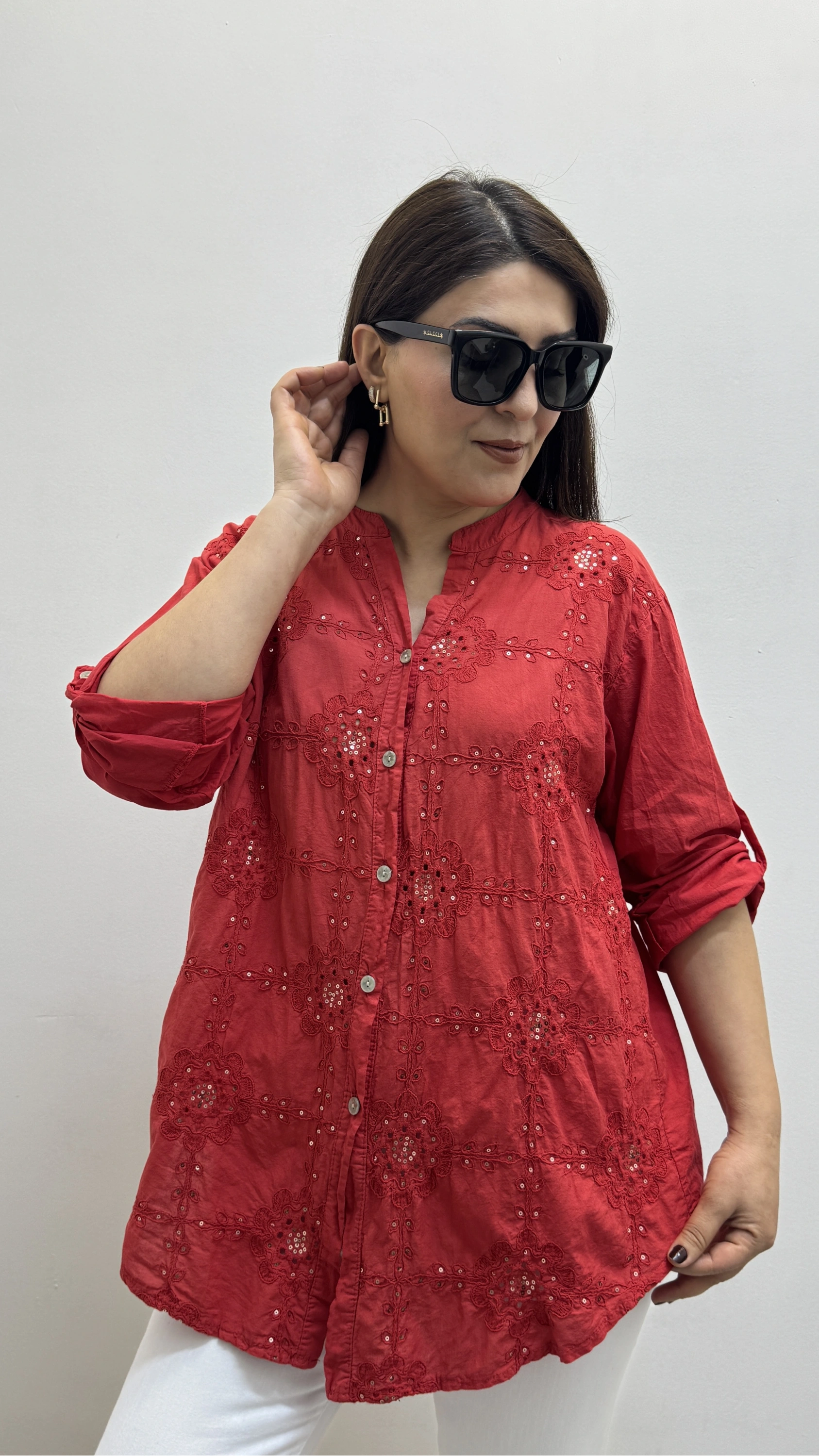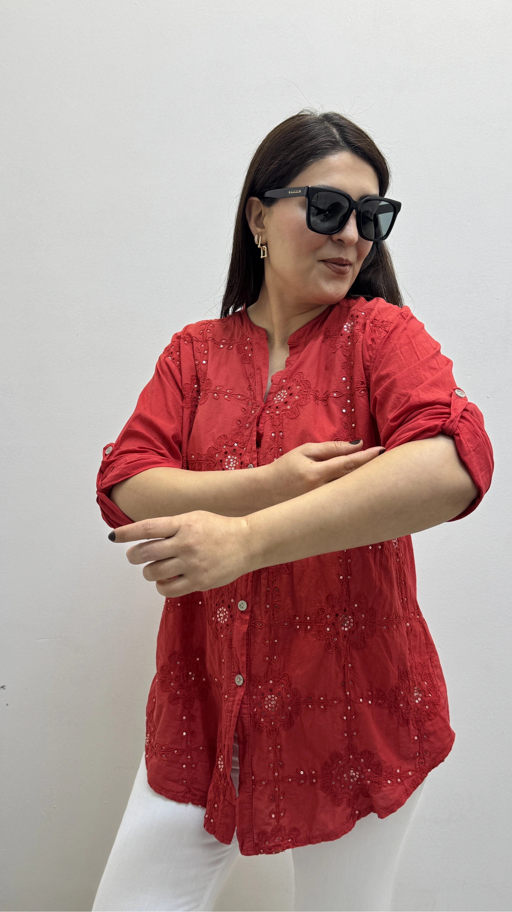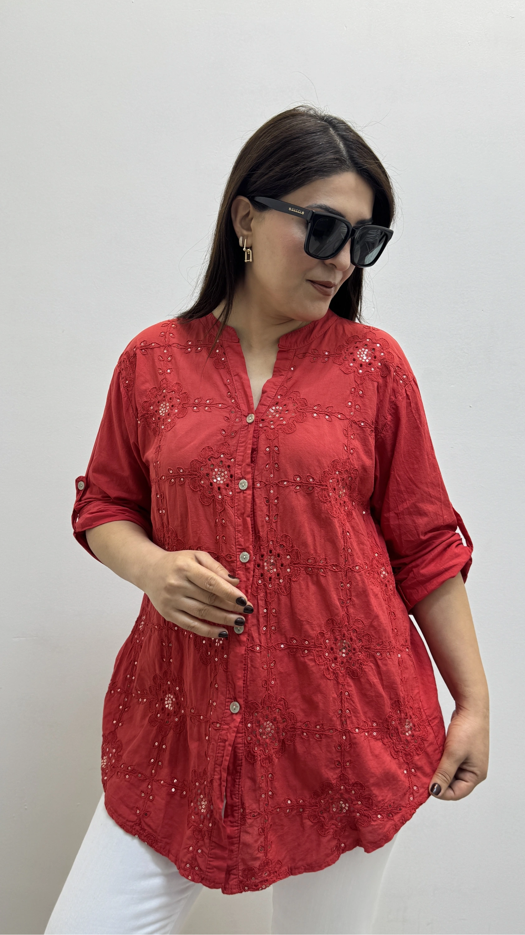 Nakışlı Çiçek Desenli Pul Payet İşlemeli Hakim Yaka Kırmızı İthal Gömlek Hakkında