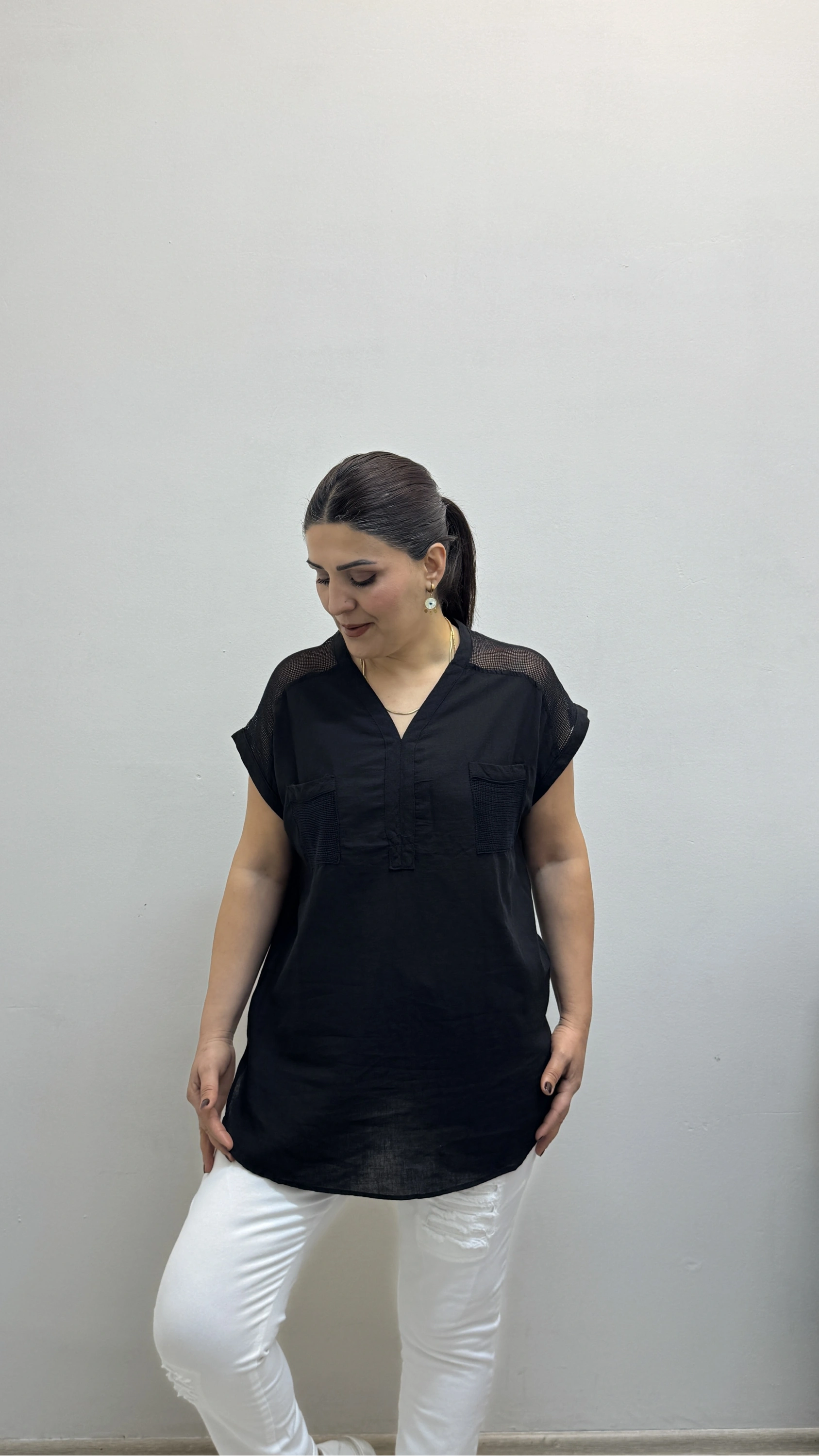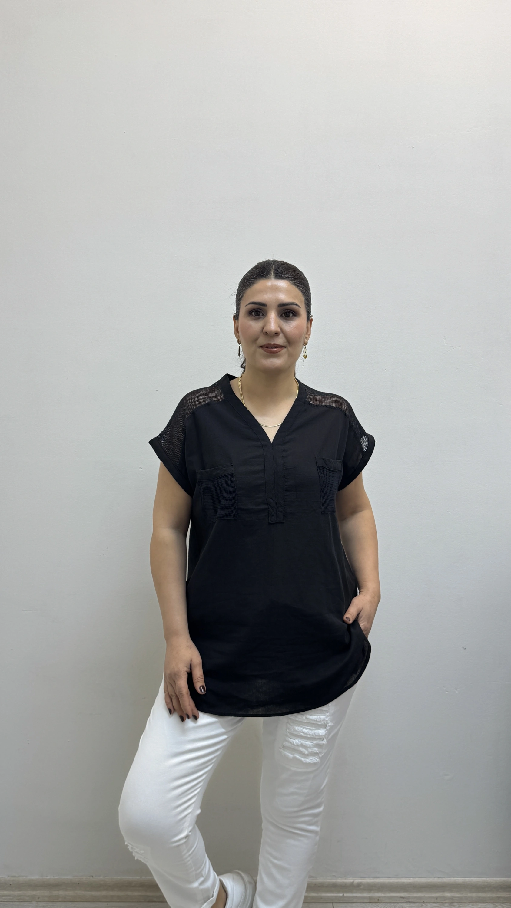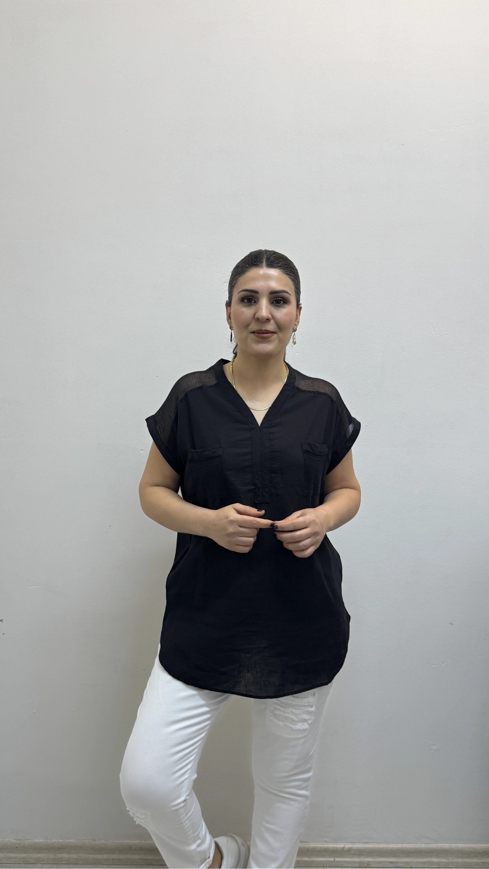 Omuz File Detaylı File Cepli Siyah Renk Pamuklu Bluz Hakkında