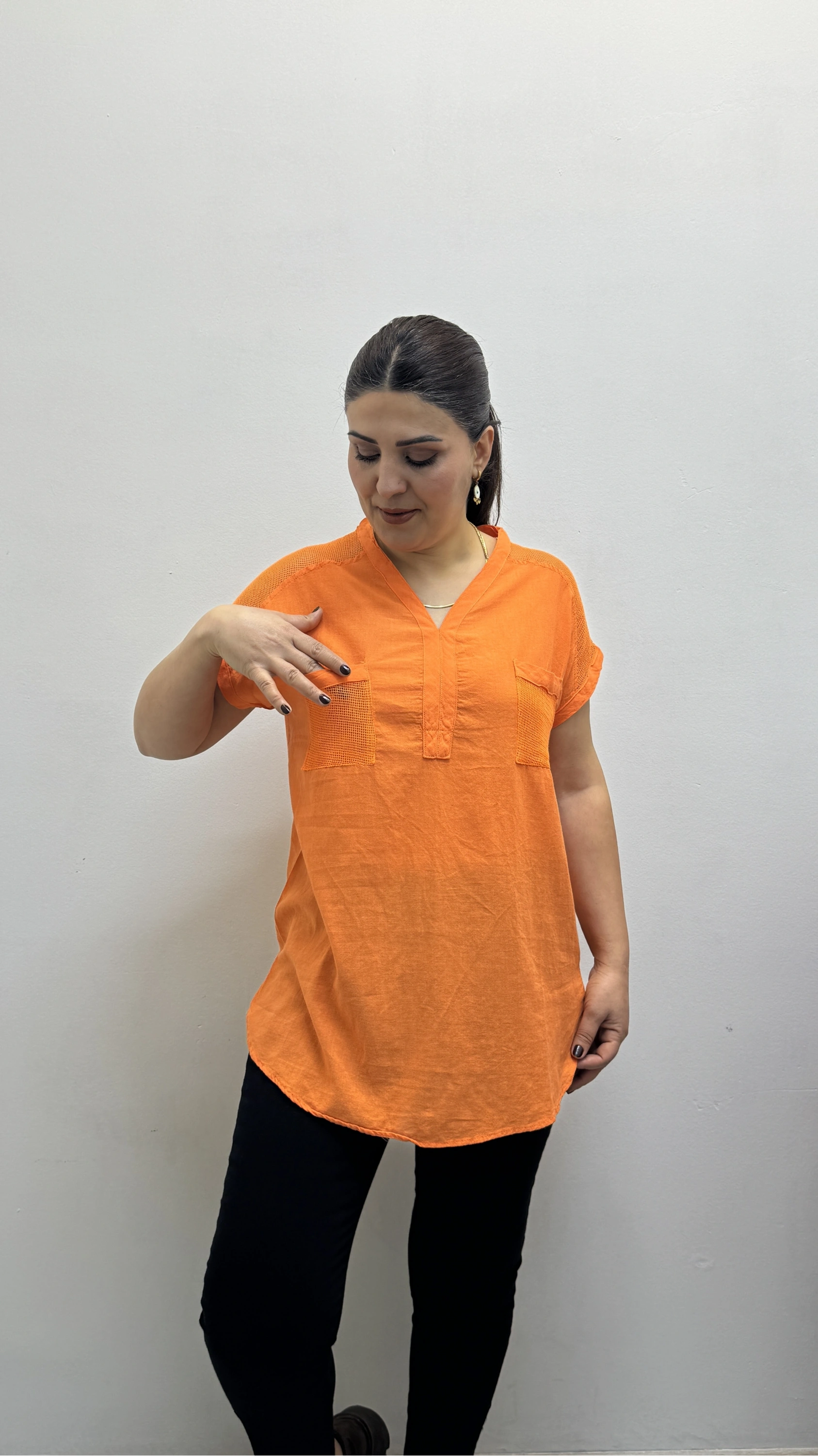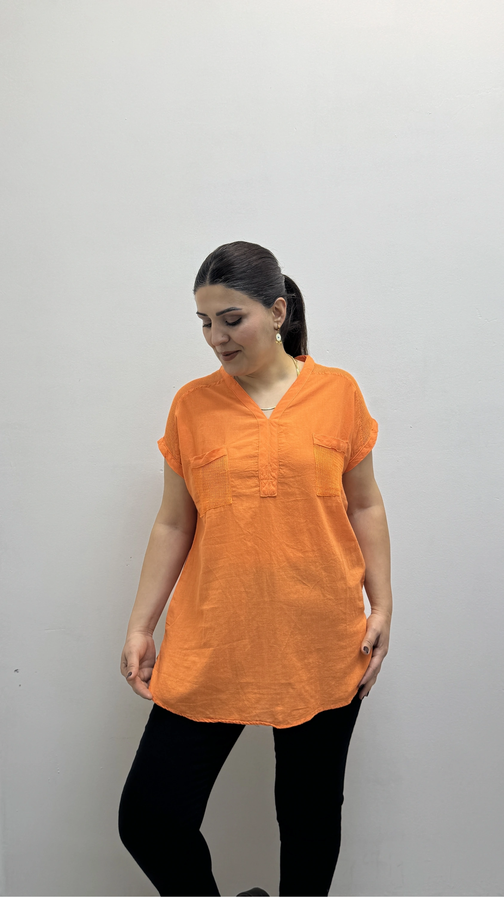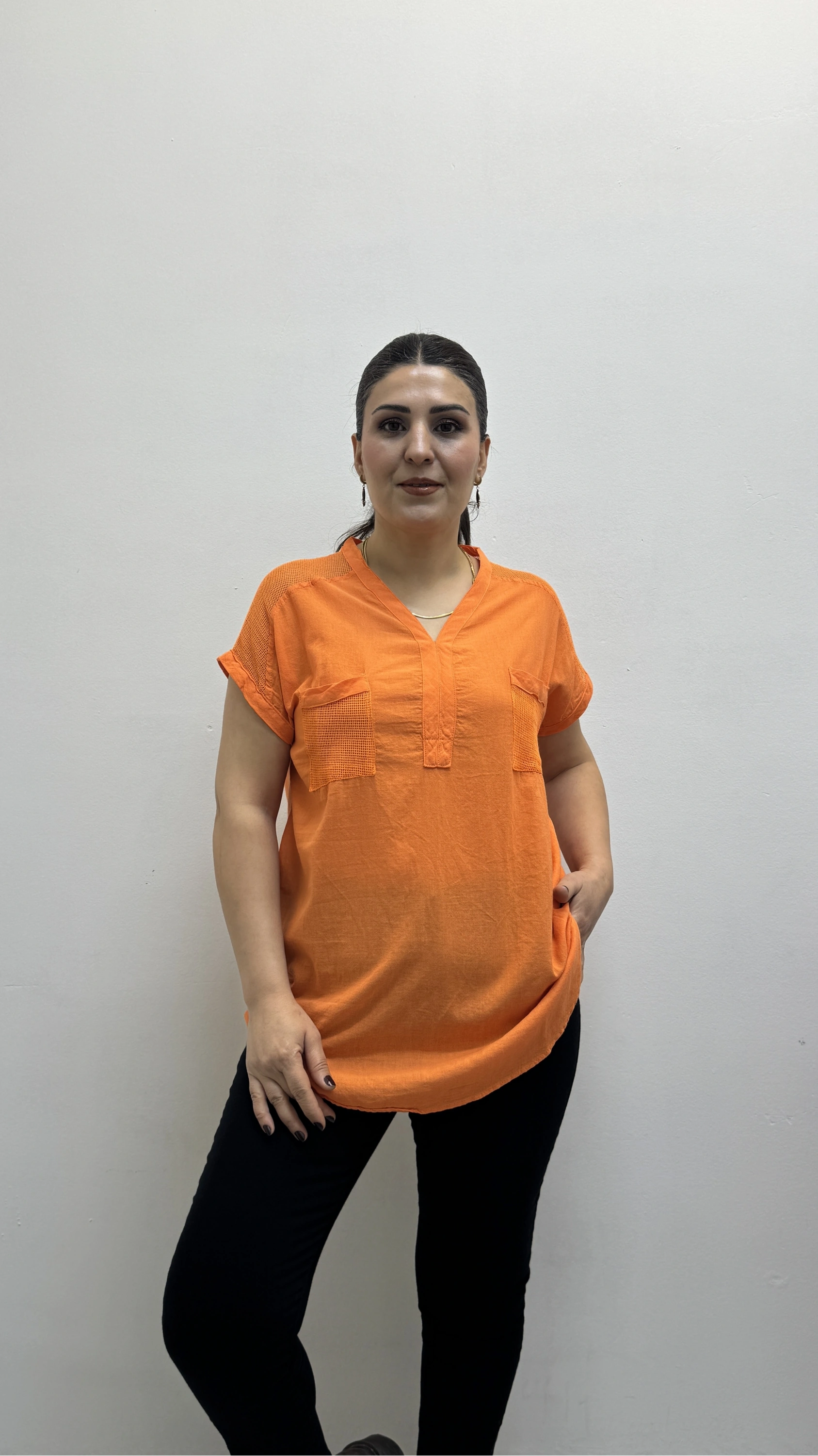 Omuz File Detaylı File Cepli Turuncu Pamuklu Bluz Hakkında